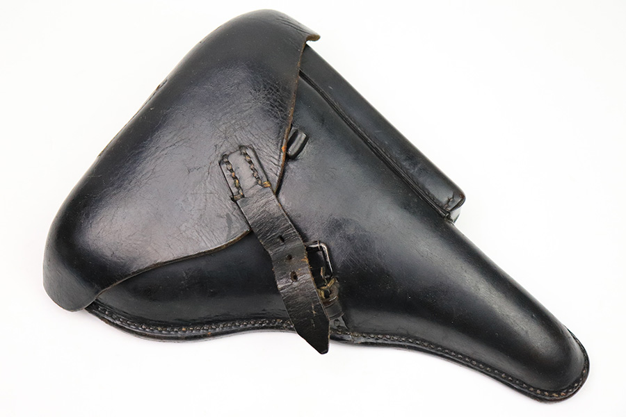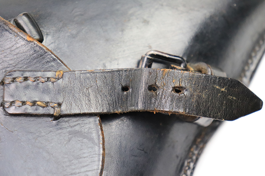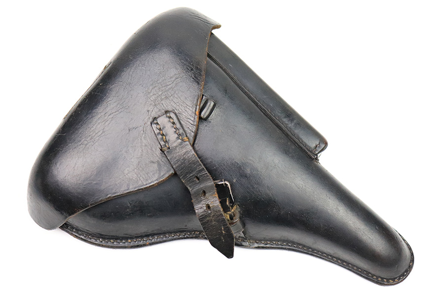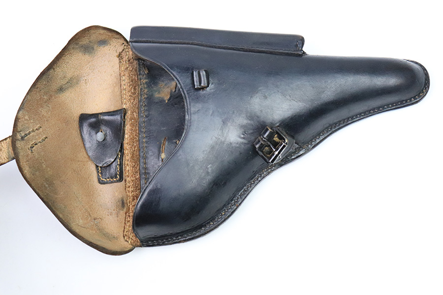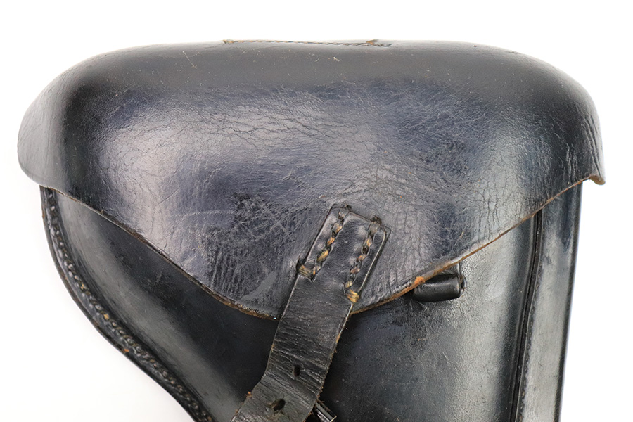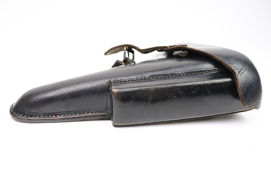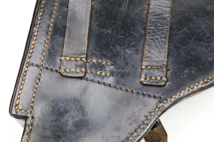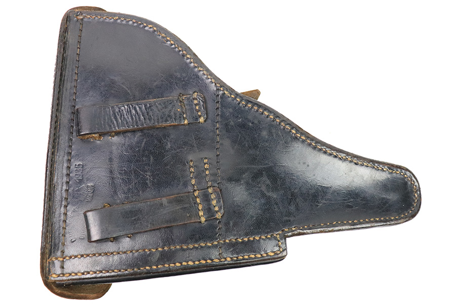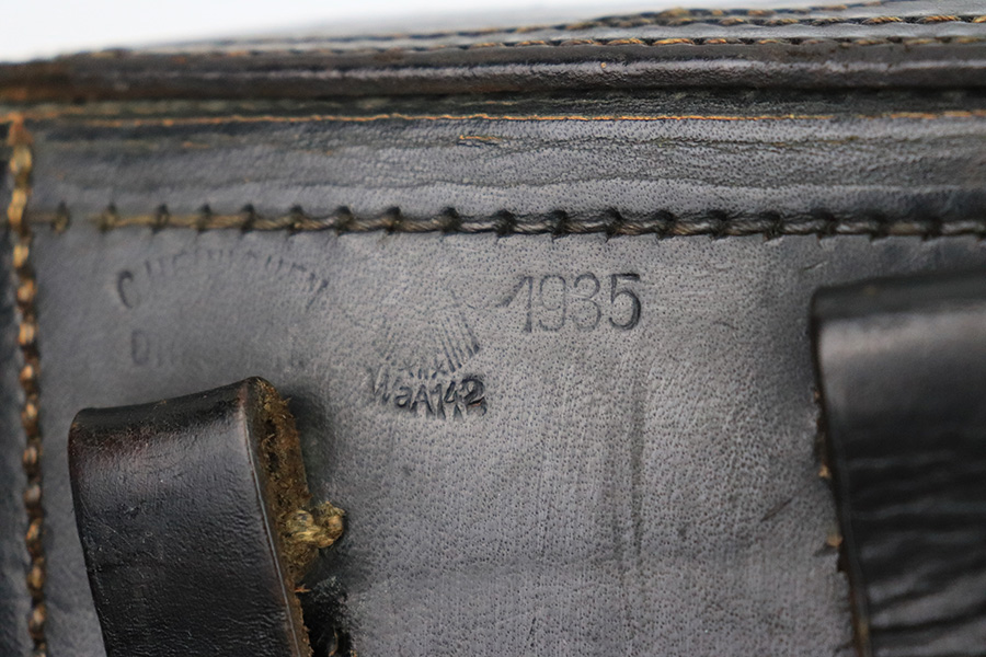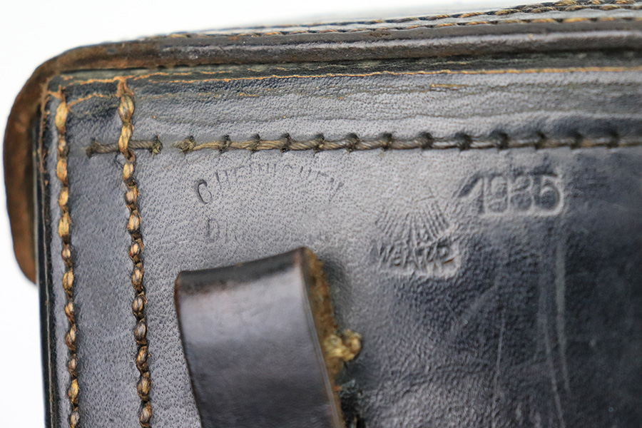12/1/22 – This is an ultra-rare 1935 dated Luger holster from early/pre WW2. The 1935 “G Date” Luger holsters are by far the most scarce year for WW2 Luger holsters. Not many were made as there was a glut of 1934 “K Date” holsters made the year prior. This example is the nicest we’ve offered, in excellent overall condition. Comes straight from Tom’s (the owner’s) collection. The black leather is strong with mild pliability and some minor exterior wrinkling. No cracking or major leather issues. Clean interior leather. The stitching is all original and tight as well. Maker stamped, clearly dated, and waffen proof stamped on the back leather. A very hard to find example that will be very hard to ever upgrade!