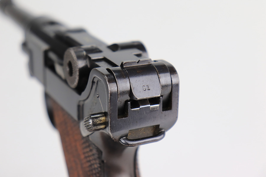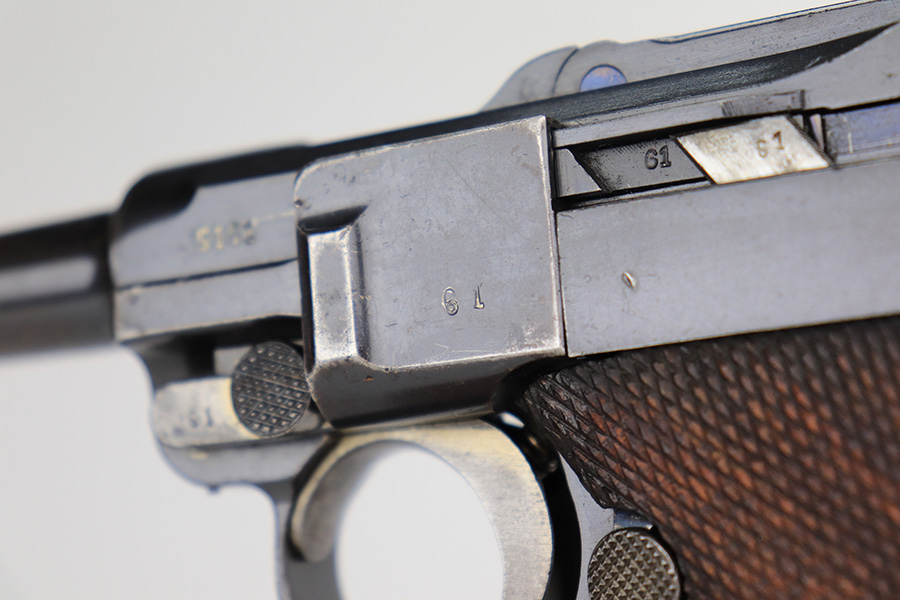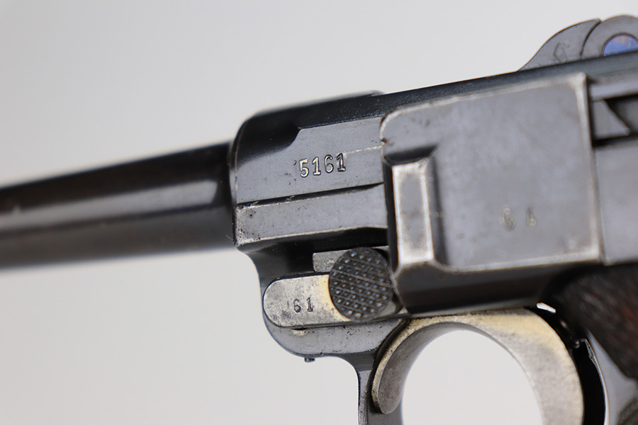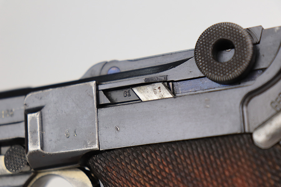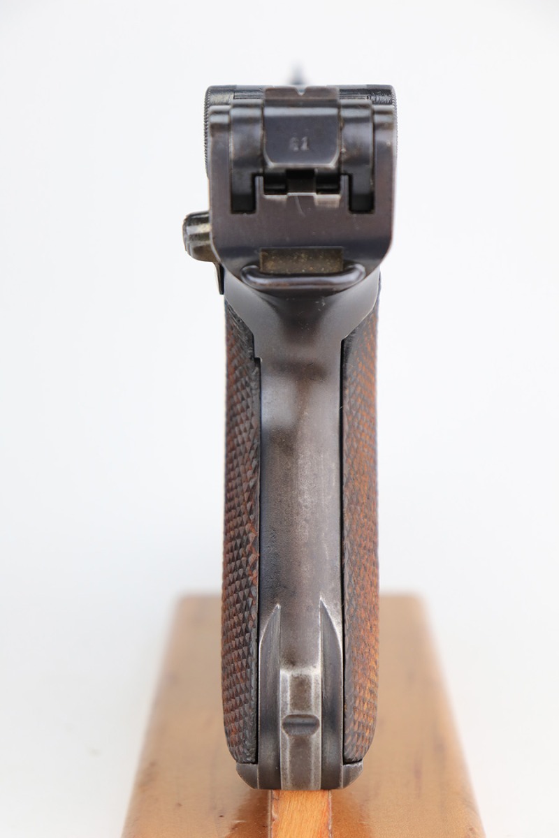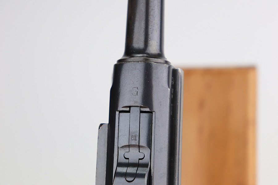 1/12/23 – This is a very nice example of a “G Date” Mauser Luger issued to the Nazi military in 1935. It is all matching and has the proper G Date military acceptance proofs. It has retained about 93-94% of its original finish. There is minor wear around the muzzle, on the side plate, and on the side rails. While there isn’t a lot of actual finish loss, there is dulling on the grip straps and some tiny dings / handling marks on the barrel and on the left side of the frame. Fitted with minty matching-numbered wood grips and comes with a mismatched “Eagle 63” marked magazine. Excellent, shiny bore with strong rifling.