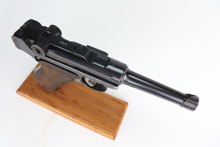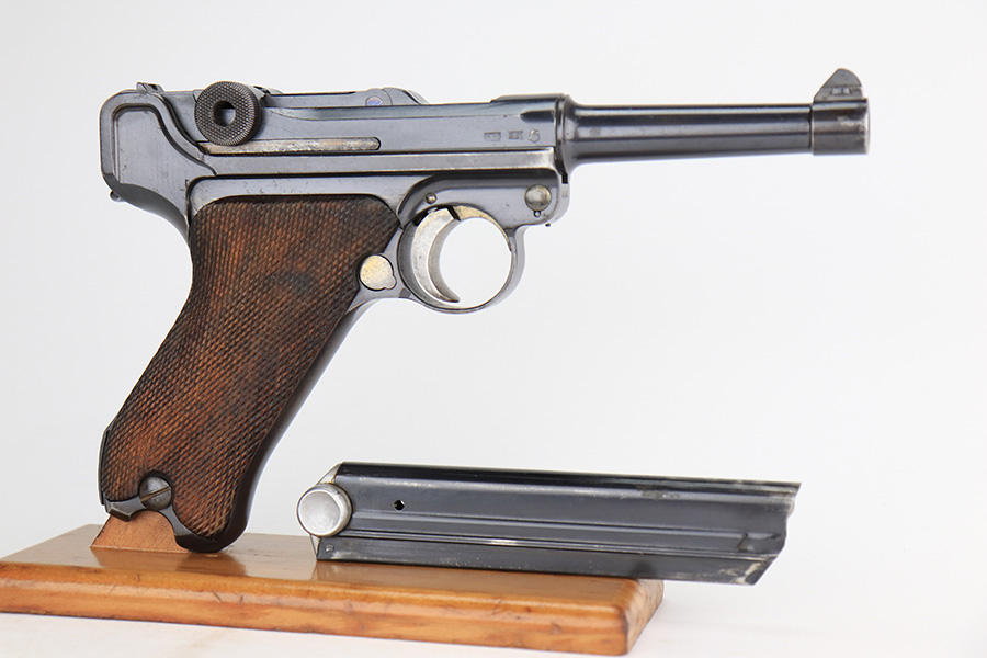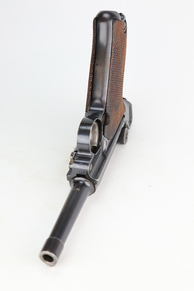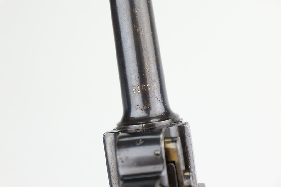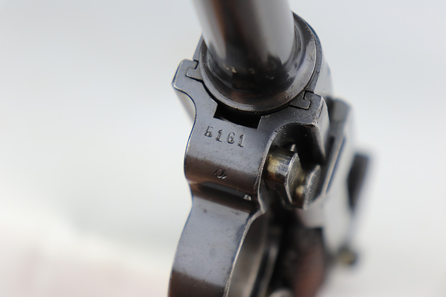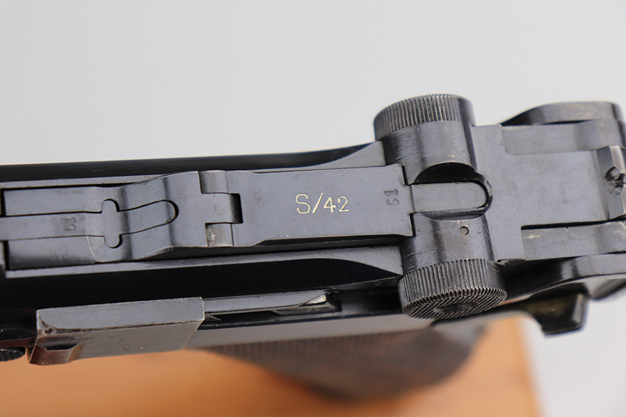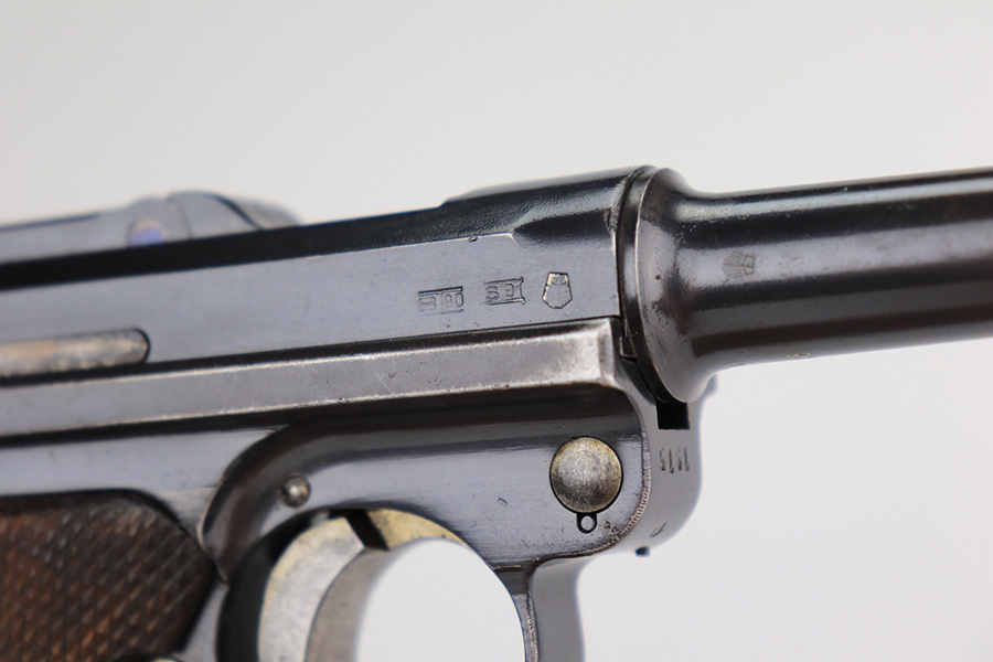 1/12/23 – This is a very nice example of a “G Date” Mauser Luger issued to the Nazi military in 1935. It is all matching and has the proper G Date military acceptance proofs. It has retained about 93-94% of its original finish. There is minor wear around the muzzle, on the side plate, and on the side rails. While there isn’t a lot of actual finish loss, there is dulling on the grip straps and some tiny dings / handling marks on the barrel and on the left side of the frame. Fitted with minty matching-numbered wood grips and comes with a mismatched “Eagle 63” marked magazine. Excellent, shiny bore with strong rifling.