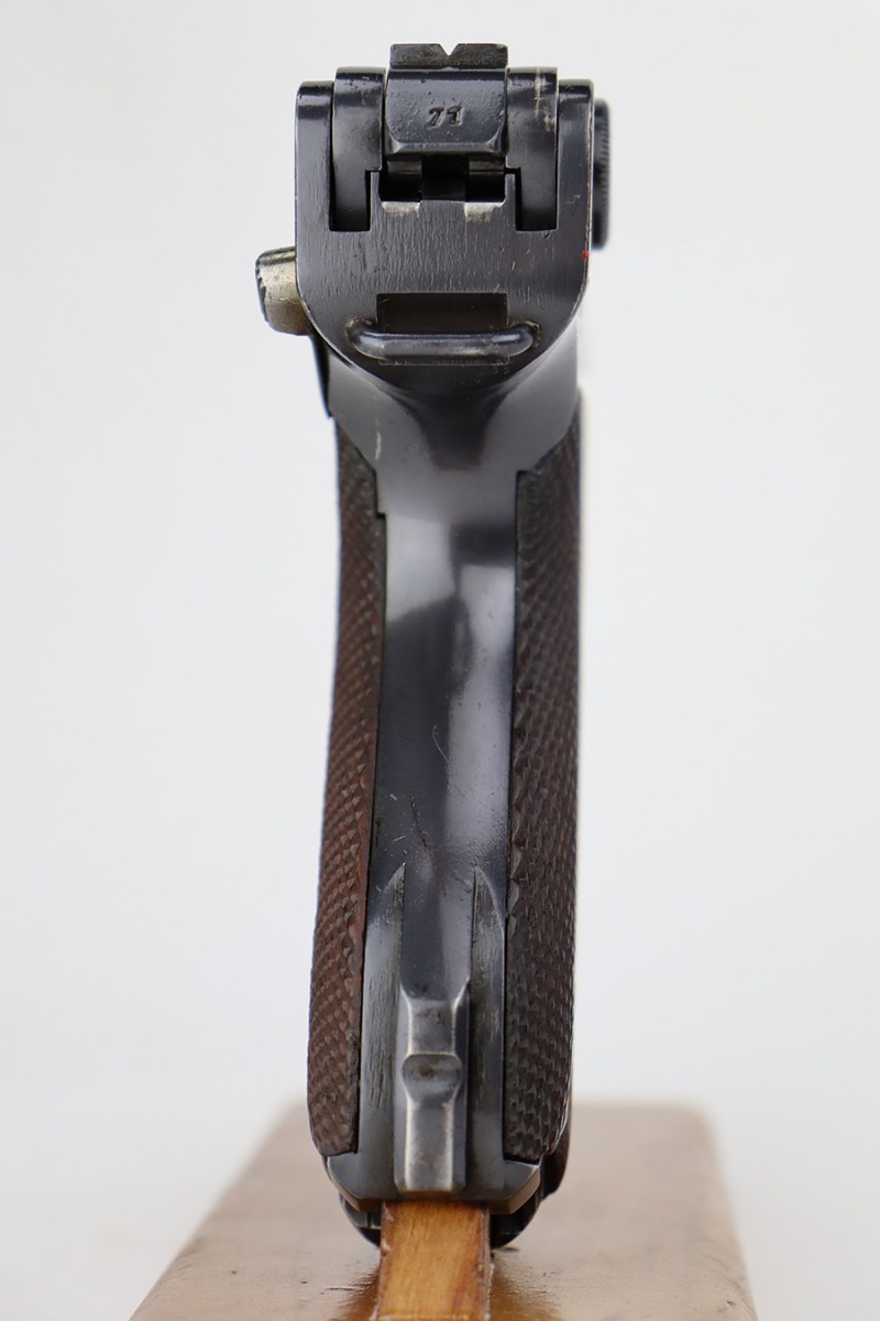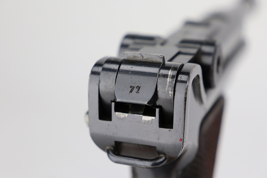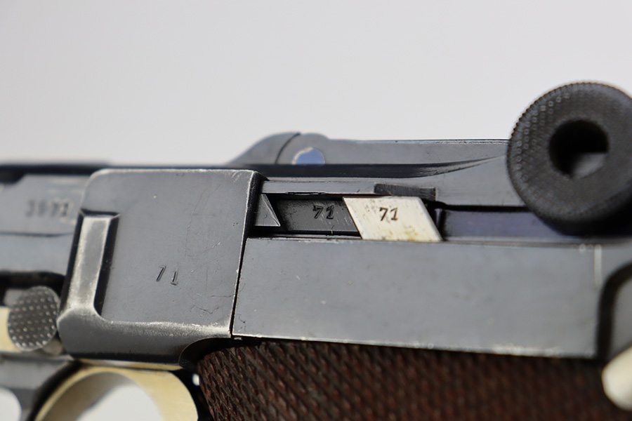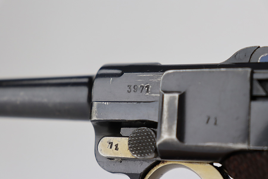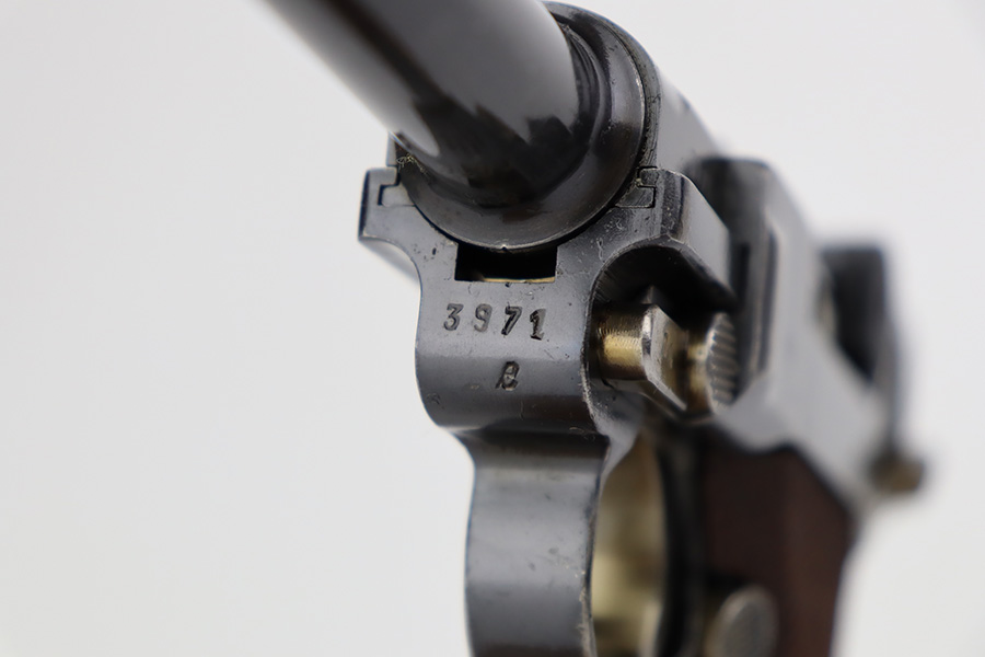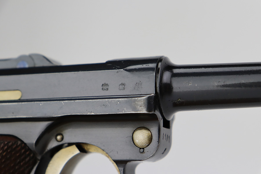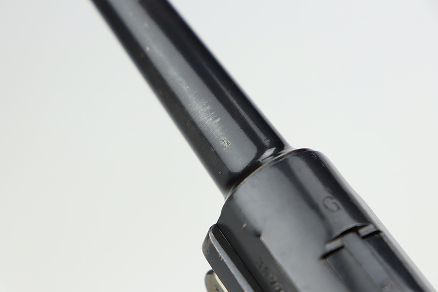 5/6/24 – This is a very nice example of a “G Date” Mauser Luger issued to the Nazi military in 1935. All matching with the proper “Eagle 63” military acceptance proofs. It has retained about 94% of its finish with areas of minor wear around the muzzle, along the left side of the barrel, on the side plate, and on the side rails. Some tiny handling marks on the front strap. Fitted with excellent wood grips – the left is numbered and mismatched, the right is un-numbered. Comes with a mismatched “Eagle 63” proofed magazine. The bore has pretty good rifling, but there is tiny pitting throughout.