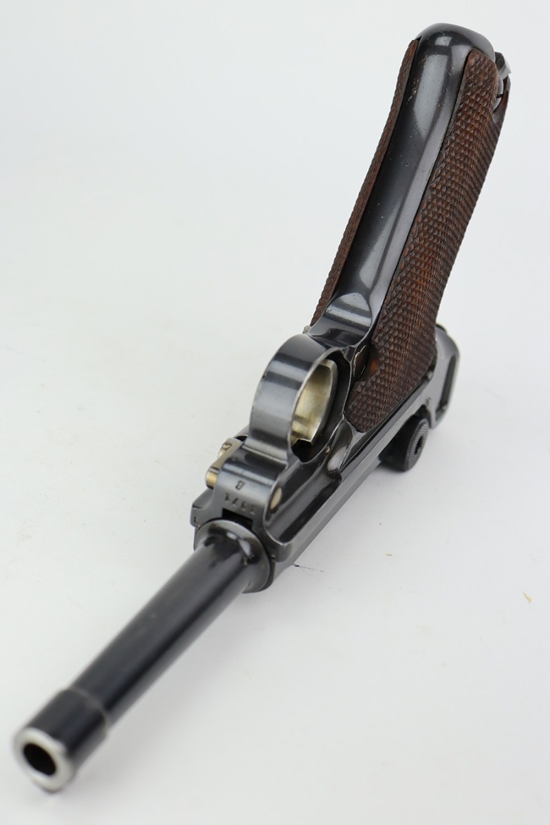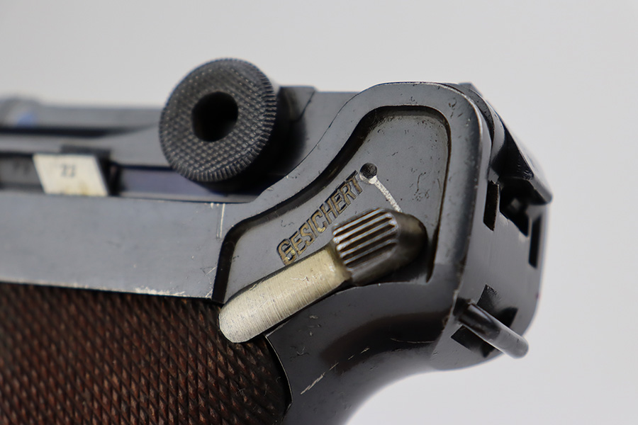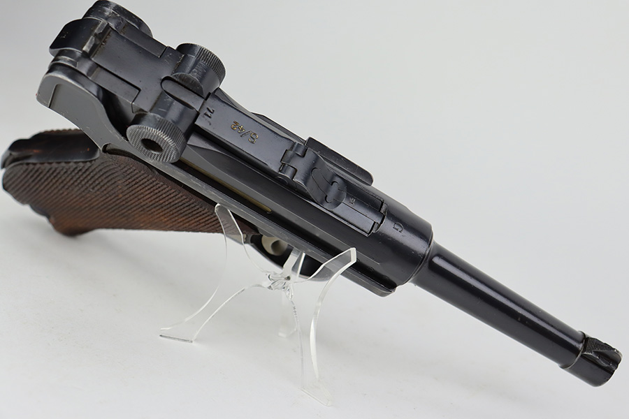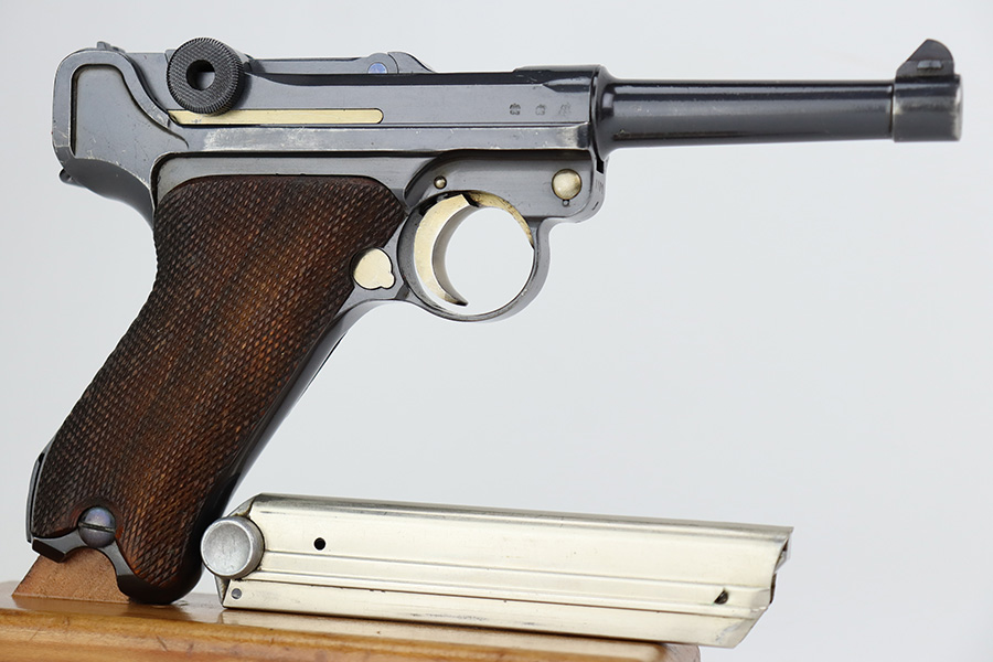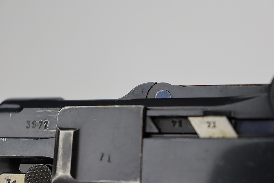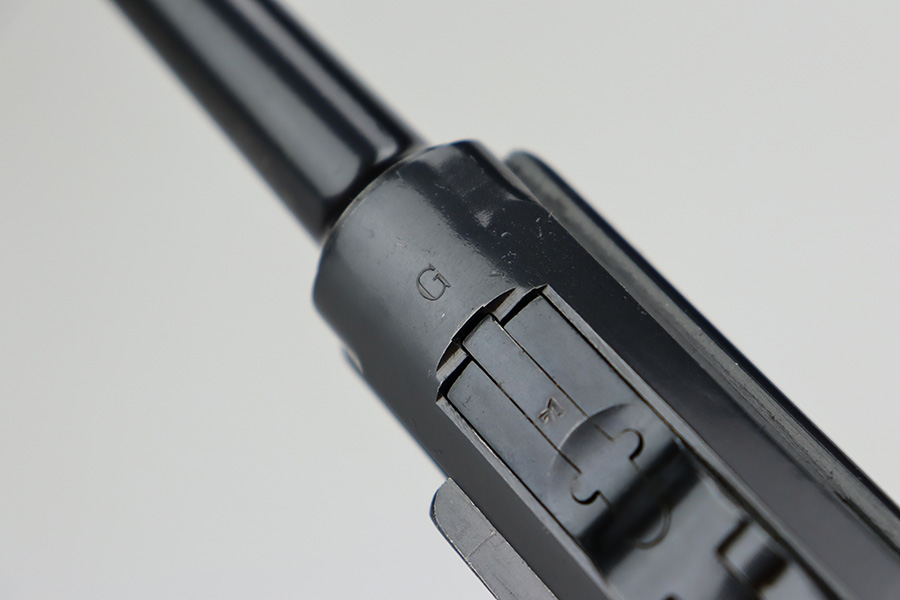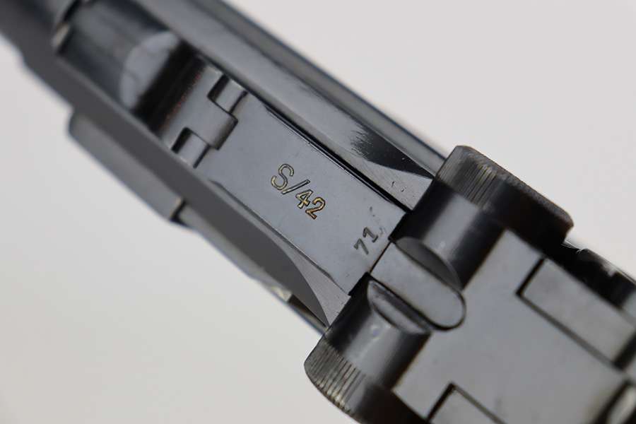 5/6/24 – This is a very nice example of a “G Date” Mauser Luger issued to the Nazi military in 1935. All matching with the proper “Eagle 63” military acceptance proofs. It has retained about 94% of its finish with areas of minor wear around the muzzle, along the left side of the barrel, on the side plate, and on the side rails. Some tiny handling marks on the front strap. Fitted with excellent wood grips – the left is numbered and mismatched, the right is un-numbered. Comes with a mismatched “Eagle 63” proofed magazine. The bore has pretty good rifling, but there is tiny pitting throughout.