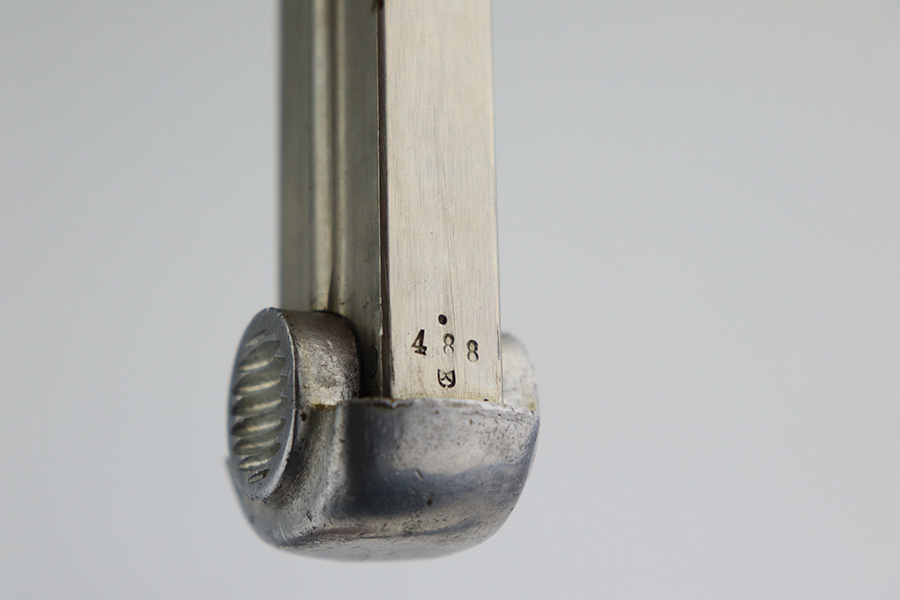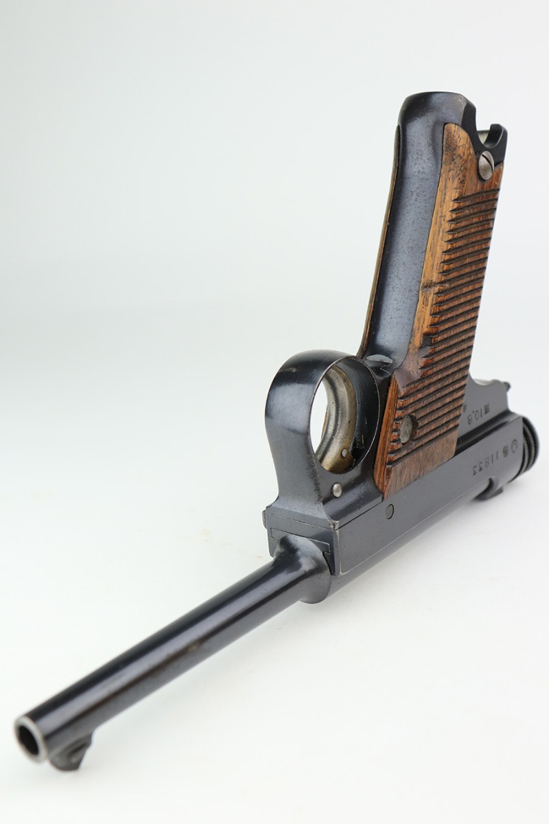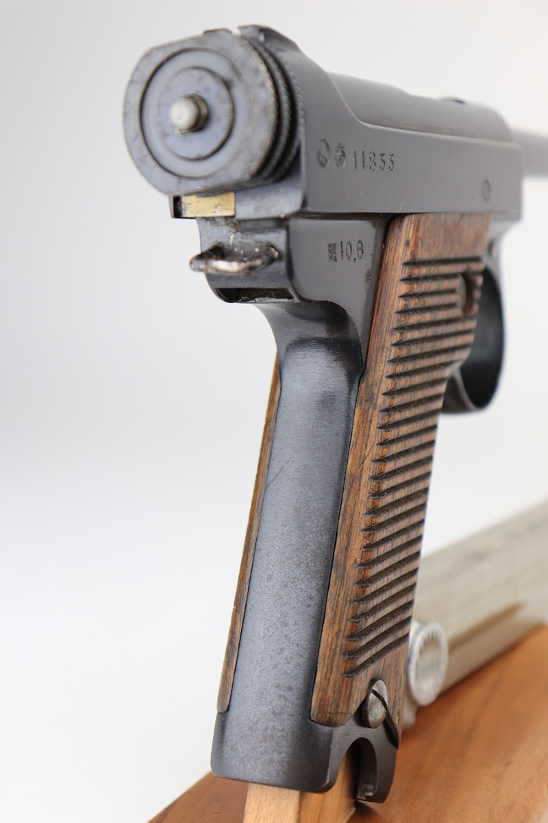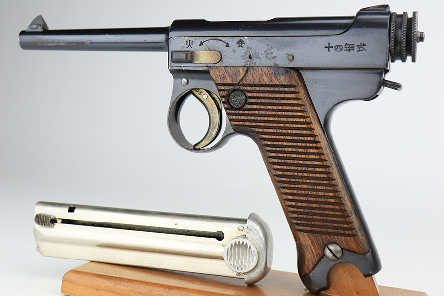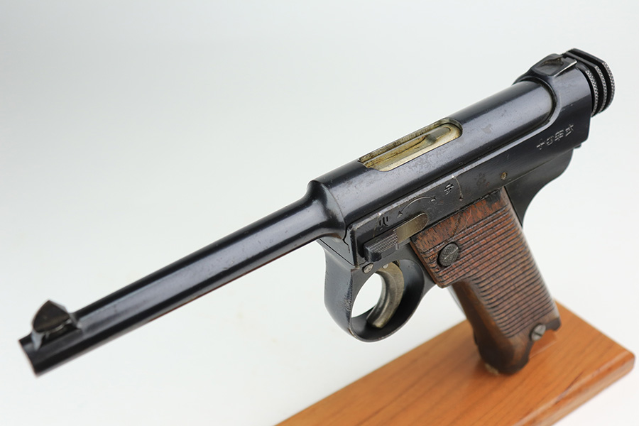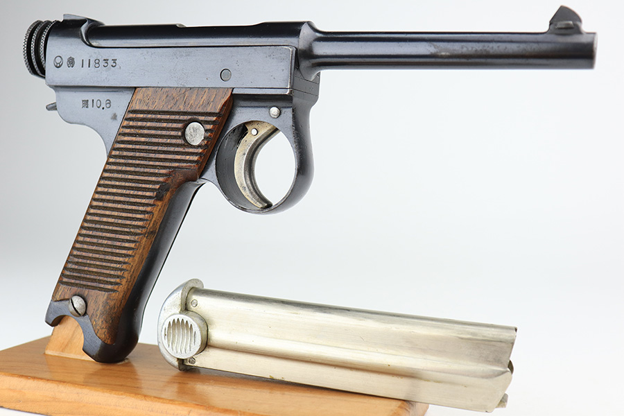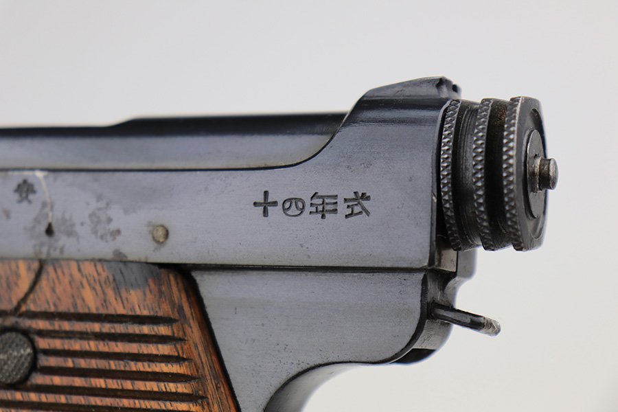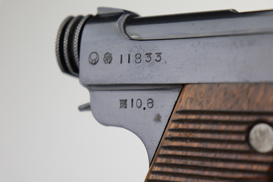4/7/22 – This is an excellent example of a Nambu Type 14 issued to the Japanese military in June of 1935. The gun is all matching and has retained about 97% of its finish. There is some light spotty wear along the left side of the barrel and one small spot of wear on the underside of the trigger guard. While there is very little actual finish loss, there are areas of tiny freckling throughout, most noticeable on the left side of the slide and on both grip straps. Comes with very nice wood grips that are hand-numbered on the inside to match the gun. Also comes with a period-correct magazine that does not match the gun. Excellent shiny bore with strong rifling. There is some dark discoloration at the tip of the safety lever. This may have been touched up or just be oxidation – we can’t say for sure.