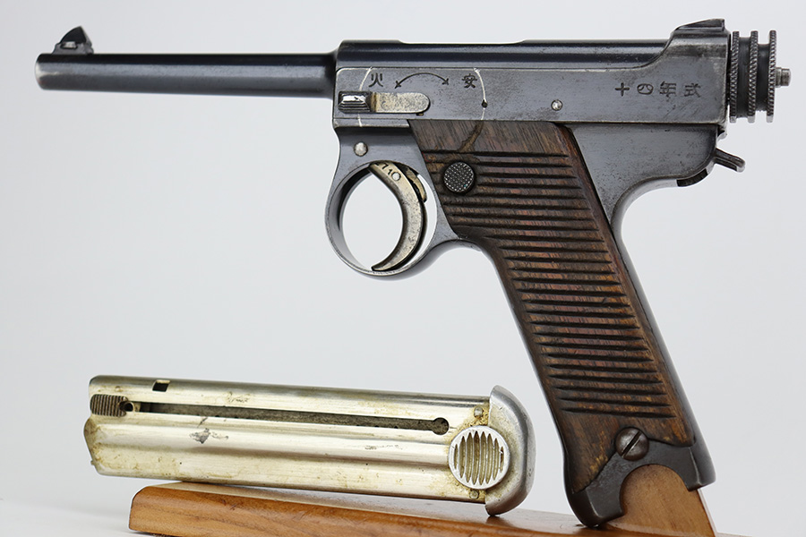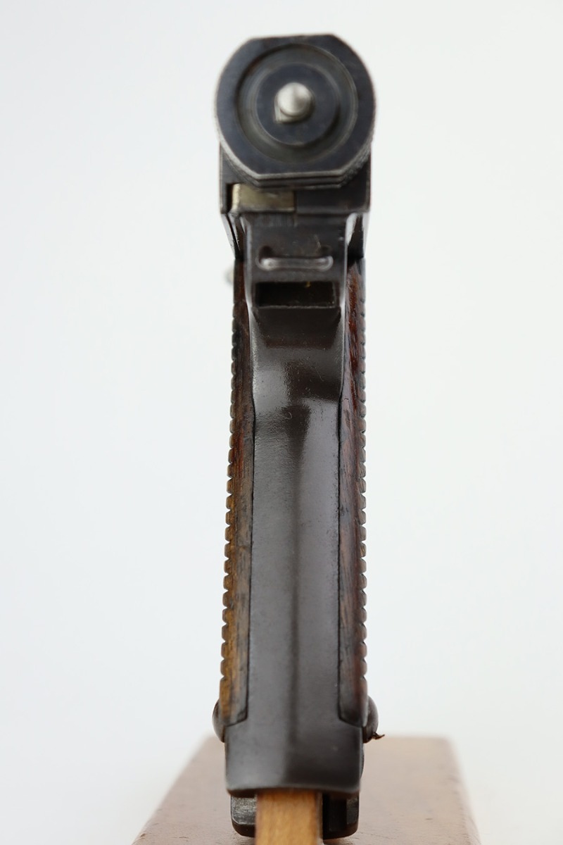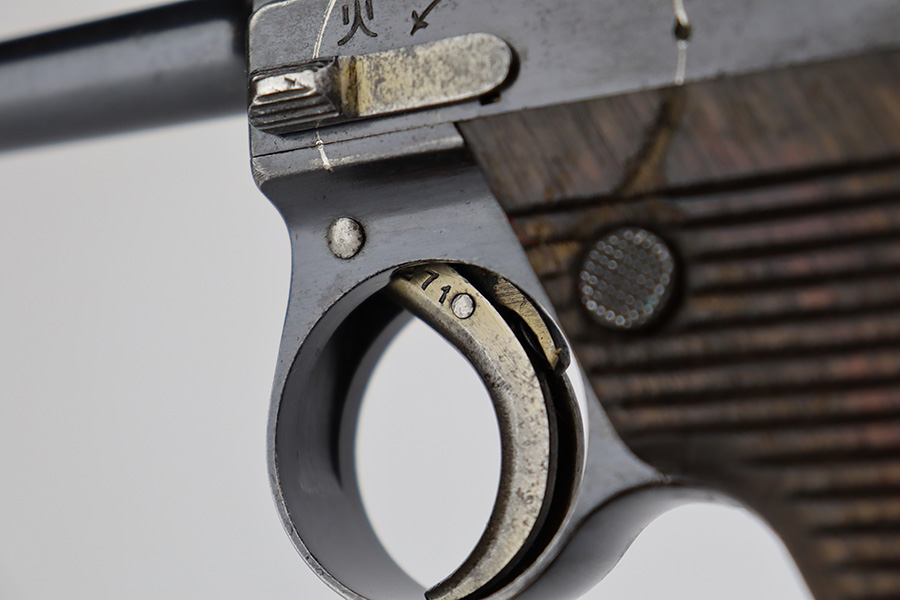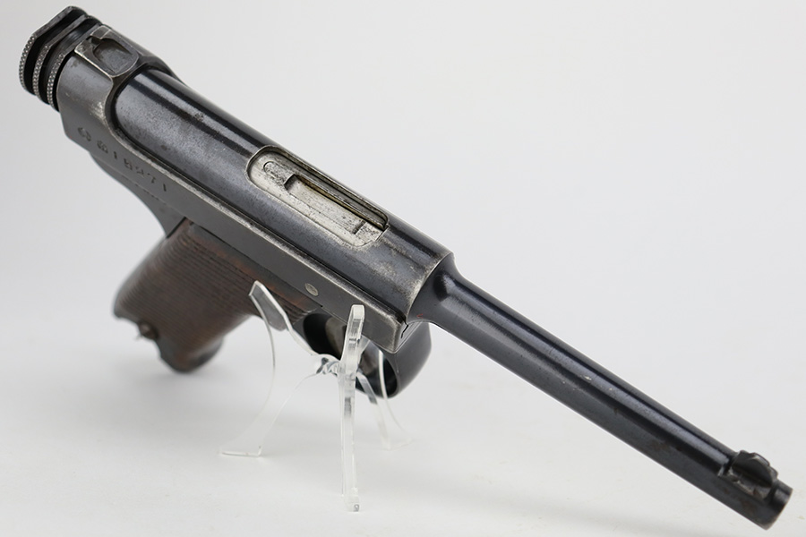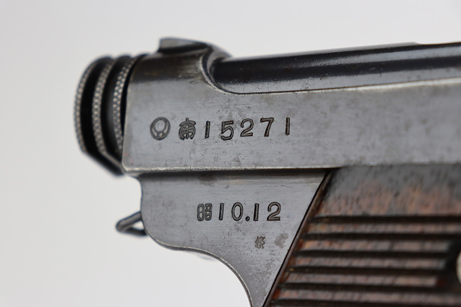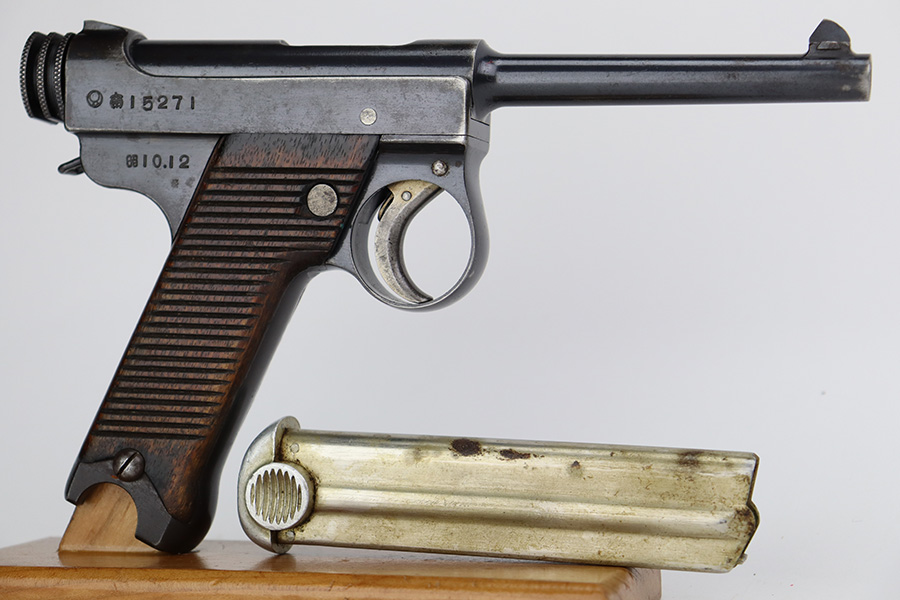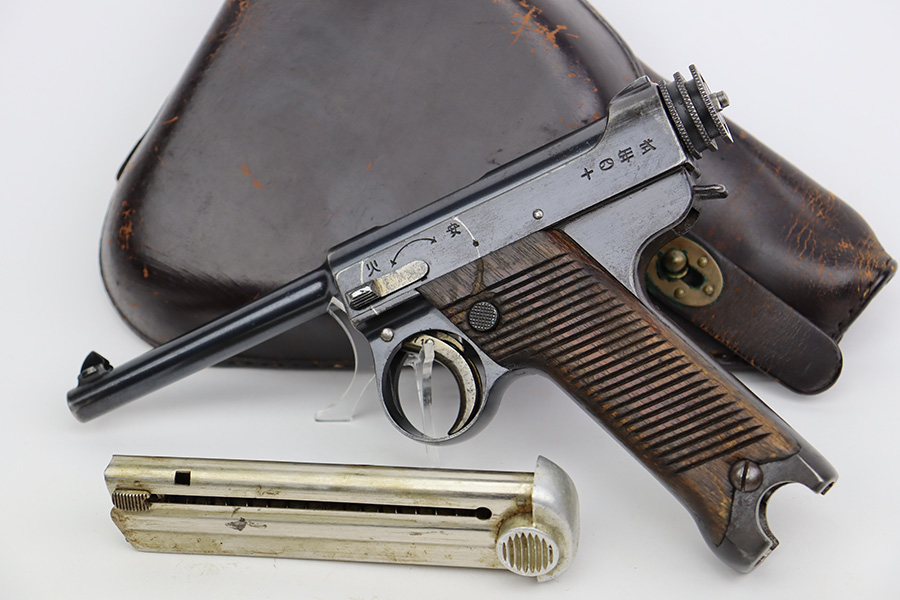 8/2/23 – This is a very nice example of a Nambu Type 14 issued to the Japanese military in December of 1935. It is all matching and comes as a rig with a period-correct holster and a period-correct but mismatched magazine. The holster appears to have been painted with a darker-colored brown. The gun itself has retained about 93% of its original finish with minor wear around the muzzle and on the high edges. Some areas of very light pin-pricking here and there. Fitted with matching-numbered wood grips. The bore has good rifling, but there is pin-pricking throughout.