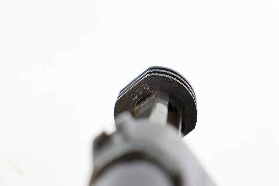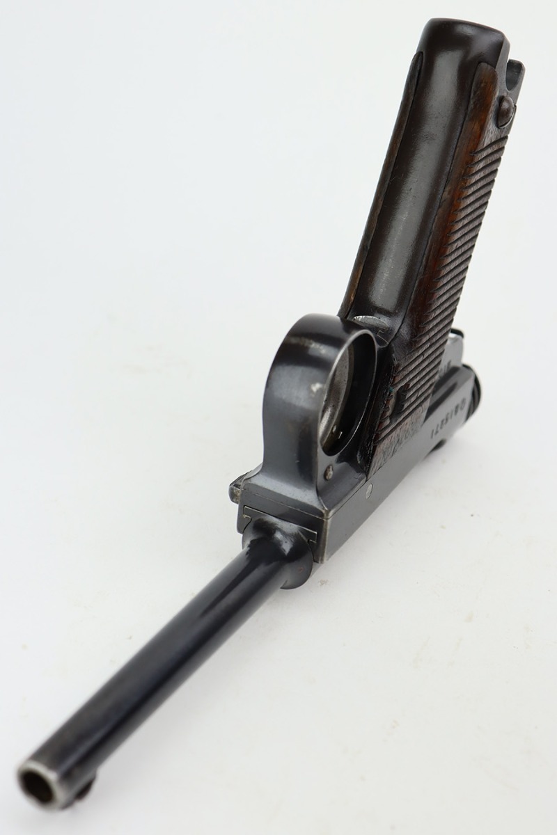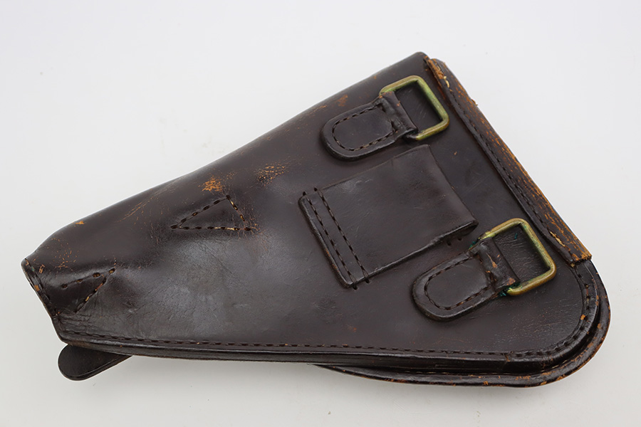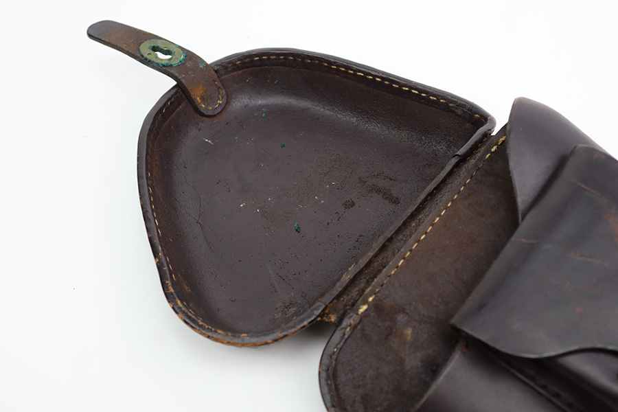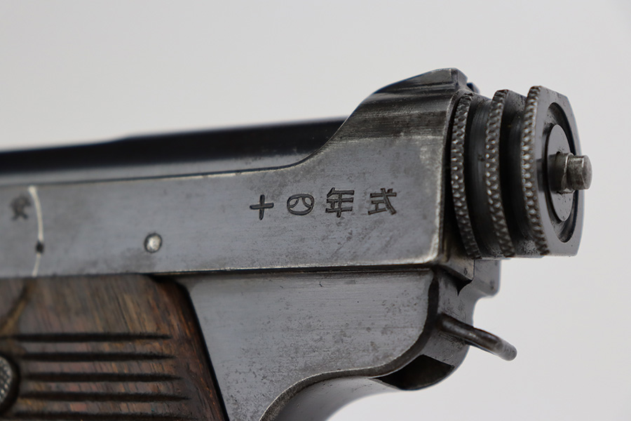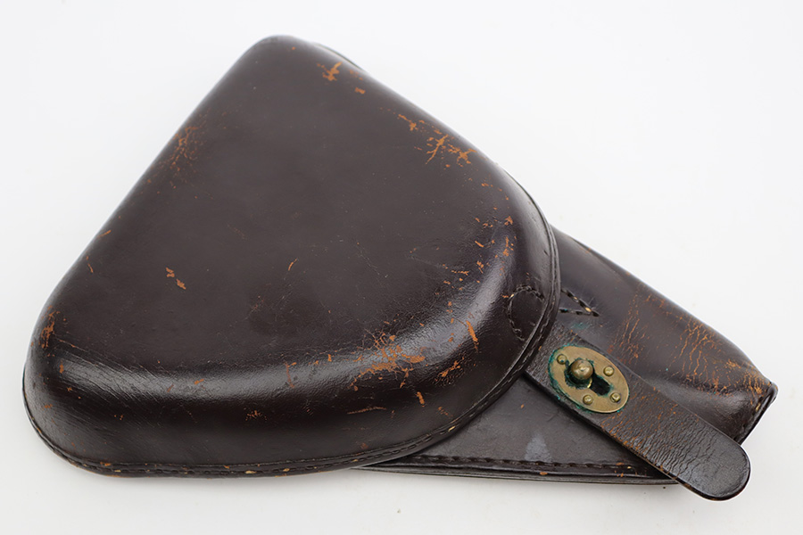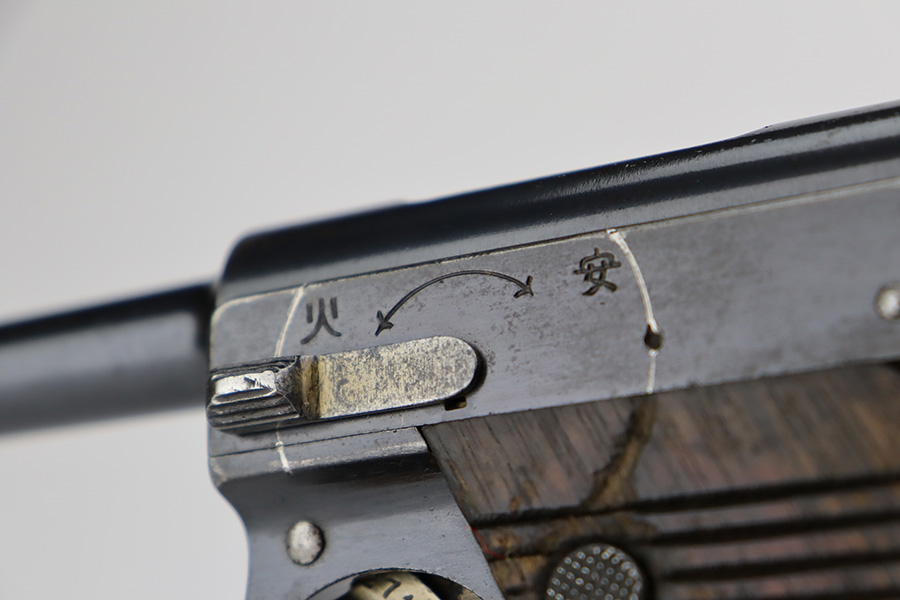 8/2/23 – This is a very nice example of a Nambu Type 14 issued to the Japanese military in December of 1935. It is all matching and comes as a rig with a period-correct holster and a period-correct but mismatched magazine. The holster appears to have been painted with a darker-colored brown. The gun itself has retained about 93% of its original finish with minor wear around the muzzle and on the high edges. Some areas of very light pin-pricking here and there. Fitted with matching-numbered wood grips. The bore has good rifling, but there is pin-pricking throughout.
