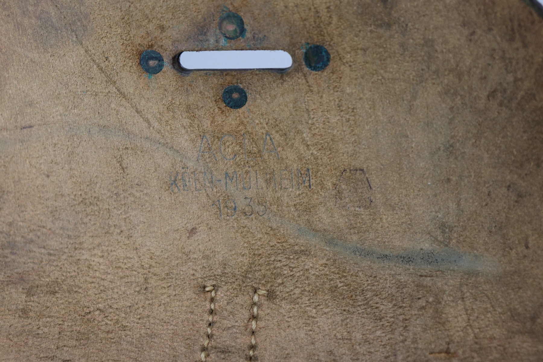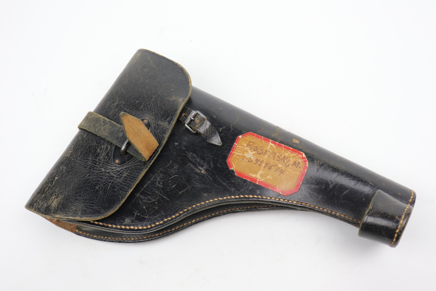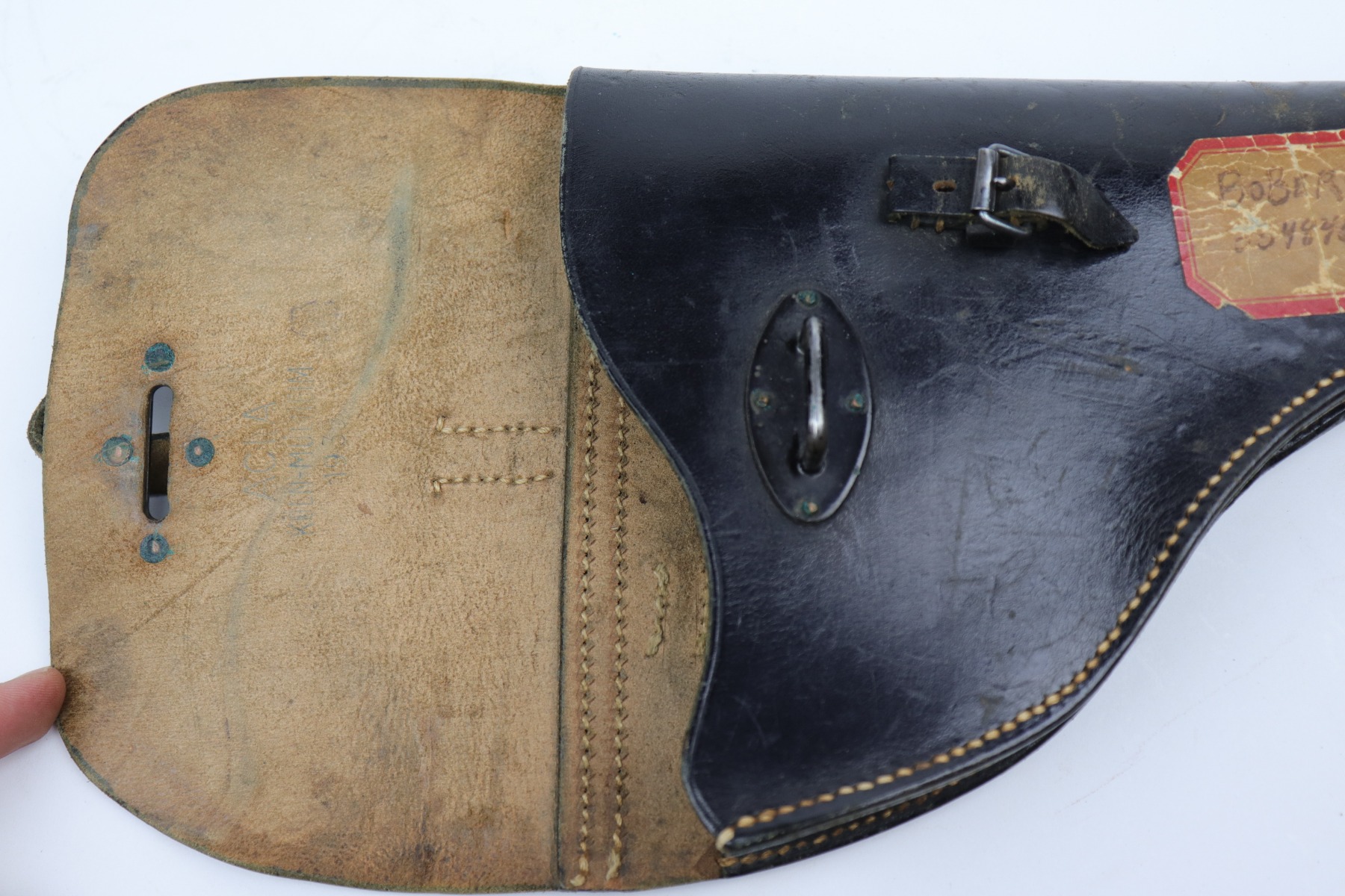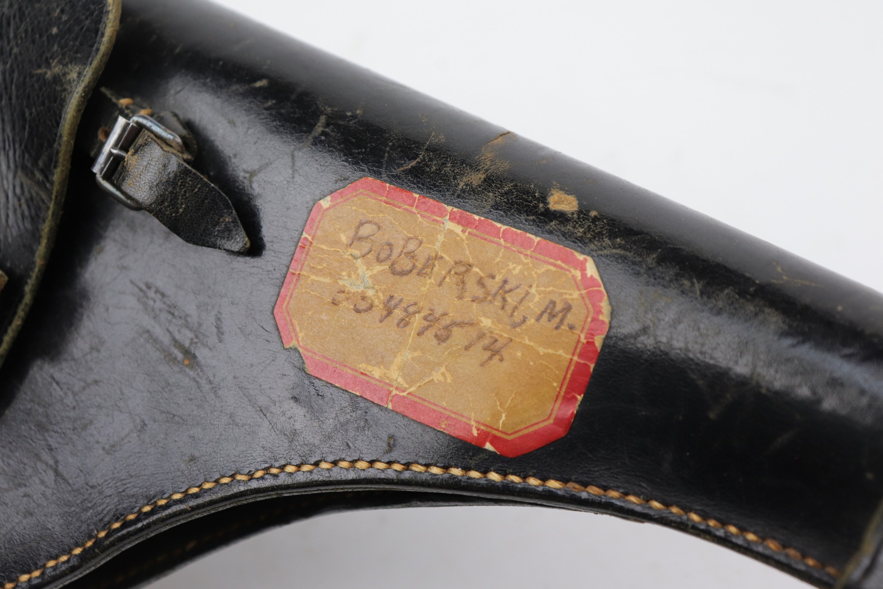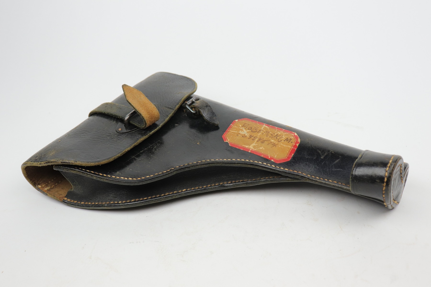 10/14/20 – This is a very nice example of a black leather Nazi flare gun holster. It is dated 1935, waffenamt with a Weimar-style eagle, and makers marked on the inside. There is a sticker on the outside with a GI’s name. It is in nice condition overall – There is light cracking on the top flap, a series of dings on the back, and scuffs throughout. The closure strap is bent upward.