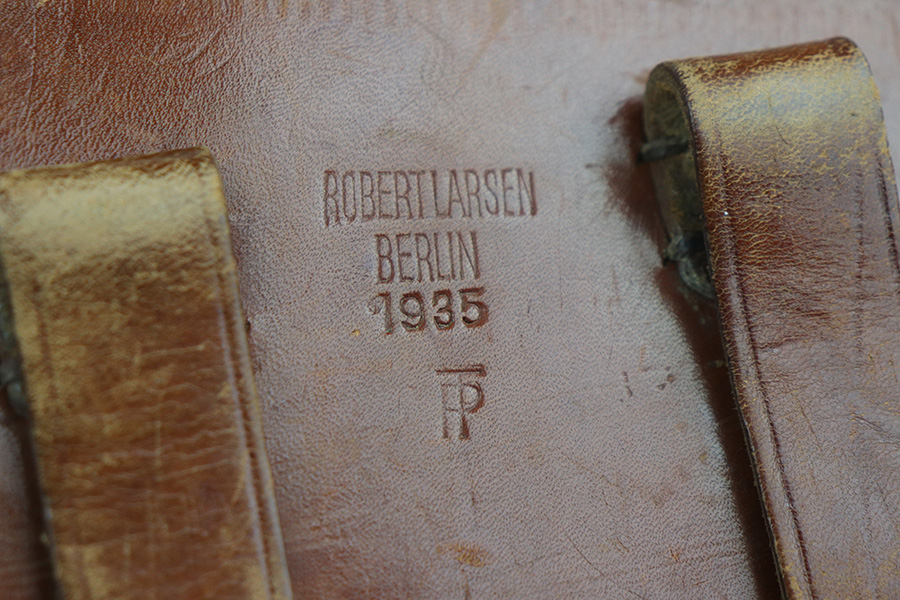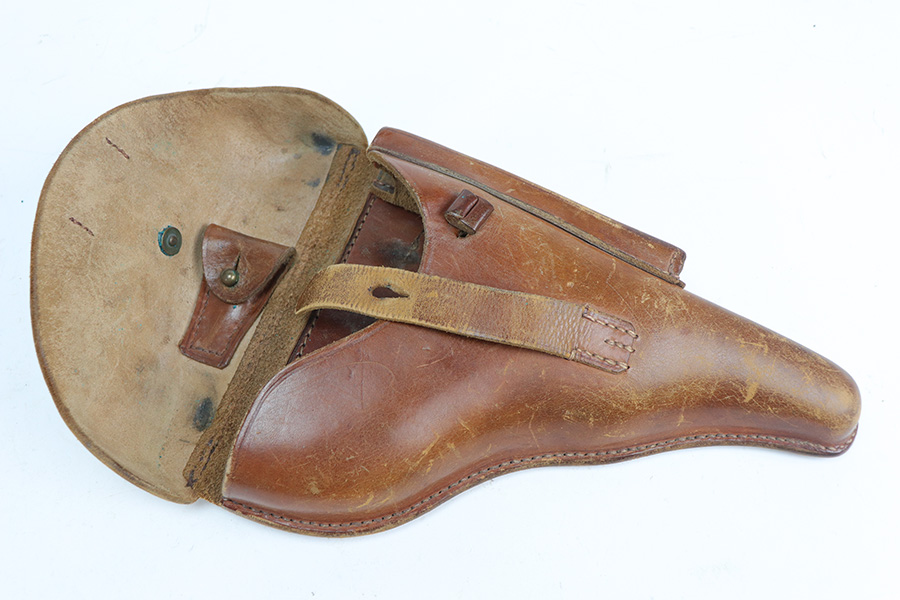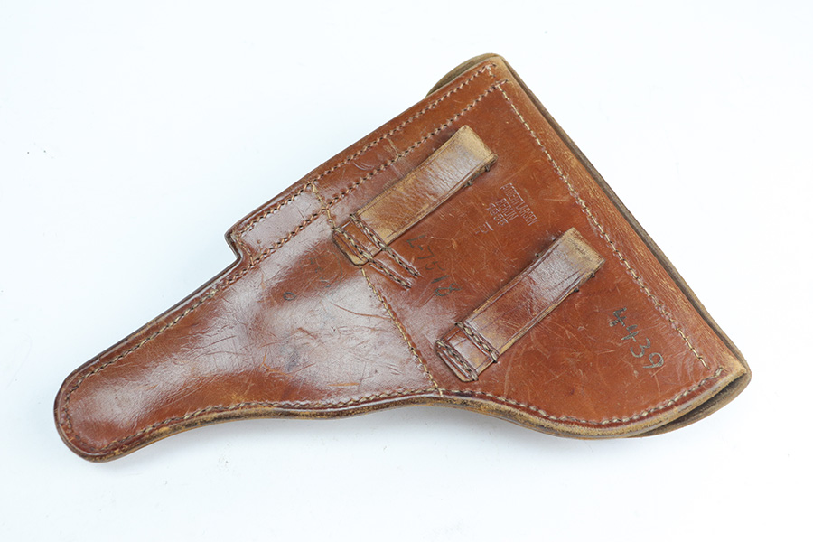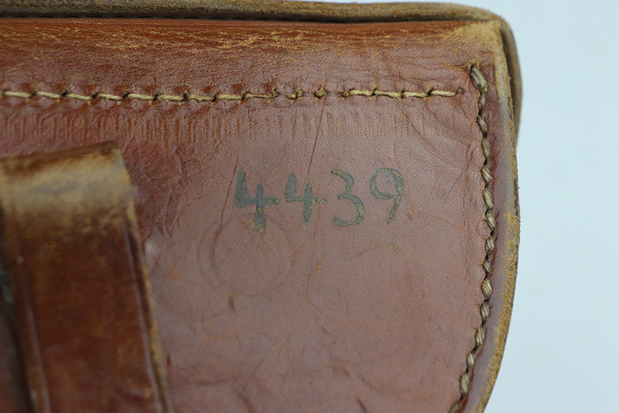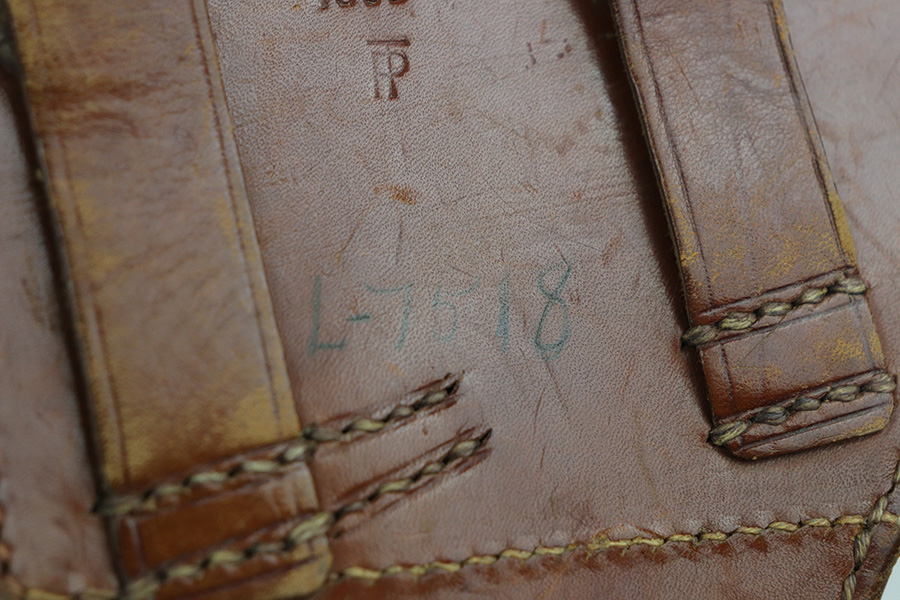 11/9/21 – This is an original, early WW2 production Police luger holster. Considered a “G Date” police holster, this holster is dated 1935 and maker stamped on the back leather. A previous owner wrote a few serial numbers on the back leather as shown. The light brown leather is in great overall condition with some mild surface wear but very clean interior leather. Normal pliability. Would clean up nicely if so desired. Excellent stitching throughout.