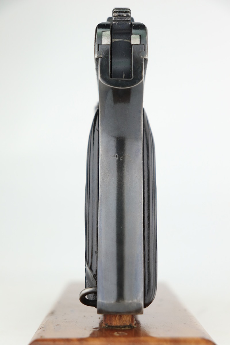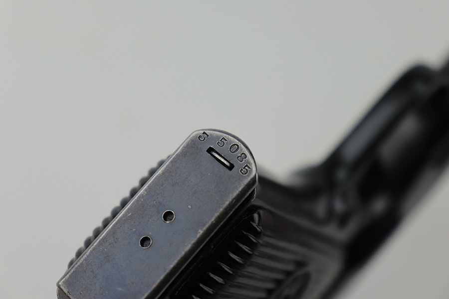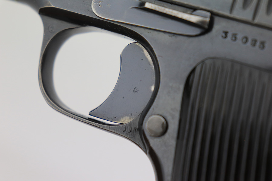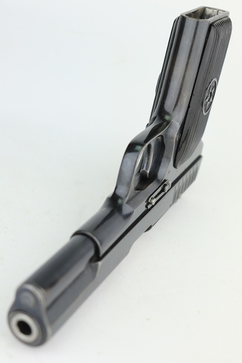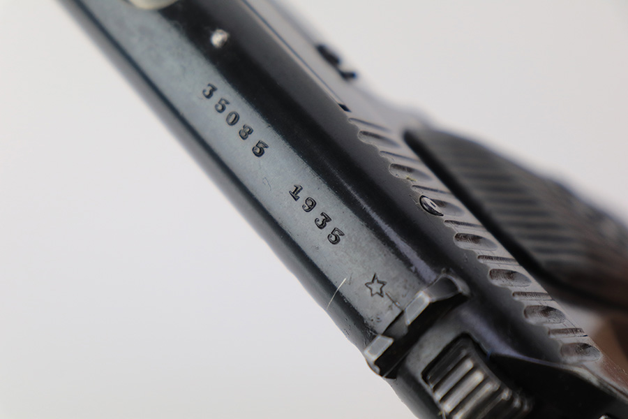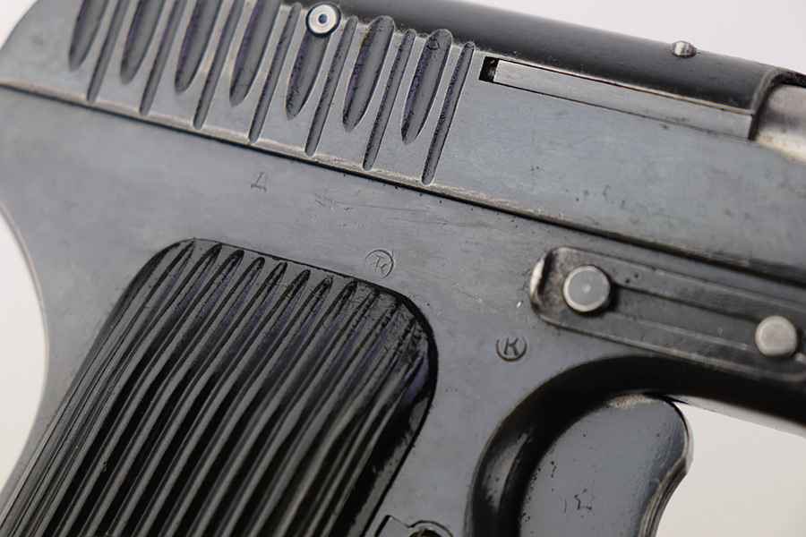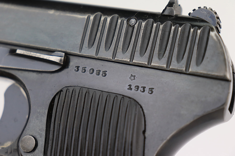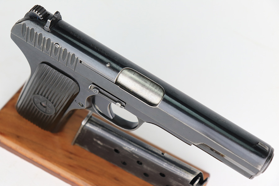 3/16/23 – This is a very nice example of a Tokarev TT-33 issued to the Soviet military in 1935. This one is all matching and has the proper Soviet “Star” proofs throughout. Comes with one original matching-numbered magazine. It has retained about 94% of its original finish with minor wear around the muzzle and on the high edges in general. Minor dulling on the grip straps. Unfortunately, someone lightly scratched the word “CHICK” into the left side of the slide. Excellent period-correct black bakelite grips. Very nice bore with good rifling and some minor pin-pricking here and there.
