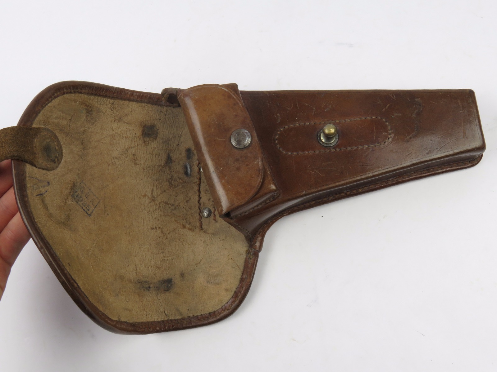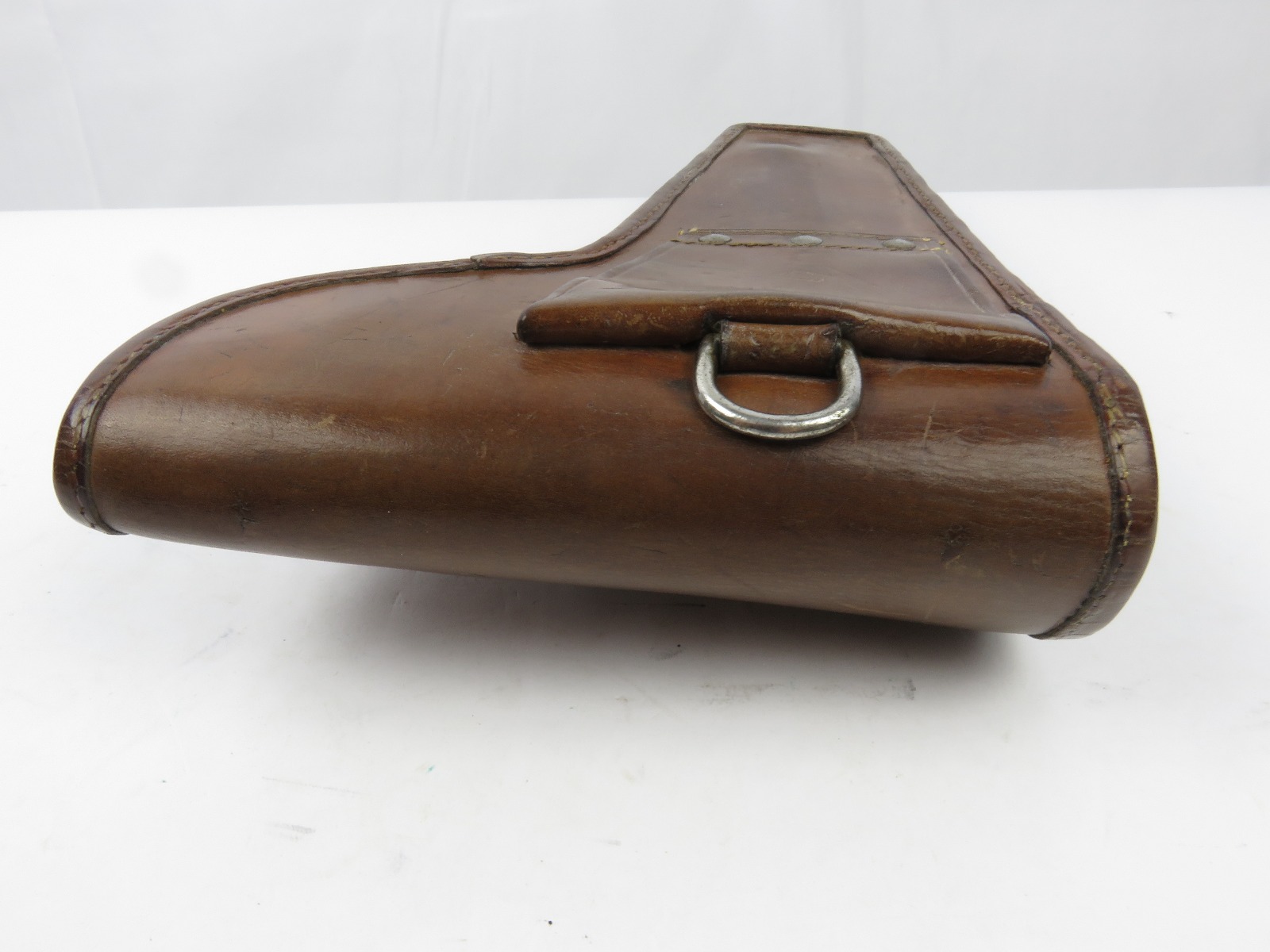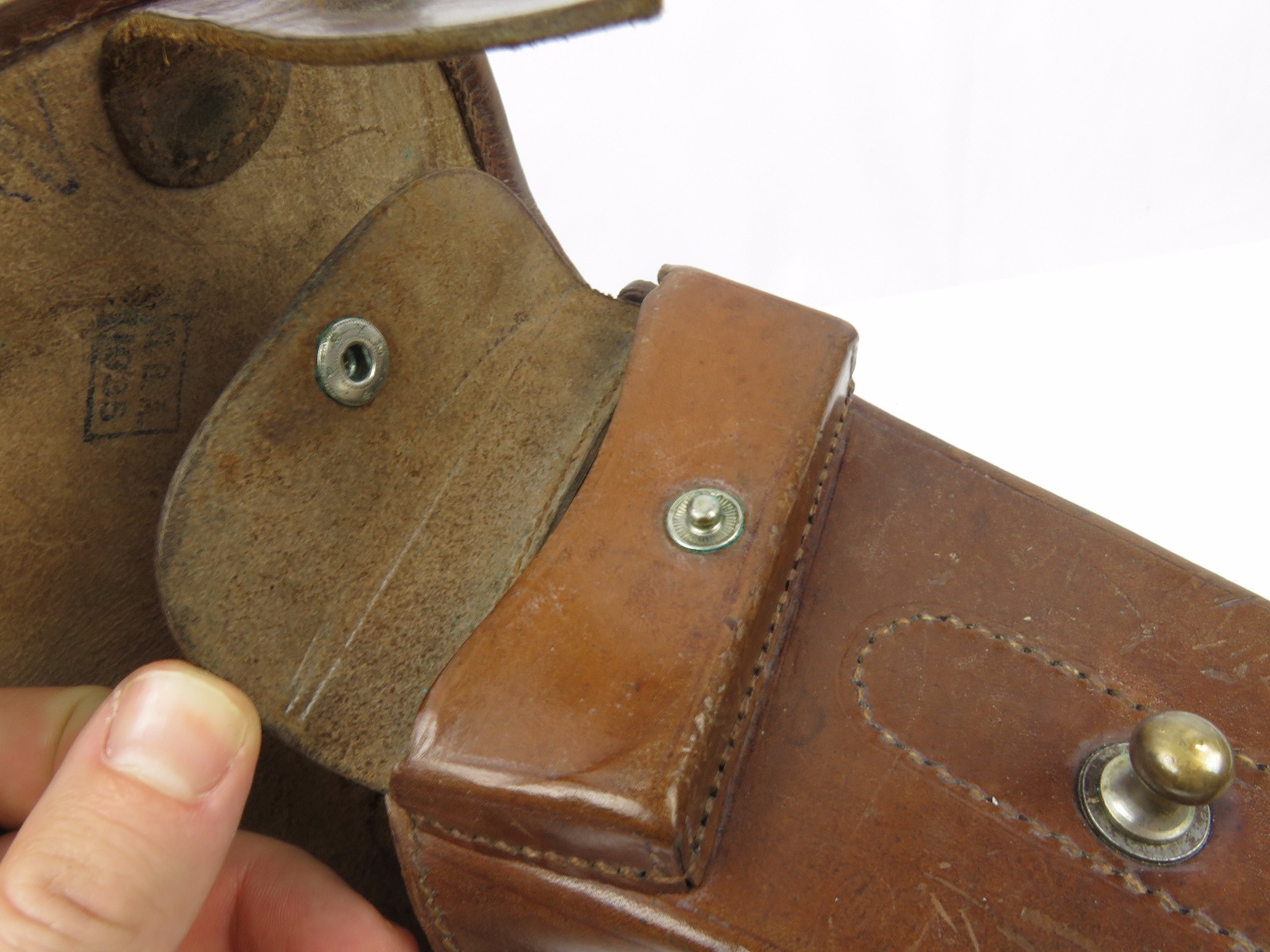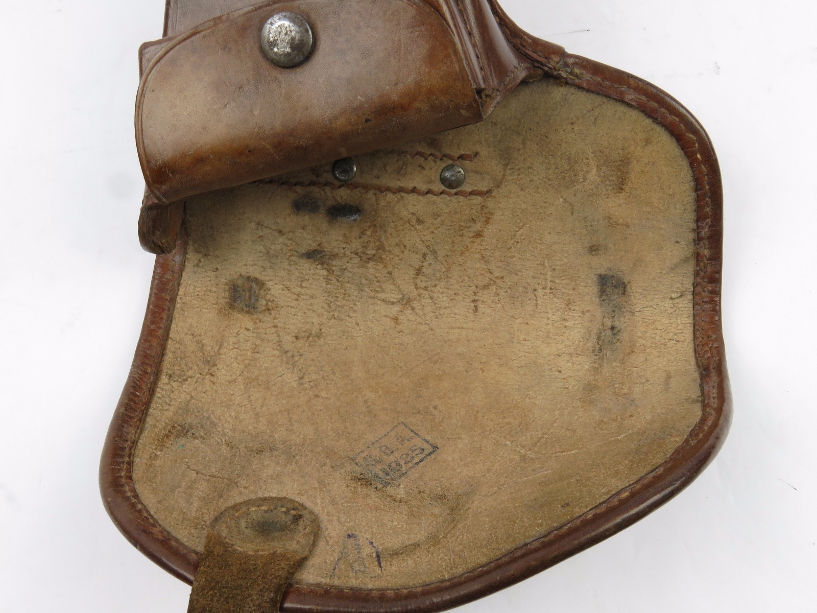 8/16/17 – This is an original Steyr Hahn Model 12 holster. The holster is in excellent condition with strong leather that has very nice shape. There are some external scuff and scratch marks from aging and use throughout WW2. The interior leather is very clean. The interior leather is ink stamped and dated 1935. The stitching is all original and in tact.