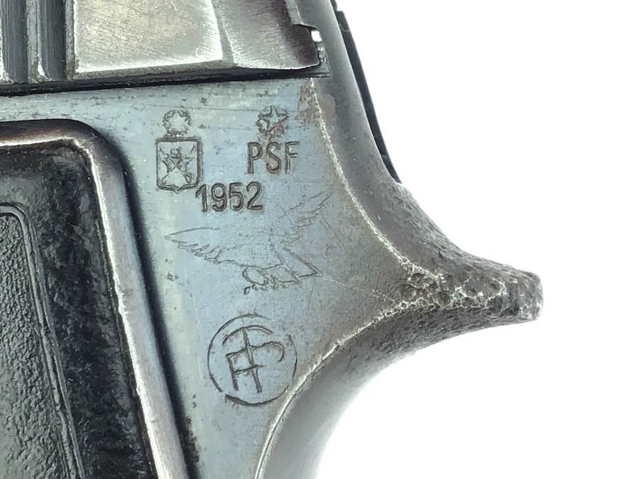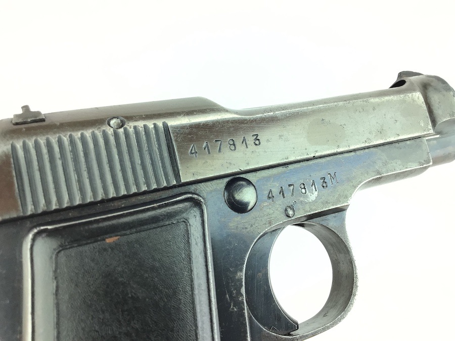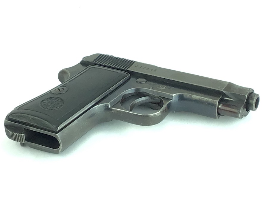 10/17/24 – This is a fairly nice example of a Beretta Model 1935 issued to the Italian Air Force as indicated by the Eagle proof stamp on the tang. It is all matching and has a rare, early “TP” Italian military acceptance proof. It was re-purposed for the commercial market in 1952 showing commercial proof marks along with the date and the letter “M” serial number suffix. The gun itself has retained about ~80% of its original high polish finish. Most of the wear is around the high edges of the slide along with the front and back straps. Minor corrosion on the tip of the tang. Light patina throughout. Includes nice black bakelite grips. The bore is clean and has nice rifling. Fully functional.