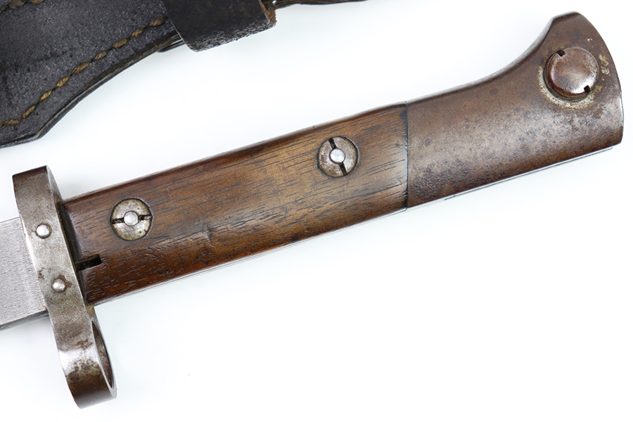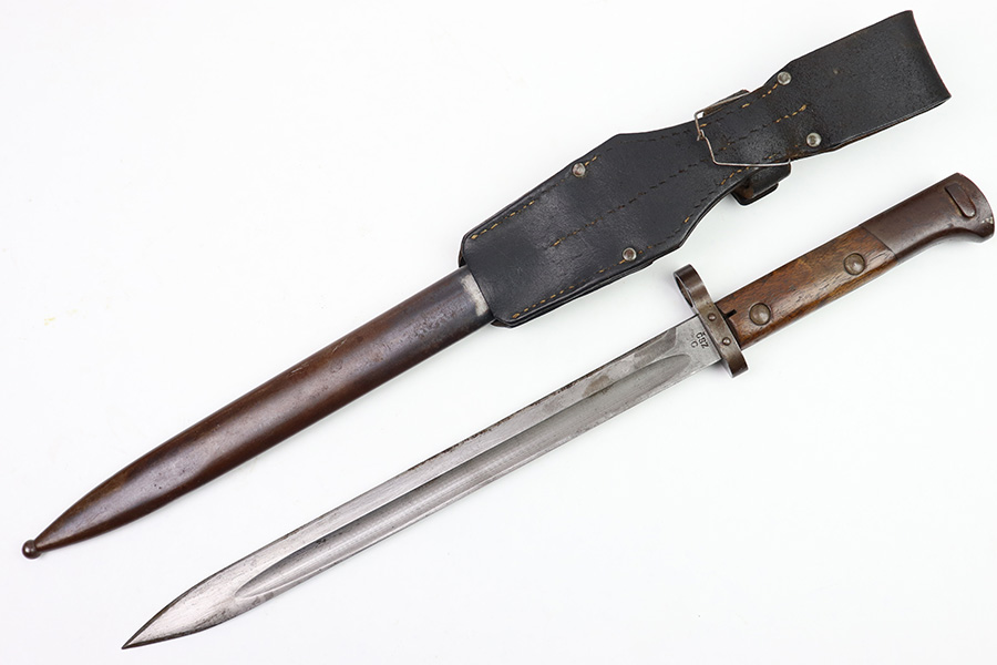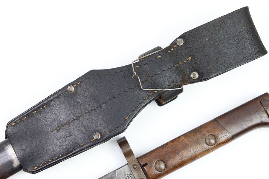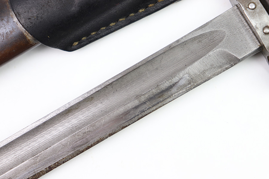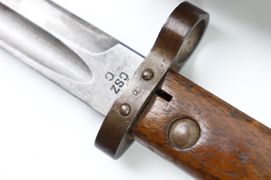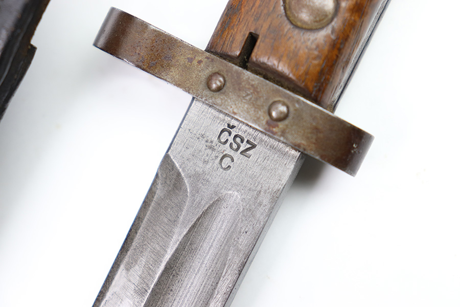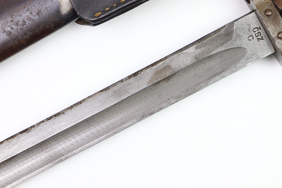 11/22/22 – This is an original CZ VZ-24 bayonet from 1936. The bayonet is in good overall condition with a blade edge that looks lightly sharpened. There is some mild surface scratching and light spotty discoloration on the blade as shown. The ricasso is stamped CSZ C on one side, and the cross guard is stamped “Z” on the same side. The metal on the cross guard and pommel have dark surface patina throughout. There is some handling wear on the wood grip but no cracks or chips. The scabbard has dark patina throughout and most of the finish is worn. No dents however. Comes with an unmarked leather frog.