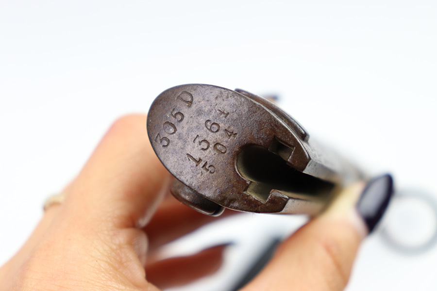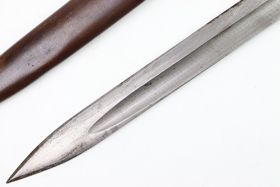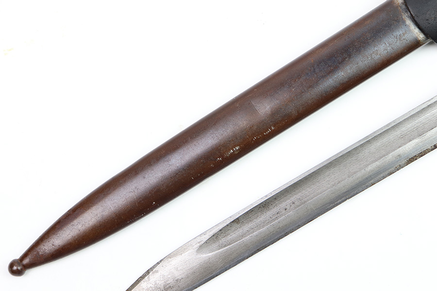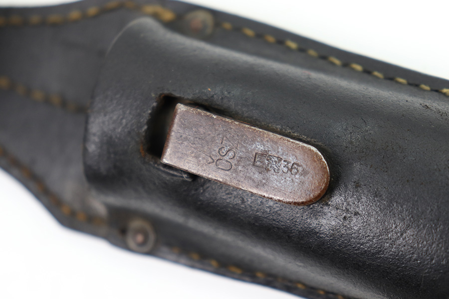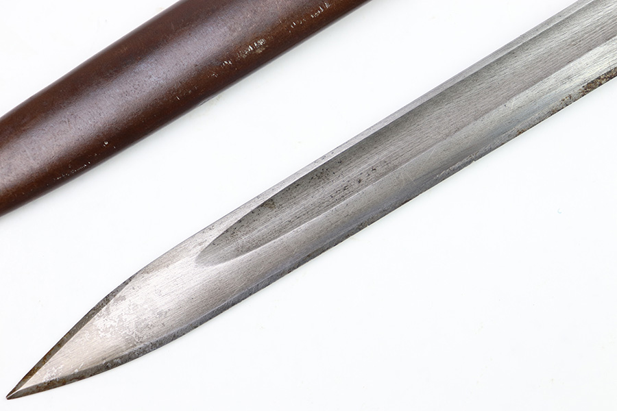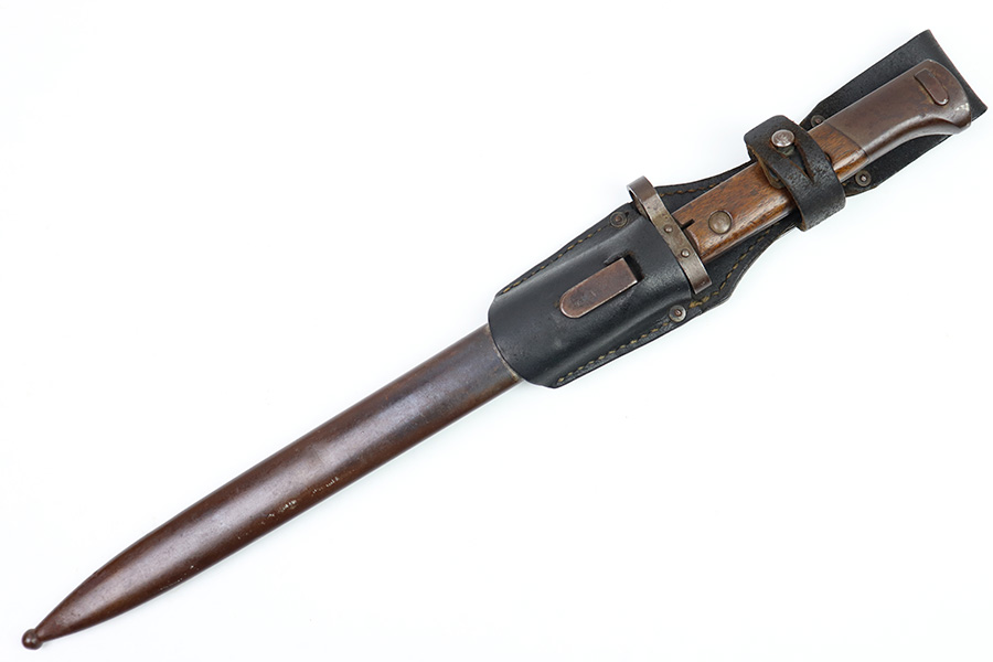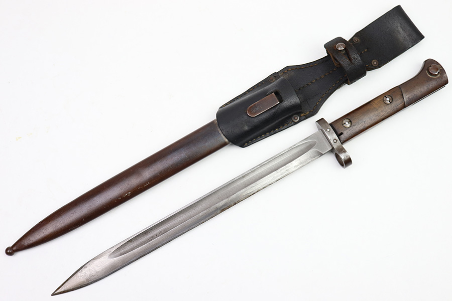 11/22/22 – This is an original CZ VZ-24 bayonet from 1936. The bayonet is in good overall condition with a blade edge that looks lightly sharpened. There is some mild surface scratching and light spotty discoloration on the blade as shown. The ricasso is stamped CSZ C on one side, and the cross guard is stamped “Z” on the same side. The metal on the cross guard and pommel have dark surface patina throughout. There is some handling wear on the wood grip but no cracks or chips. The scabbard has dark patina throughout and most of the finish is worn. No dents however. Comes with an unmarked leather frog.
