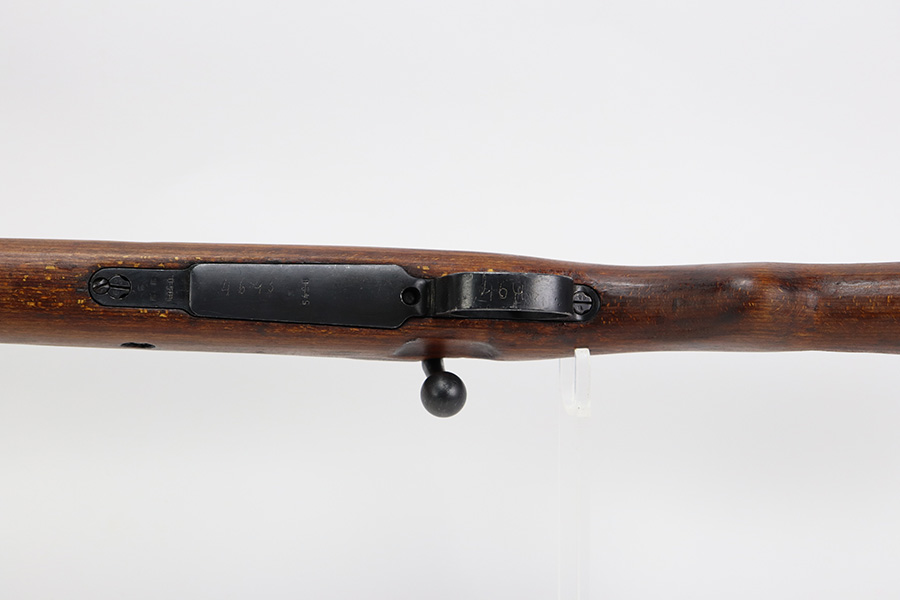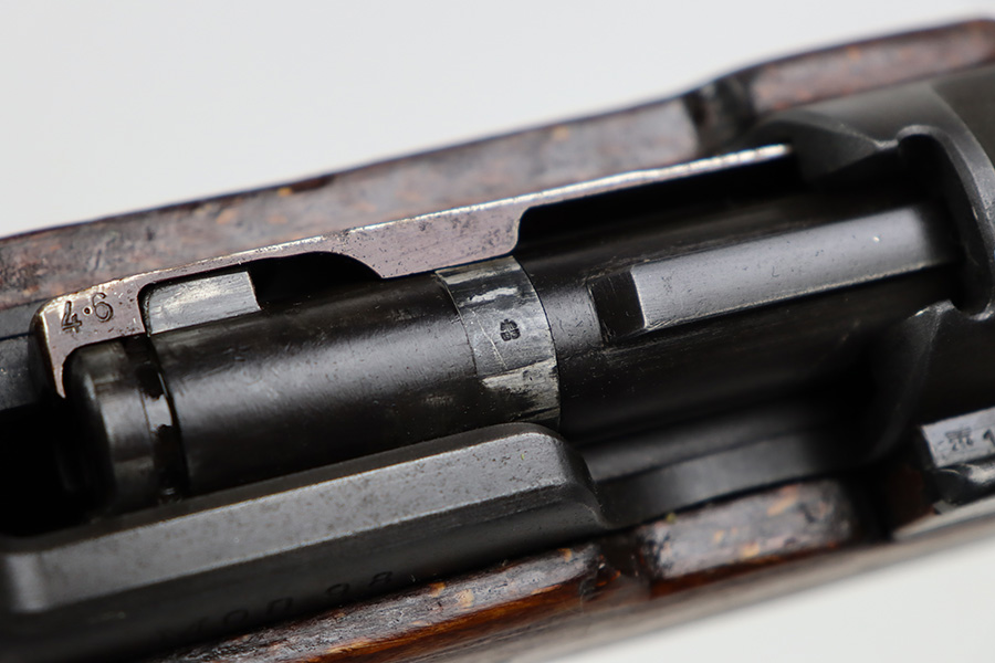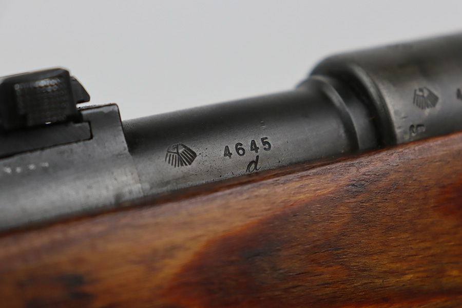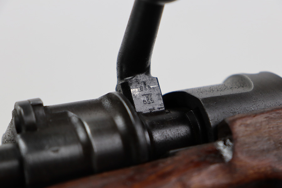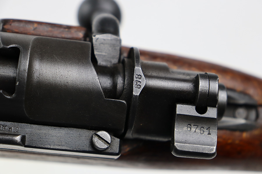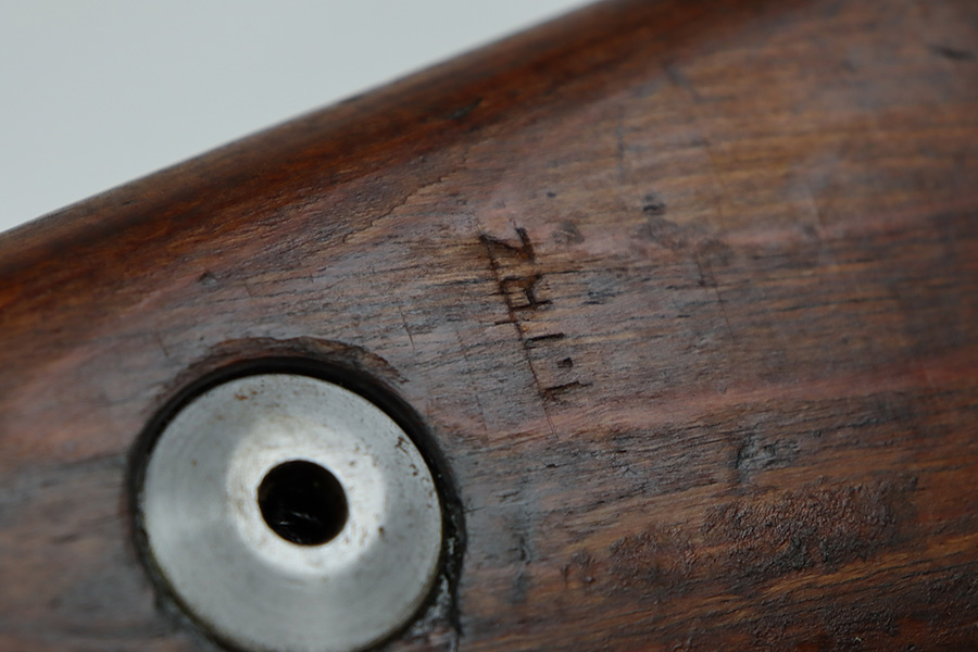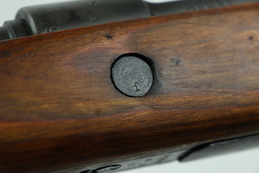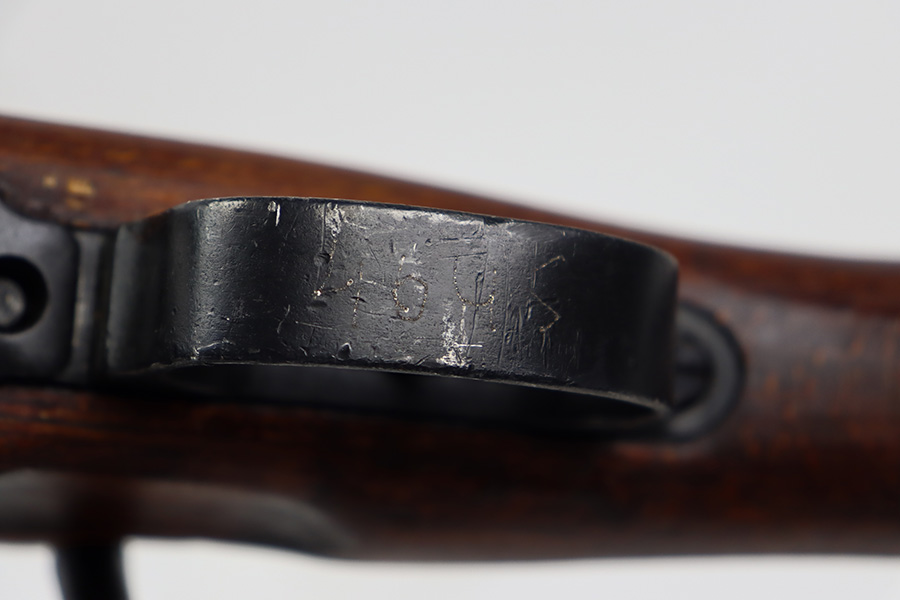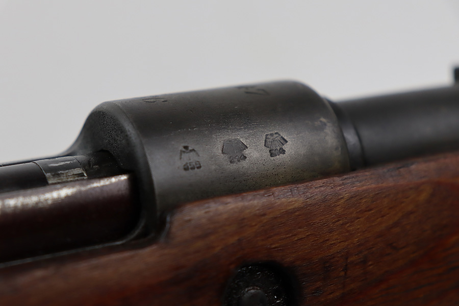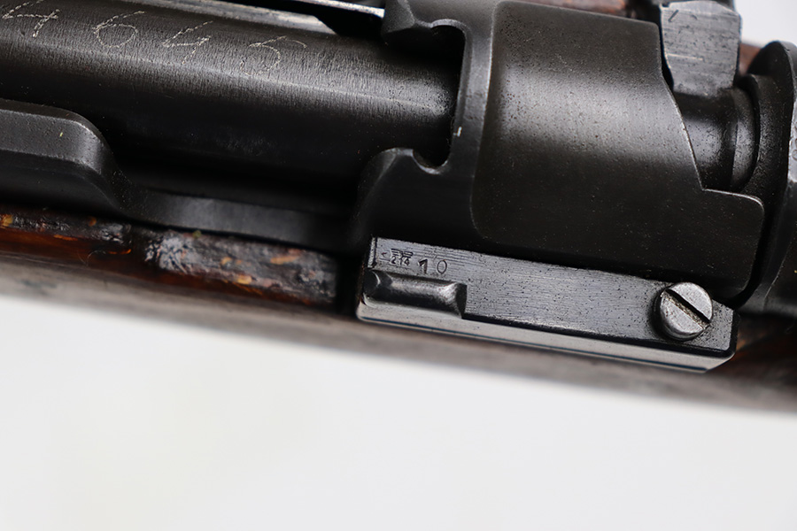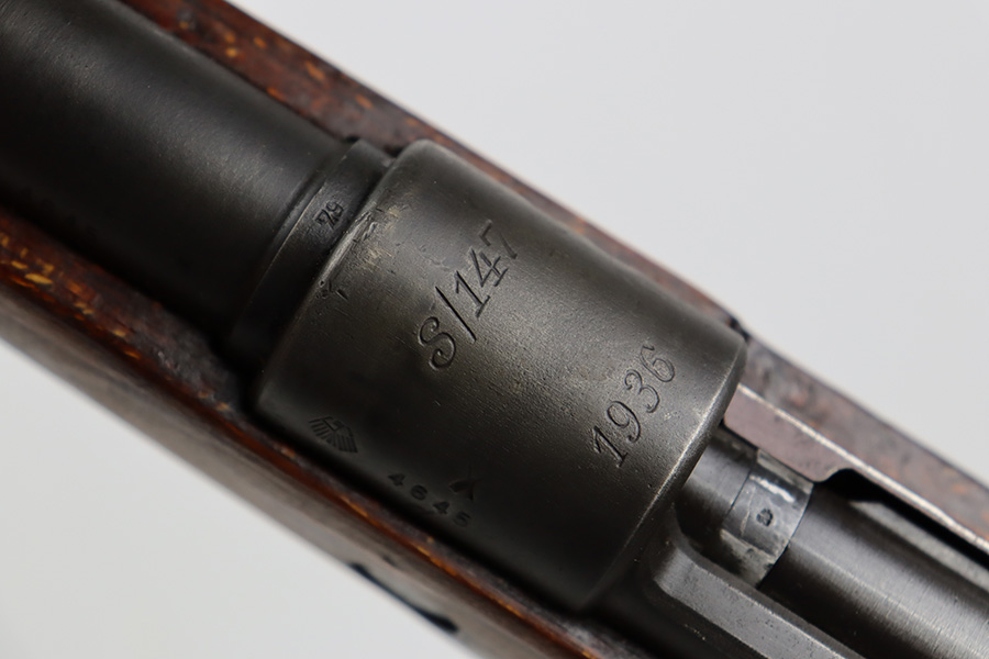 7/25/23 – This is a nice example of an “S/147” Code JP Sauer K98 rifle issued to the Nazi military in 1936. The gun is largely mismatched, has a “Russian X” on the receiver, and has electro-penciled numbering on some of the parts, indicating this gun was a Russian capture. Import mark on the barrel. The metal parts have retained roughly 75% of their finish. The finish has a dull appearance with areas of thinning along the barrel and on the receiver. Brown patina on the barrel bands. The wood furniture is in very nice condition. The stock is numbered and mismatched and appears to have been lightly sanded. The bore has pretty good rifling, but there is freckling throughout.