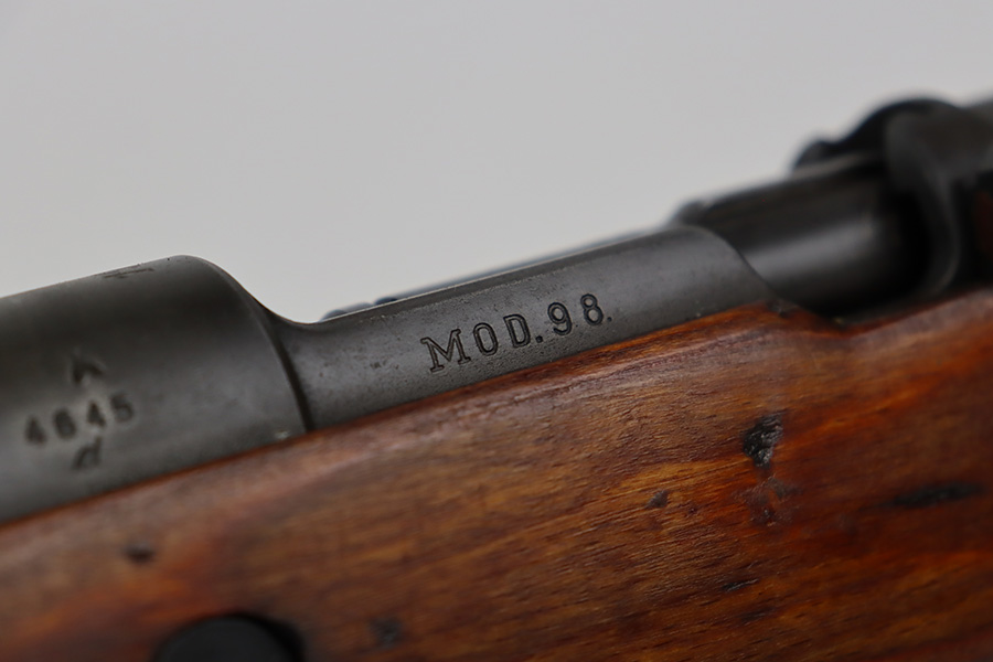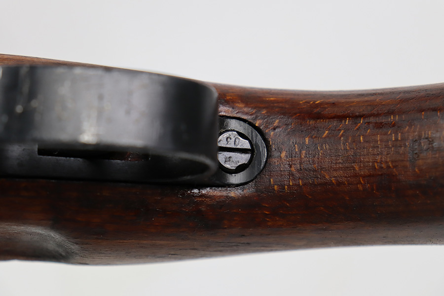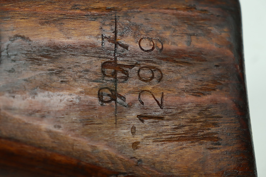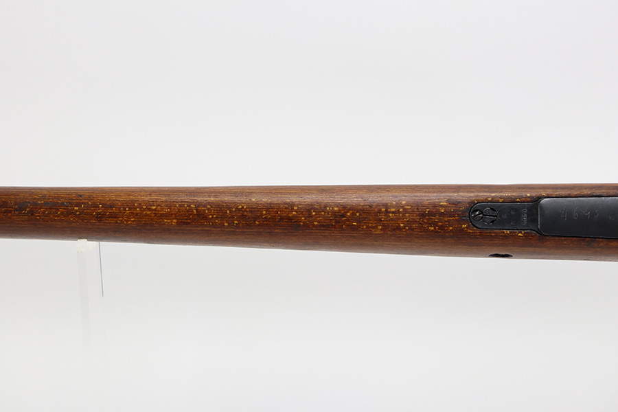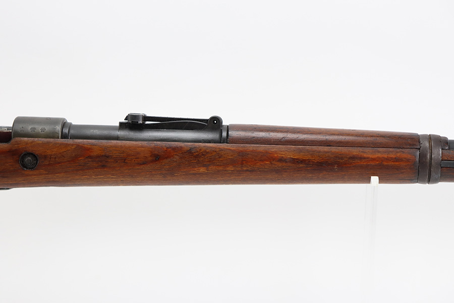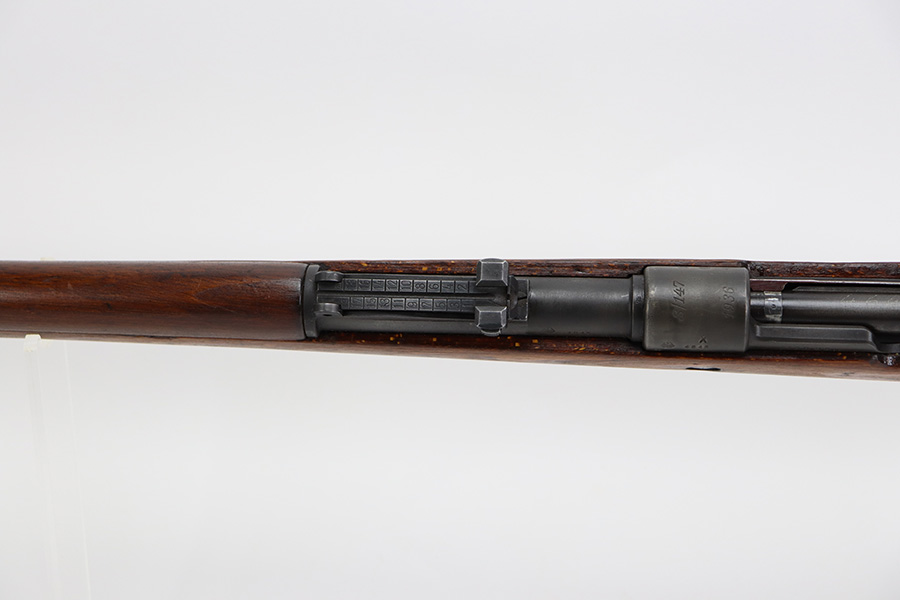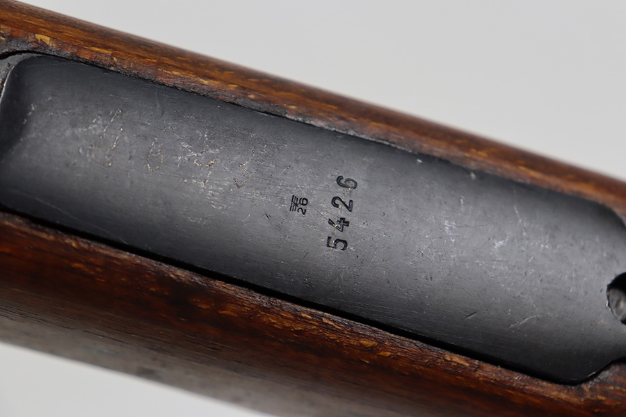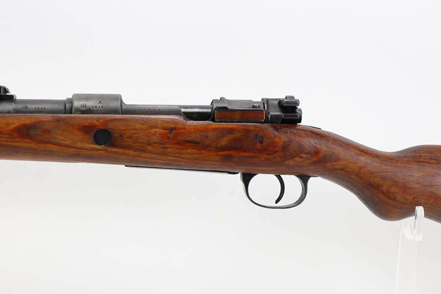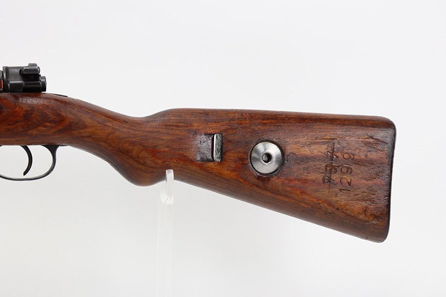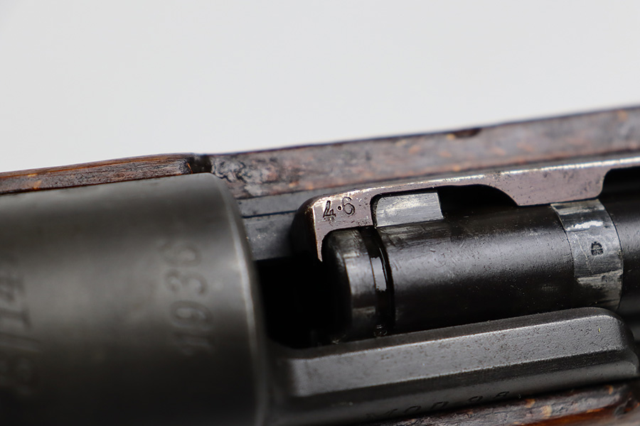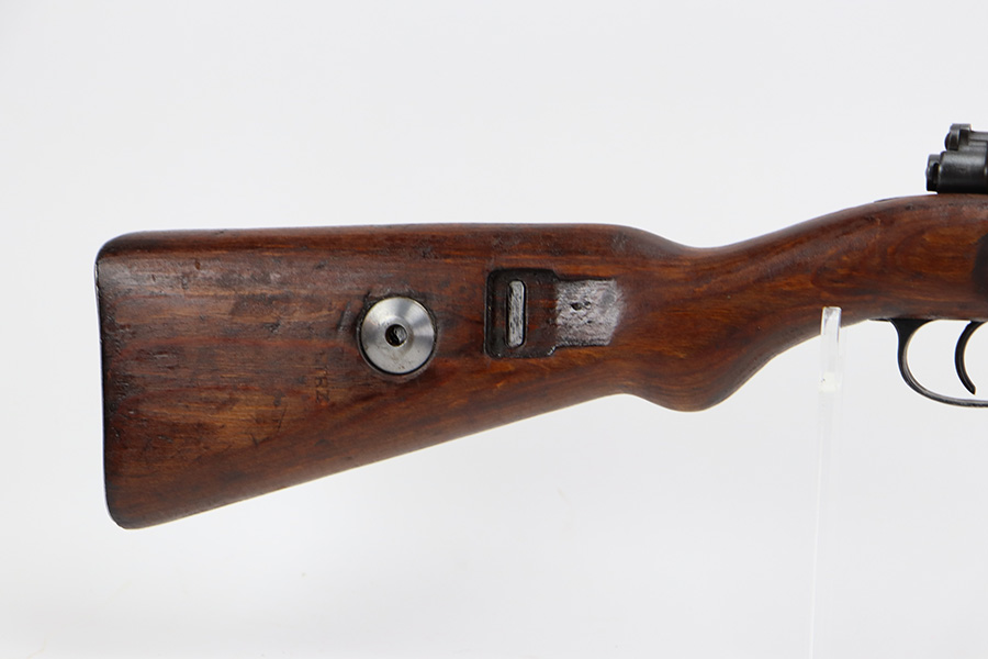 7/25/23 – This is a nice example of an “S/147” Code JP Sauer K98 rifle issued to the Nazi military in 1936. The gun is largely mismatched, has a “Russian X” on the receiver, and has electro-penciled numbering on some of the parts, indicating this gun was a Russian capture. Import mark on the barrel. The metal parts have retained roughly 75% of their finish. The finish has a dull appearance with areas of thinning along the barrel and on the receiver. Brown patina on the barrel bands. The wood furniture is in very nice condition. The stock is numbered and mismatched and appears to have been lightly sanded. The bore has pretty good rifling, but there is freckling throughout.