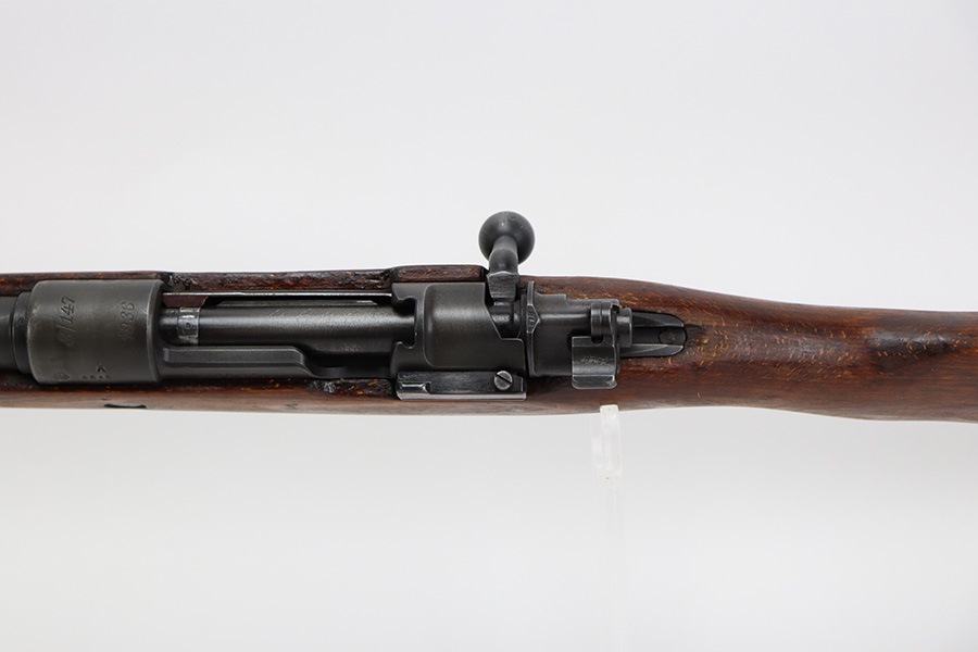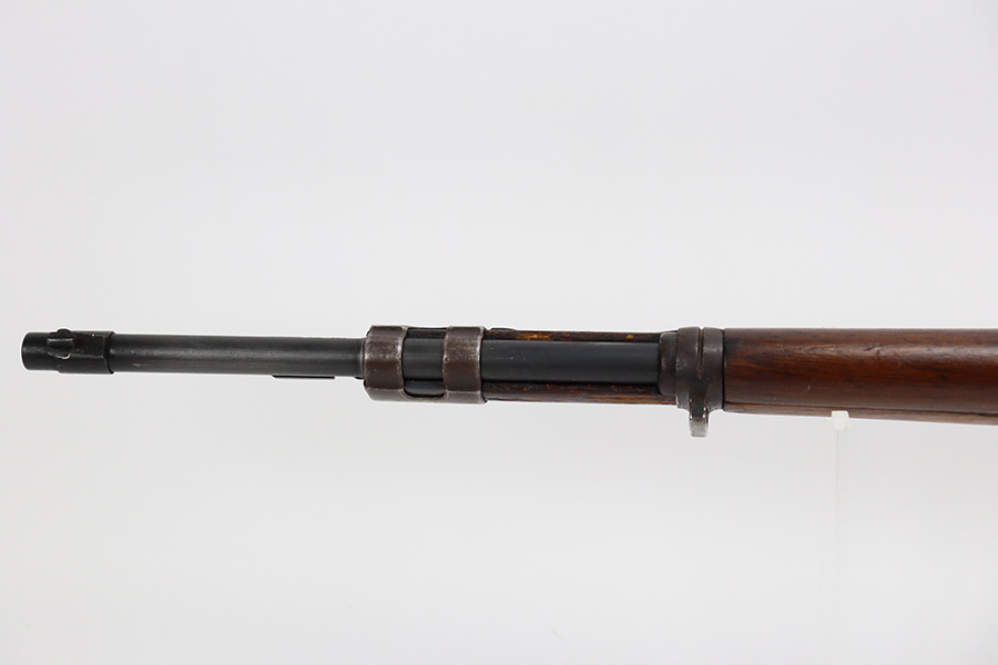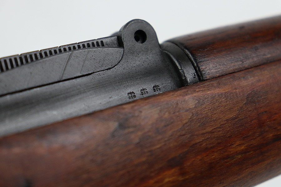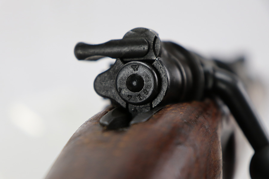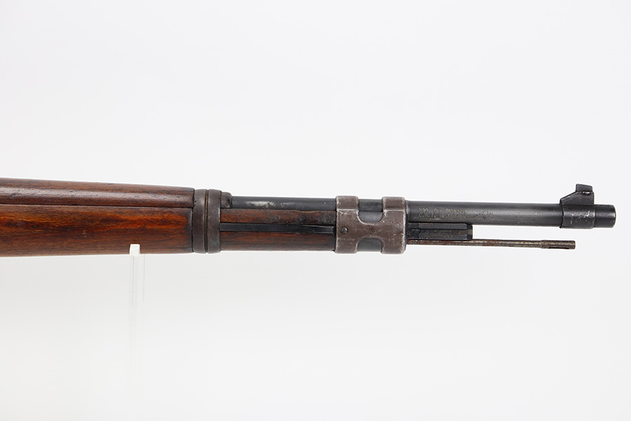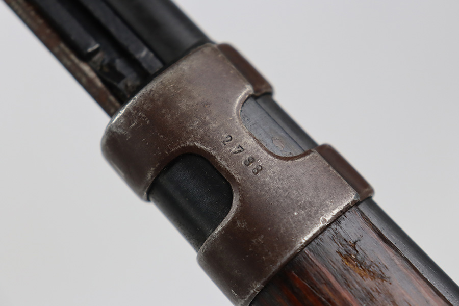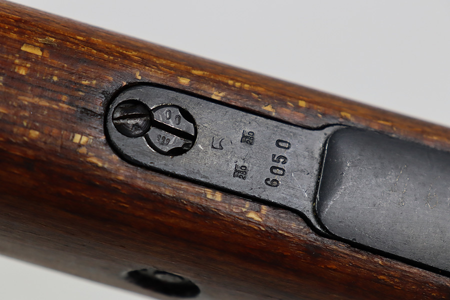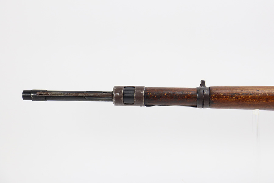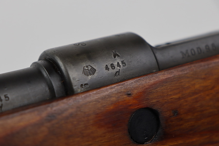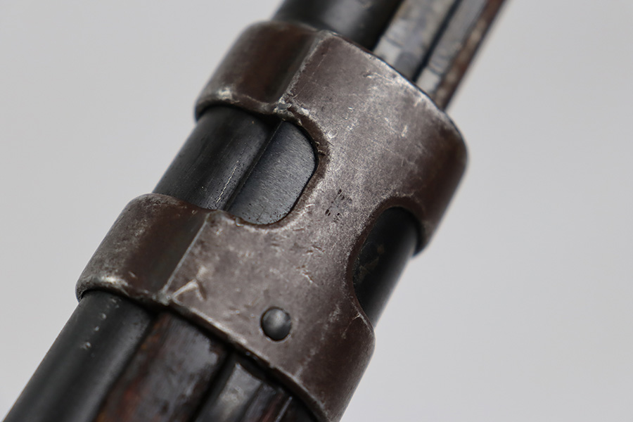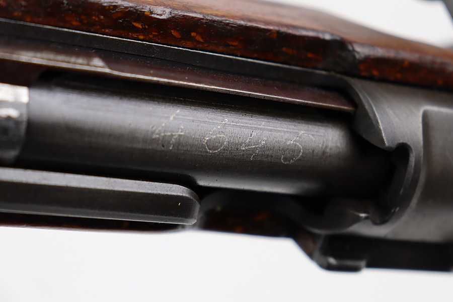 7/25/23 – This is a nice example of an “S/147” Code JP Sauer K98 rifle issued to the Nazi military in 1936. The gun is largely mismatched, has a “Russian X” on the receiver, and has electro-penciled numbering on some of the parts, indicating this gun was a Russian capture. Import mark on the barrel. The metal parts have retained roughly 75% of their finish. The finish has a dull appearance with areas of thinning along the barrel and on the receiver. Brown patina on the barrel bands. The wood furniture is in very nice condition. The stock is numbered and mismatched and appears to have been lightly sanded. The bore has pretty good rifling, but there is freckling throughout.