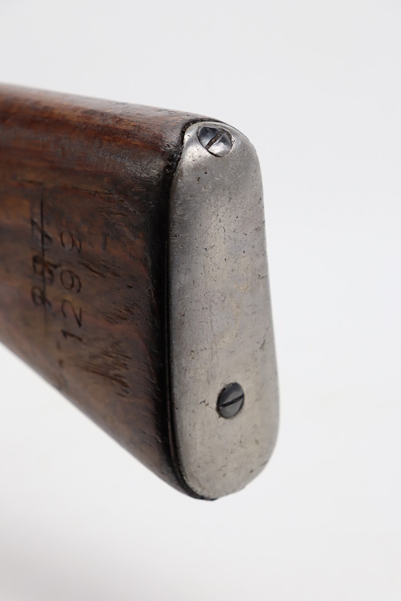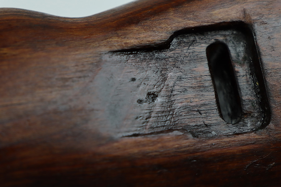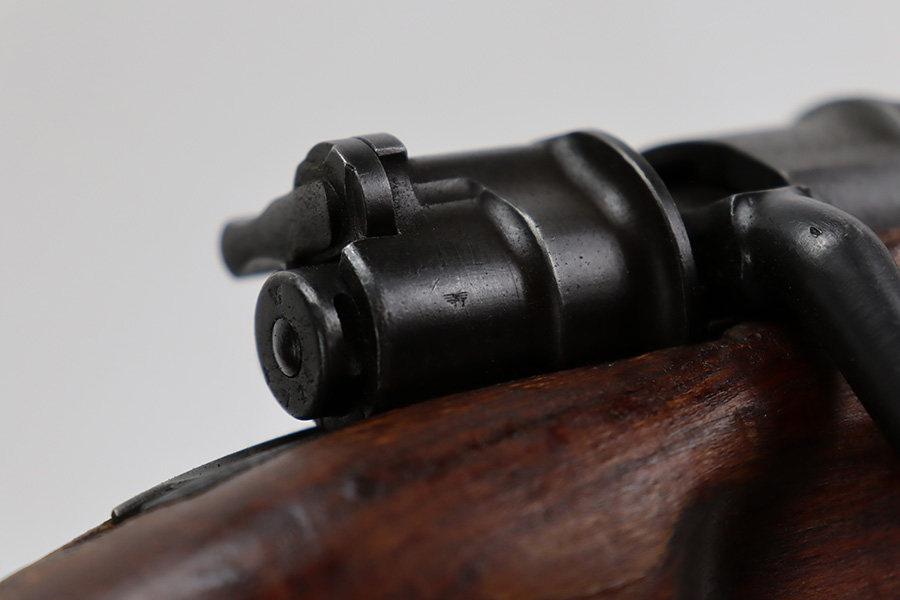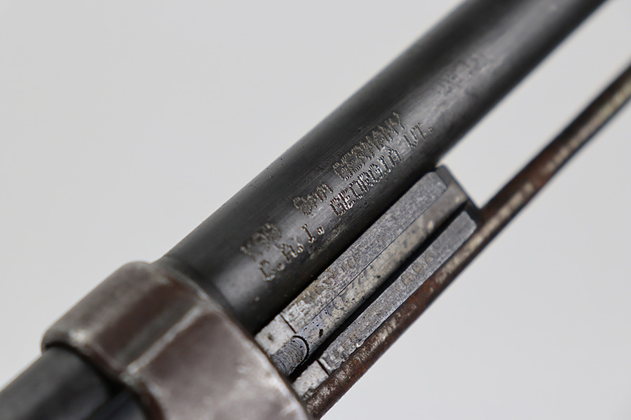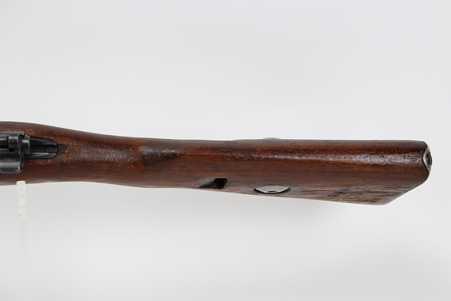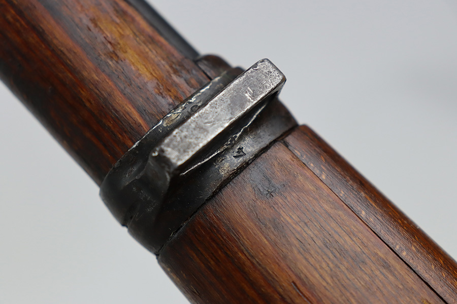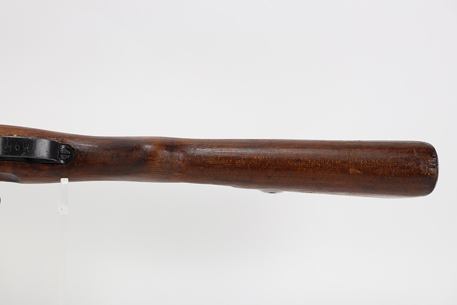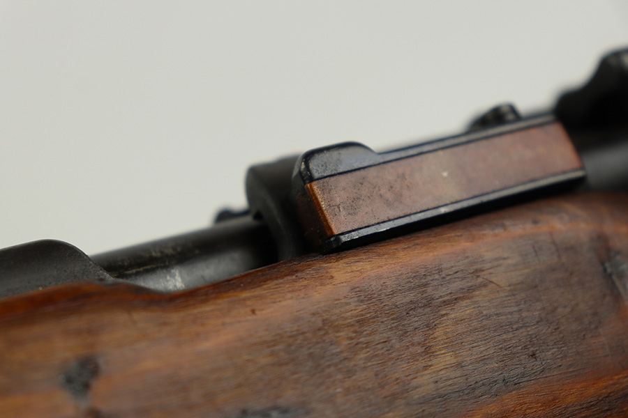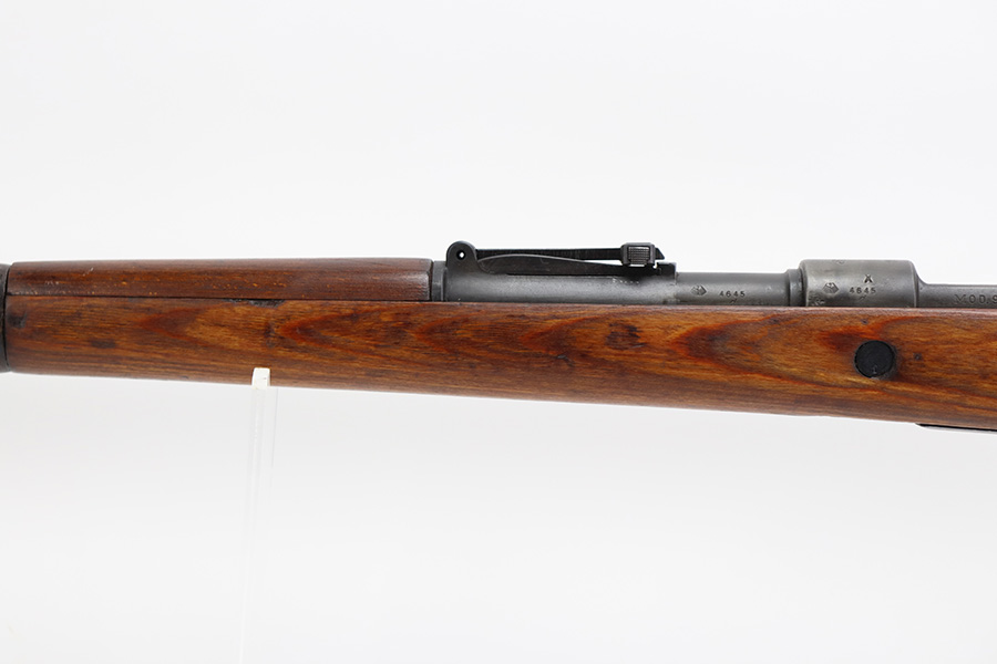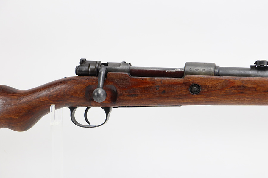 7/25/23 – This is a nice example of an “S/147” Code JP Sauer K98 rifle issued to the Nazi military in 1936. The gun is largely mismatched, has a “Russian X” on the receiver, and has electro-penciled numbering on some of the parts, indicating this gun was a Russian capture. Import mark on the barrel. The metal parts have retained roughly 75% of their finish. The finish has a dull appearance with areas of thinning along the barrel and on the receiver. Brown patina on the barrel bands. The wood furniture is in very nice condition. The stock is numbered and mismatched and appears to have been lightly sanded. The bore has pretty good rifling, but there is freckling throughout.