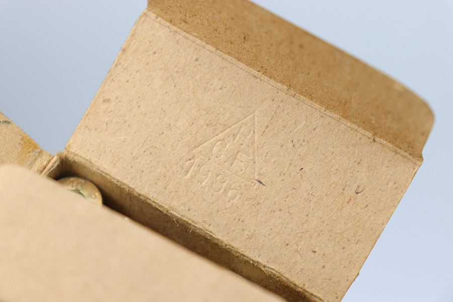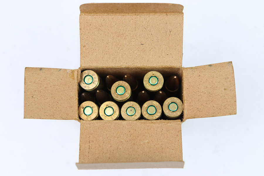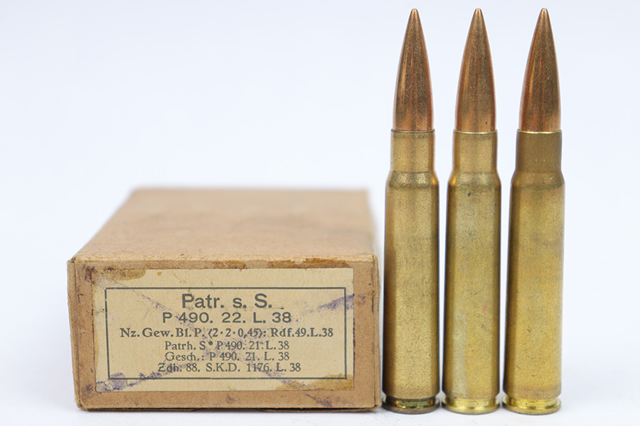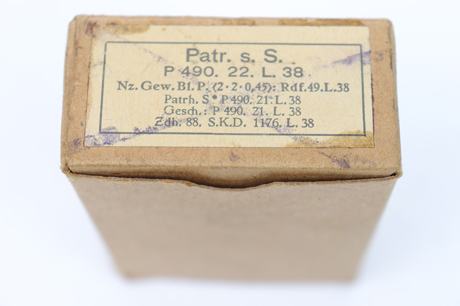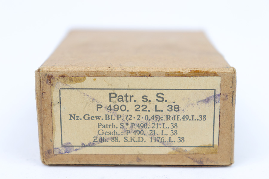 1/10/23 – This is a WW2 era vintage box of 8mm Mauser (7.92x57mm) rifle ammunition. There are 15 rounds total, all in excellent condition as shown. The box is dated 1936, and the head stamps on the rounds indicate 1940 production. See photos.