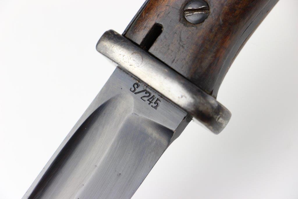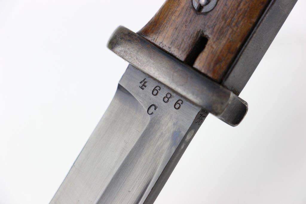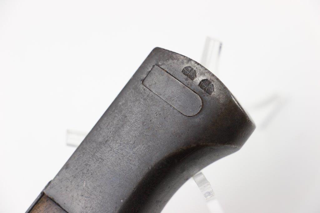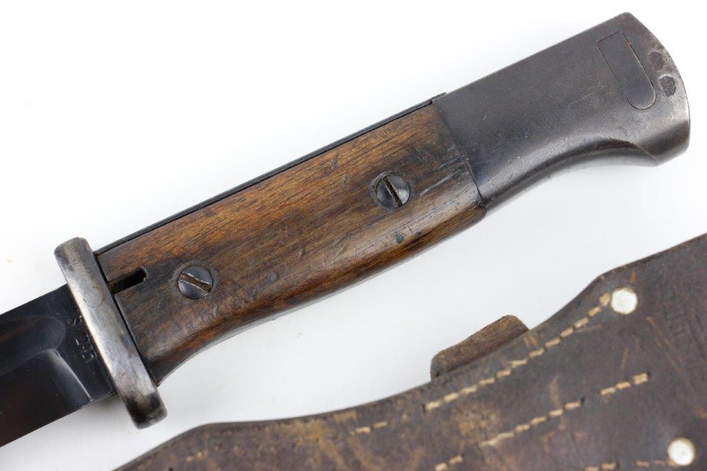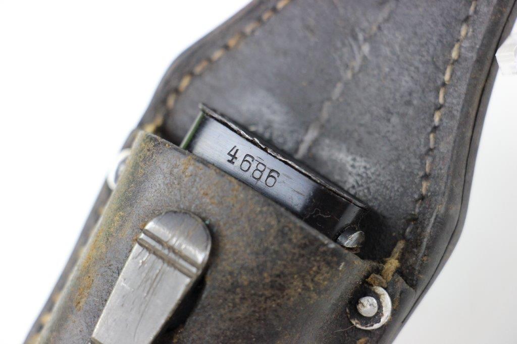 6/5/24 – This is an original, early WW2 production K98 bayonet. The bayonet comes with a matching numbered scabbard and leather frog. The bayonet blade is in great condition with most of the original blued finish intact. There’s light high edge wear and scabbard rub wear, as well as a few small areas of dark surface patina on one side of the blade. The base of the blade is maker stamped “S/245” for the maker Jetter & Scheerer (uncommon). The other side of the blade base is serial numbered. The edge shows light sharpening and use but is clean throughout. Great condition hand guard and pommel with mild finish thinning throughout. Correct, early wood handles. The scabbard has no dents and is in great condition with a matching serial number (4686c) and maker code. Some light patina and finish loss. The leather frog has a faint maker stamp and 1938 date on the backside. A few stitches are loose or missing, but most of the original stitching is excellent.
