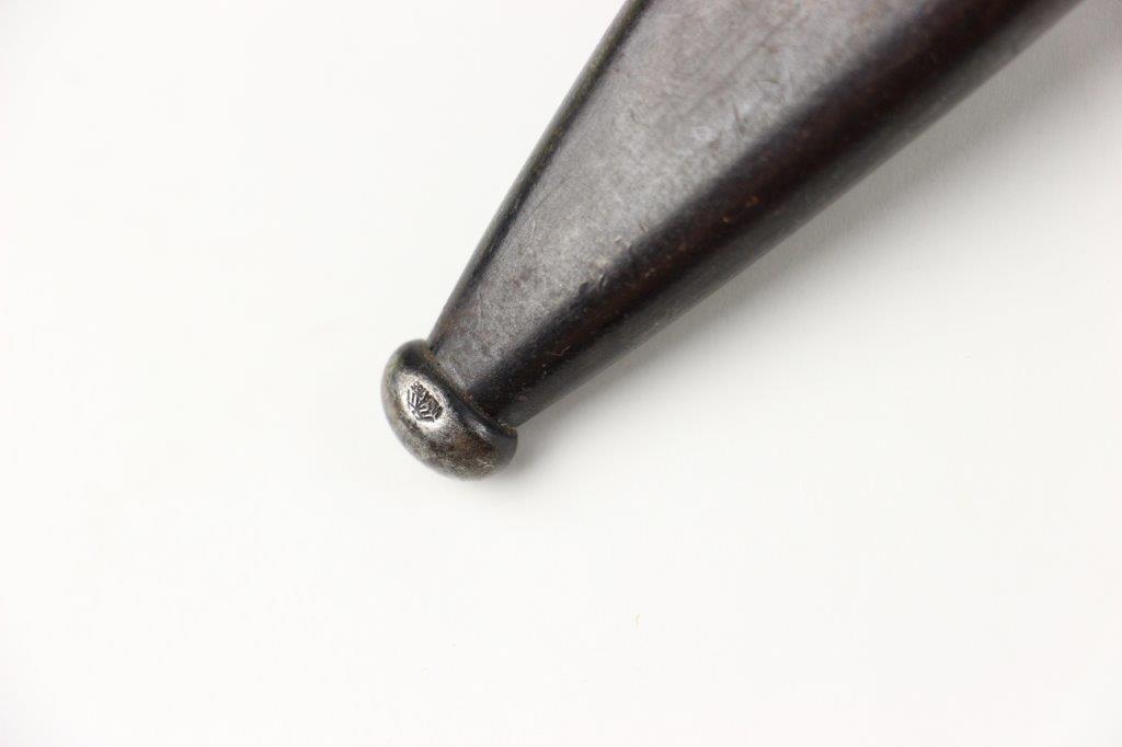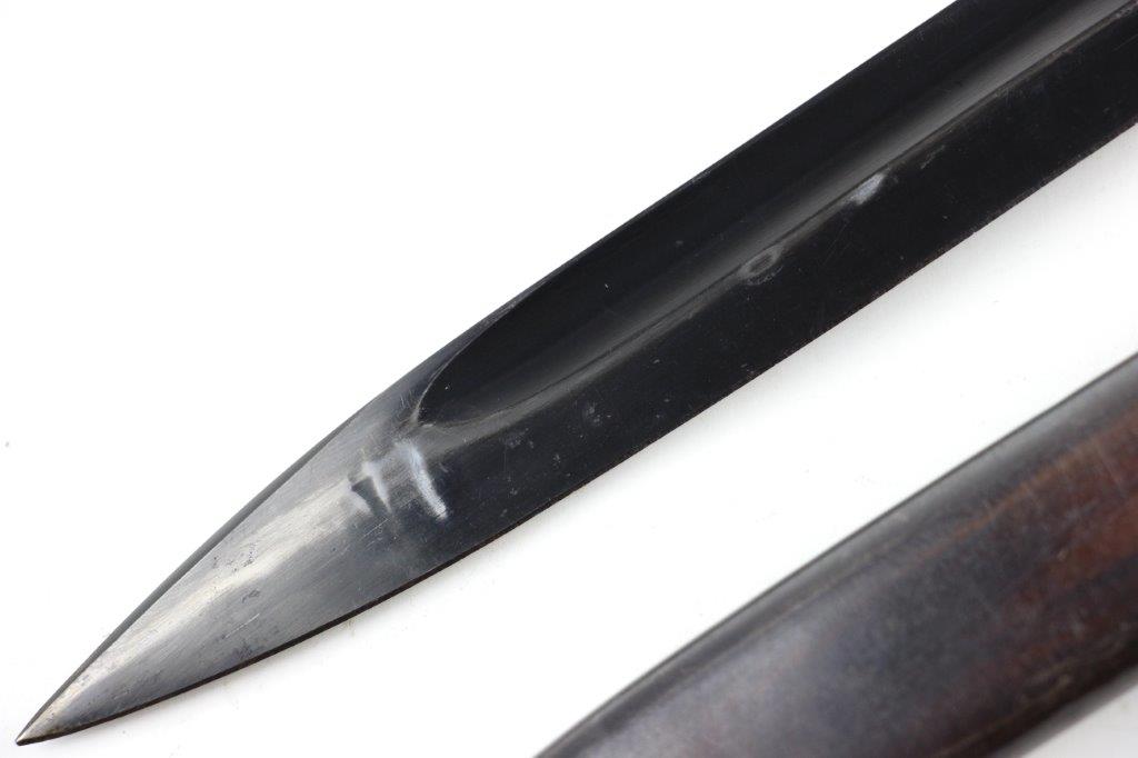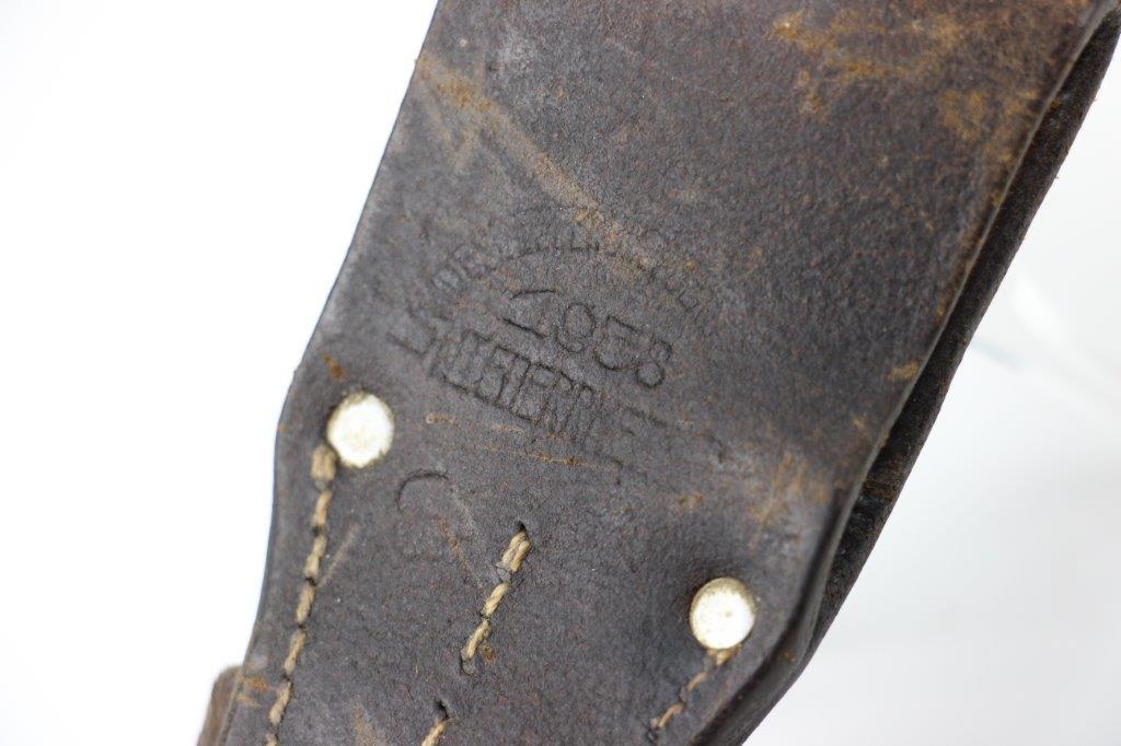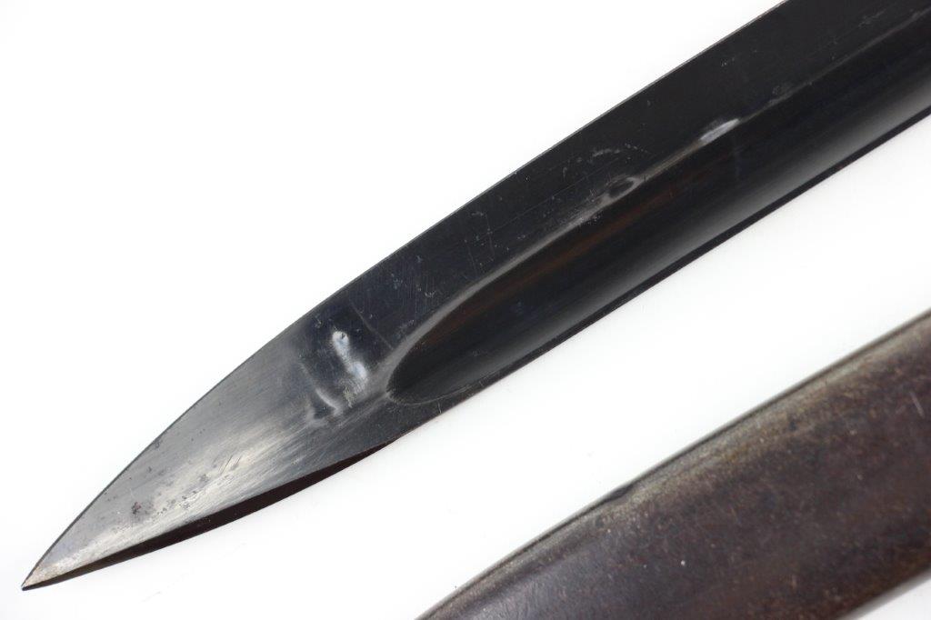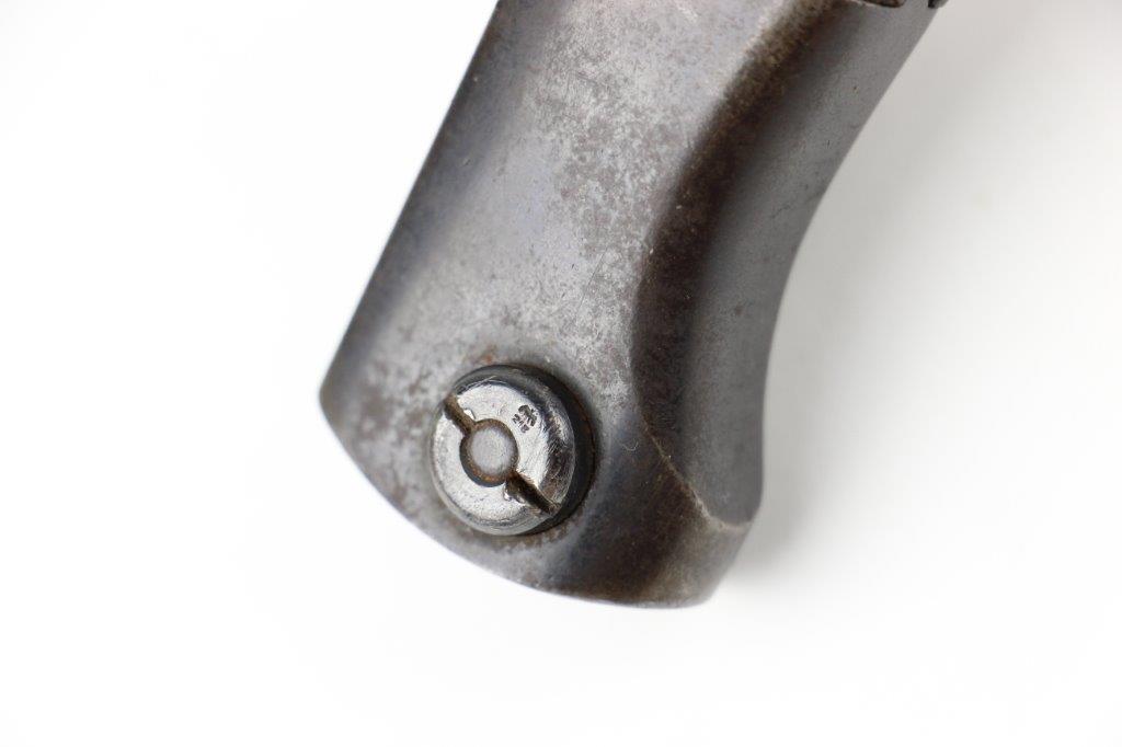 6/5/24 – This is an original, early WW2 production K98 bayonet. The bayonet comes with a matching numbered scabbard and leather frog. The bayonet blade is in great condition with most of the original blued finish intact. There’s light high edge wear and scabbard rub wear, as well as a few small areas of dark surface patina on one side of the blade. The base of the blade is maker stamped “S/245” for the maker Jetter & Scheerer (uncommon). The other side of the blade base is serial numbered. The edge shows light sharpening and use but is clean throughout. Great condition hand guard and pommel with mild finish thinning throughout. Correct, early wood handles. The scabbard has no dents and is in great condition with a matching serial number (4686c) and maker code. Some light patina and finish loss. The leather frog has a faint maker stamp and 1938 date on the backside. A few stitches are loose or missing, but most of the original stitching is excellent.