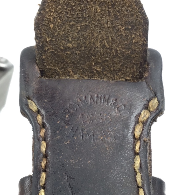 6/14/21 – Excellent condition 1936 dated sling for a Mauser K98 rifle. Maker and date stamped. Maker “KROYMann & Co.” Approximately 30% of the herringbone texture still remains. Strong original stitching. Nice brown color.