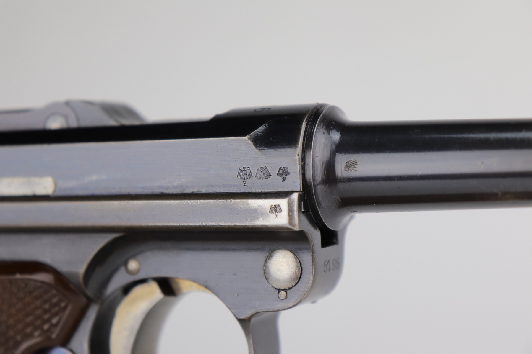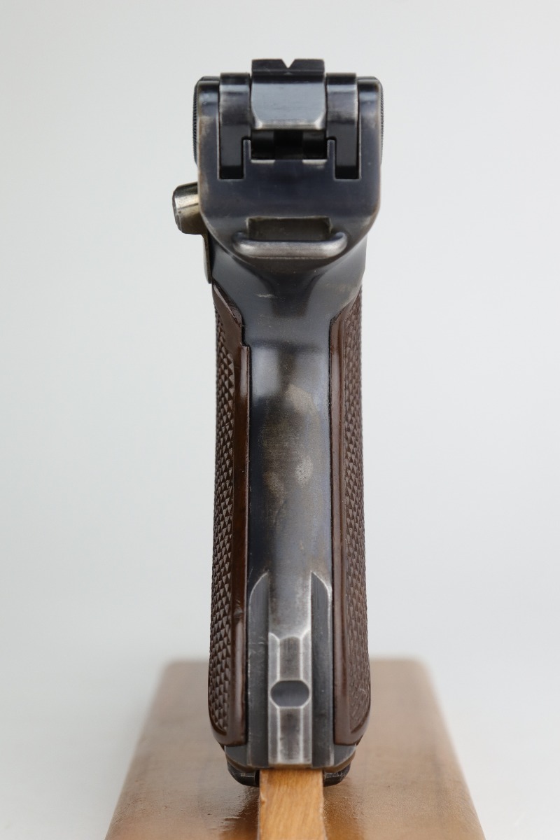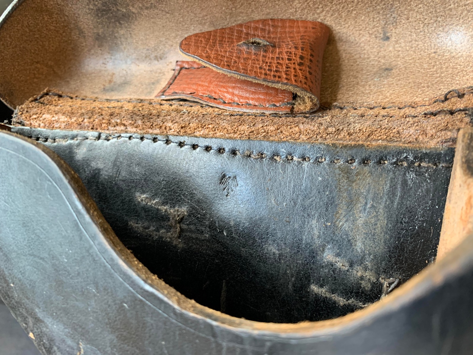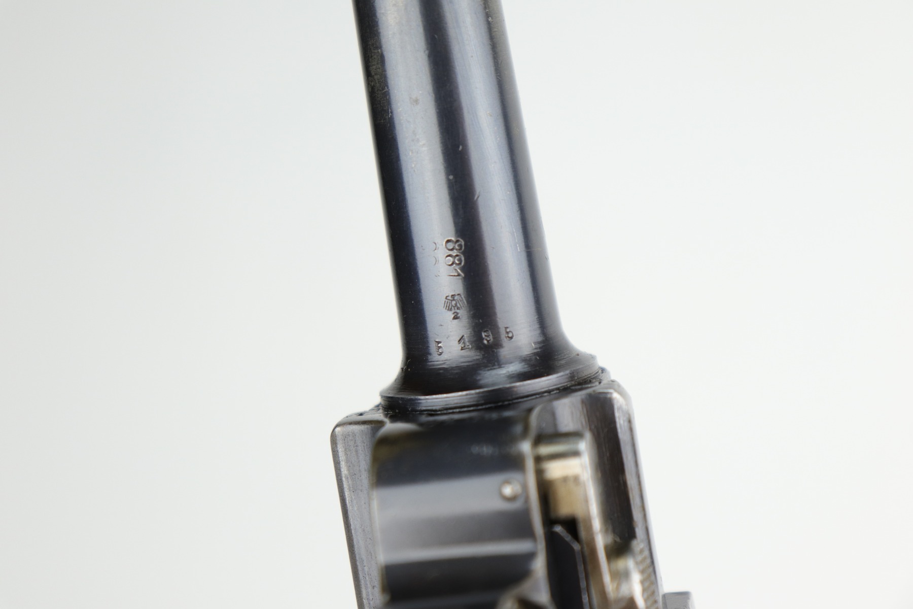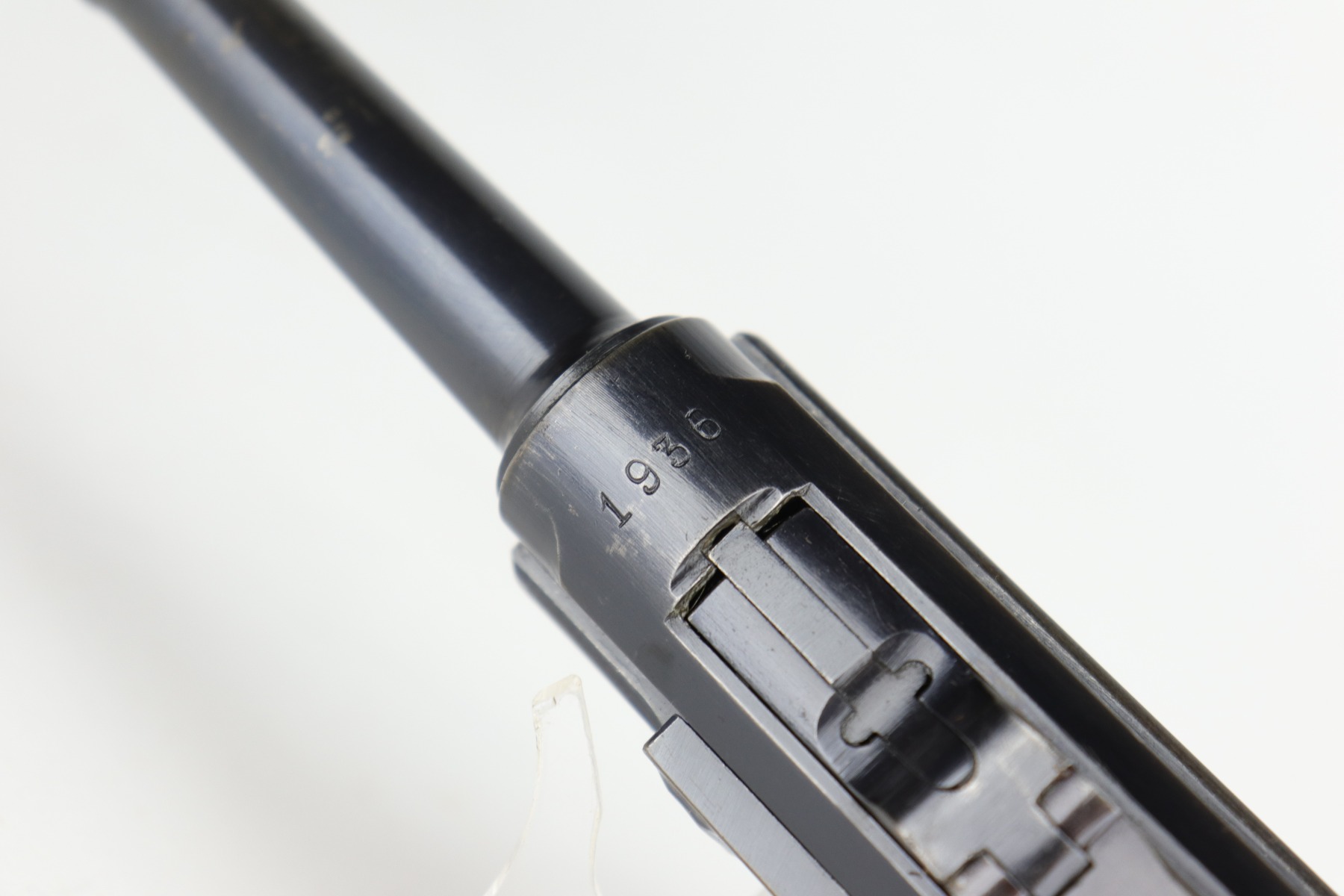 12/10/20 – This is a nice example of a Krieghoff Luger rig issued to the Nazi Luftwaffe in 1936. There were a little over 2,500 of these particular guns manufactured. The gun is dated 1936, has the Krieghoff logo on the toggle, and has the proper “Eagle L2” military acceptance proofs. The rig comes with a Krieghoff holster. The gun is all matching and has retained roughly 80% of its finish. Most of the finish loss is on the side plate, around the muzzle, and on the barrel. There is also high edge wear on the frame and spotty wear/discoloration on both straps. There are a few light surface scratches here and there. The bore is very nice – strong rifling with just minor pin-pricking in the grooves. There is a Krieghoff marking on the back of the holster that we’ve never seen before. But it does have black stitching and an “Eagle L2” proof on the inside.