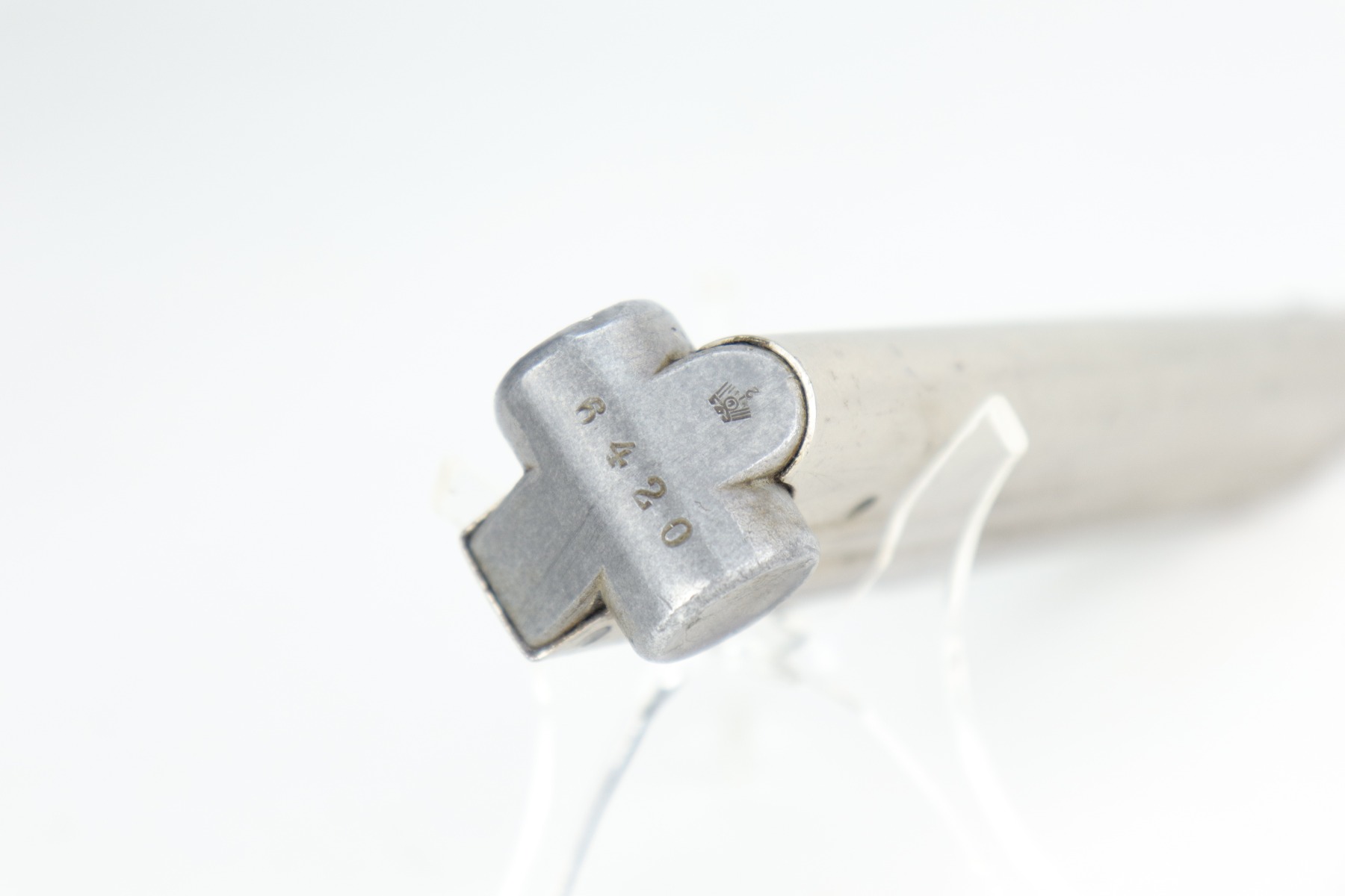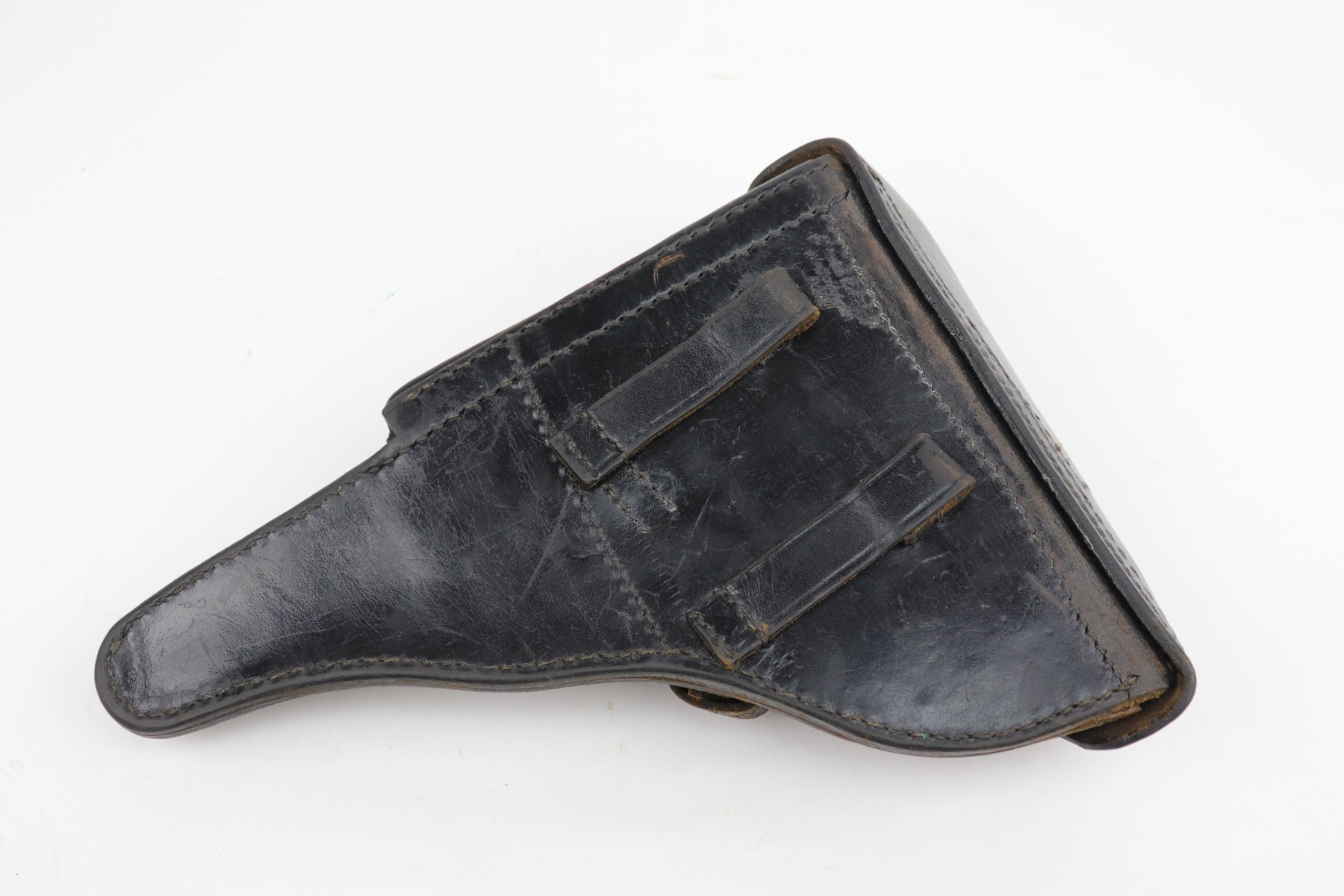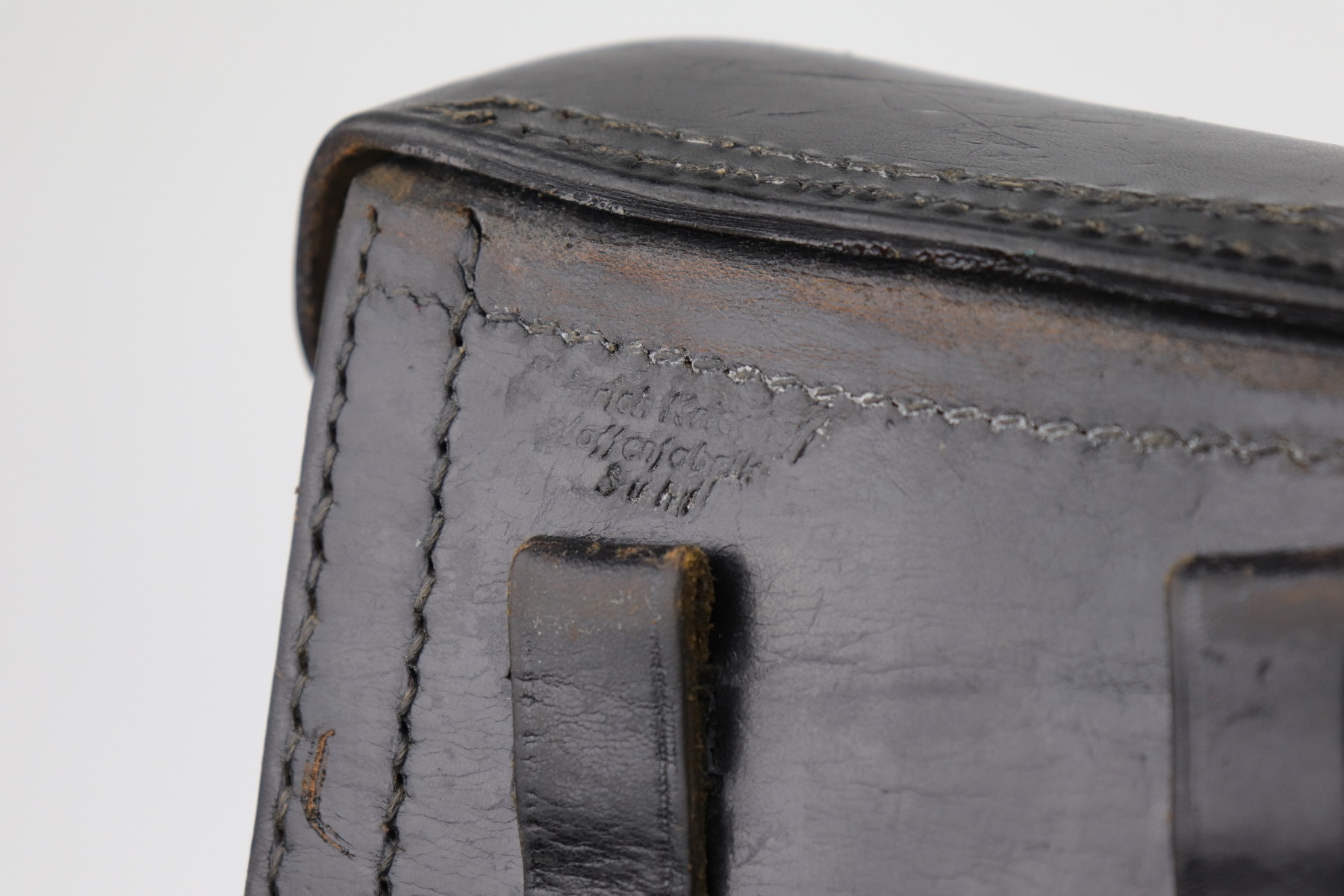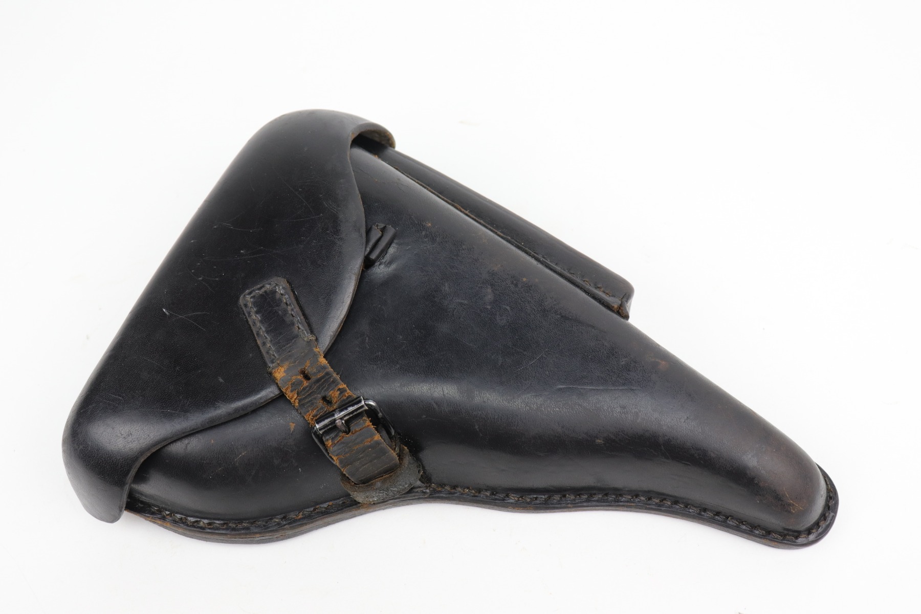 12/10/20 – This is a nice example of a Krieghoff Luger rig issued to the Nazi Luftwaffe in 1936. There were a little over 2,500 of these particular guns manufactured. The gun is dated 1936, has the Krieghoff logo on the toggle, and has the proper “Eagle L2” military acceptance proofs. The rig comes with a Krieghoff holster. The gun is all matching and has retained roughly 80% of its finish. Most of the finish loss is on the side plate, around the muzzle, and on the barrel. There is also high edge wear on the frame and spotty wear/discoloration on both straps. There are a few light surface scratches here and there. The bore is very nice – strong rifling with just minor pin-pricking in the grooves. There is a Krieghoff marking on the back of the holster that we’ve never seen before. But it does have black stitching and an “Eagle L2” proof on the inside.