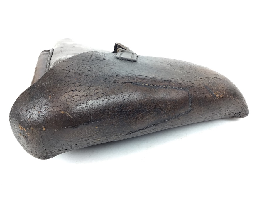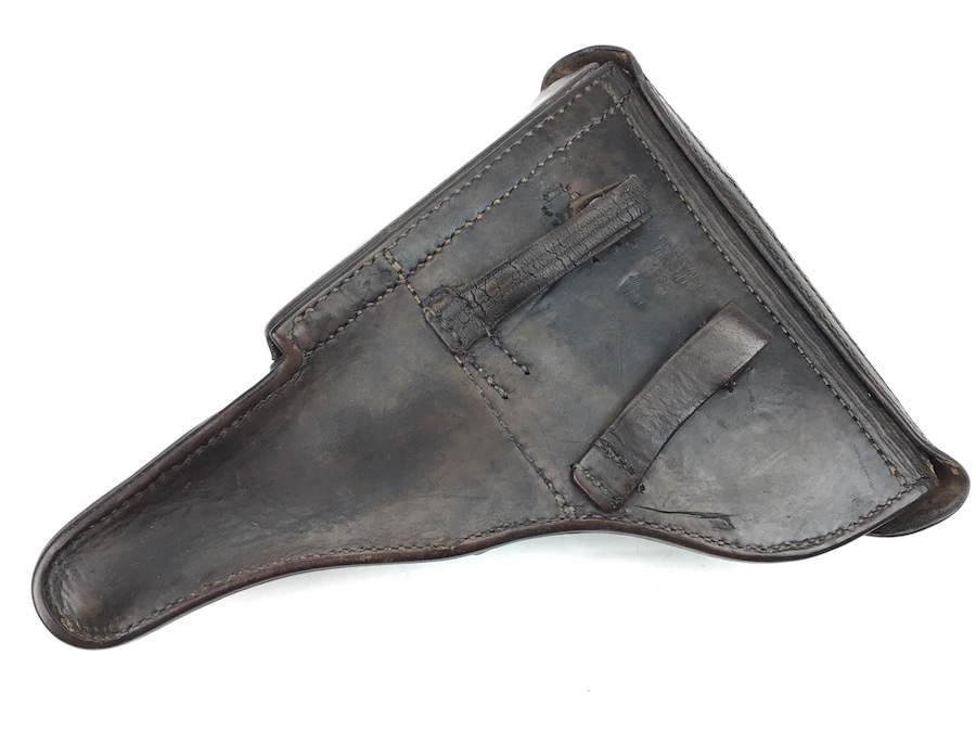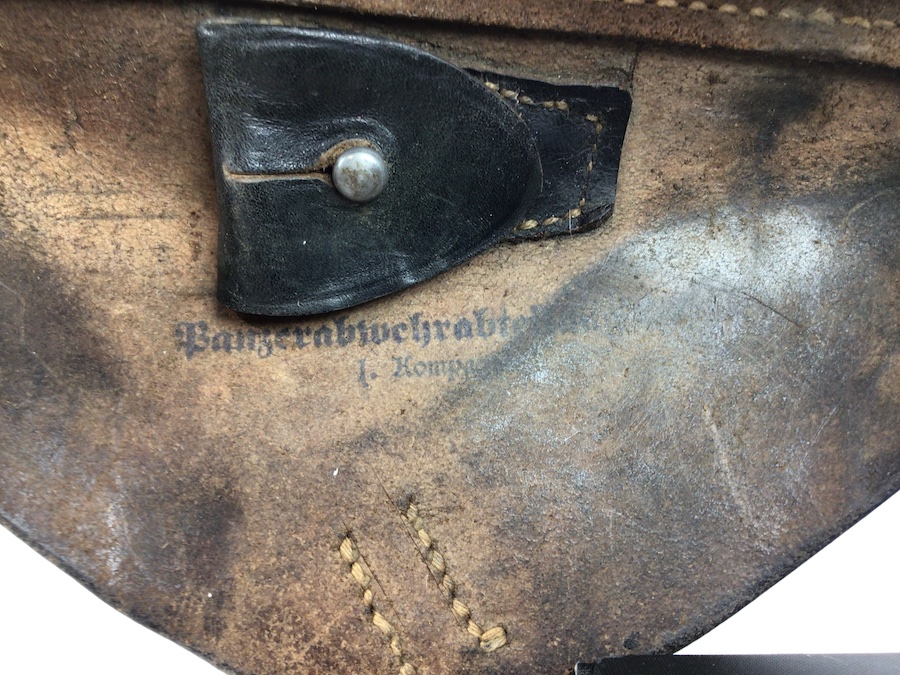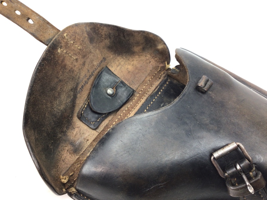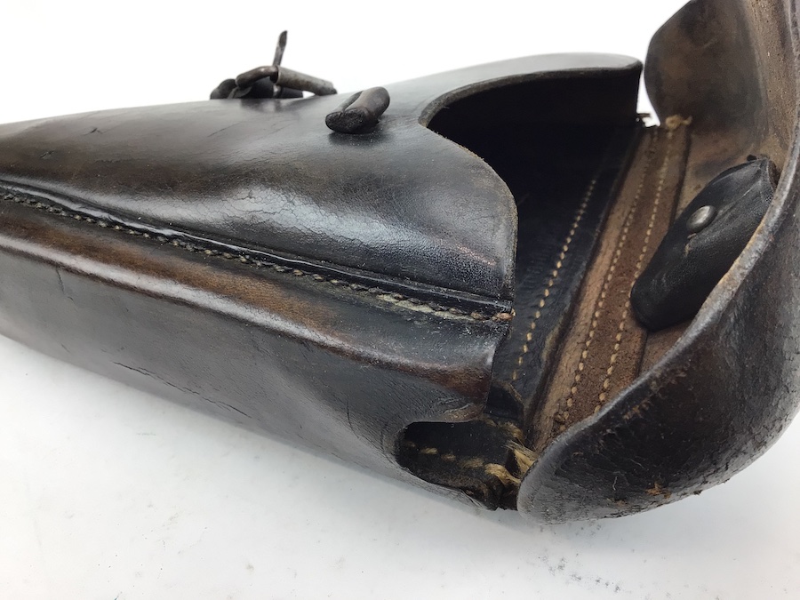 6/10/21 – Original 1936 Luger holster. Good leather and secure, intact stitching. Maker and date stamped on the back along with a military waffen stamp WaA101. The left belt loop has been repaired with a rivet. Original German ink stamp by the tool pouch stating “anti-tank department I company”. Clean interior and secure lift strap.