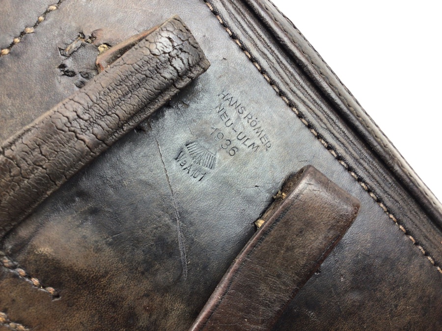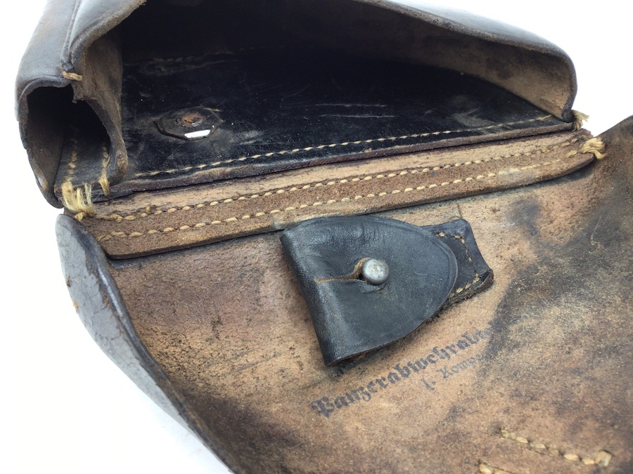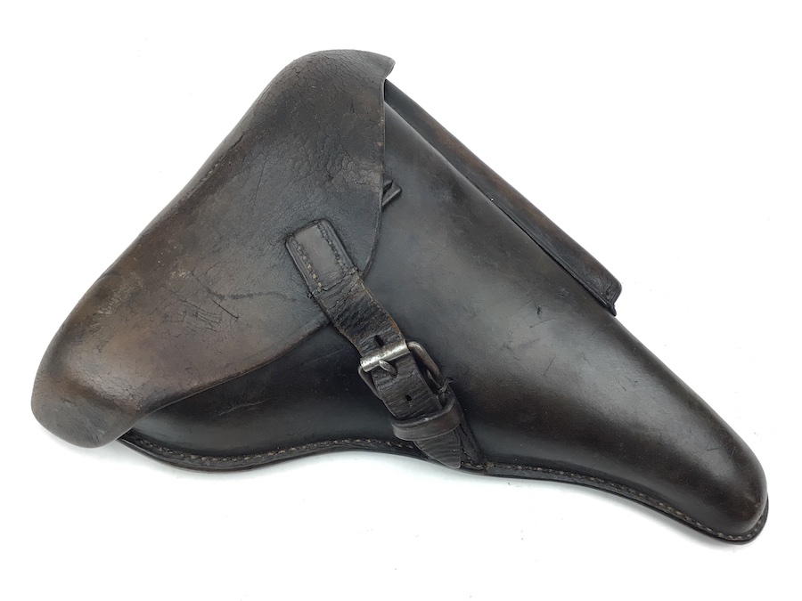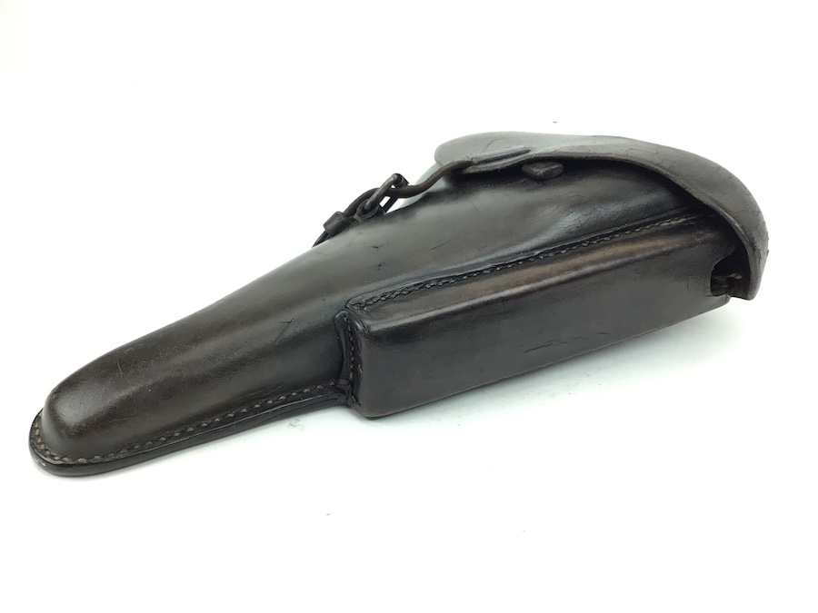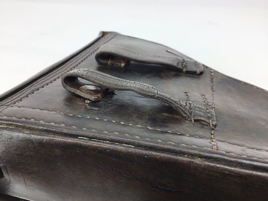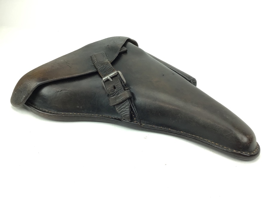 6/10/21 – Original 1936 Luger holster. Good leather and secure, intact stitching. Maker and date stamped on the back along with a military waffen stamp WaA101. The left belt loop has been repaired with a rivet. Original German ink stamp by the tool pouch stating “anti-tank department I company”. Clean interior and secure lift strap.