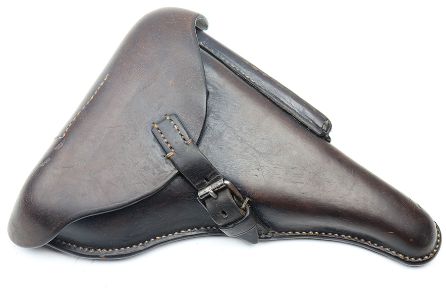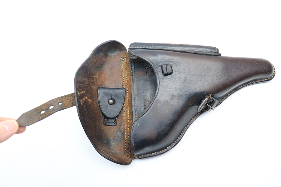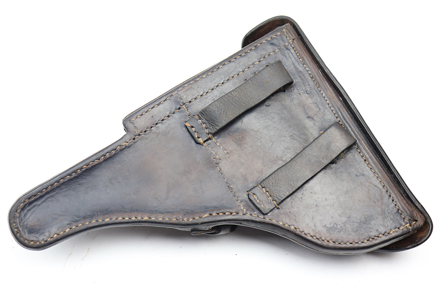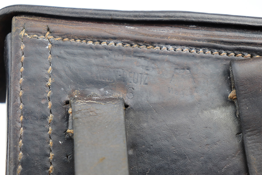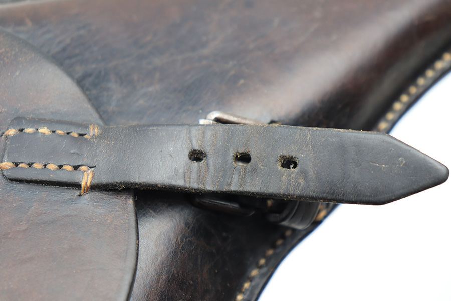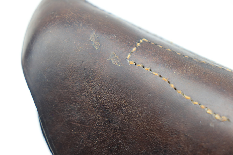 4/13/22 – This is an original 1936 dated Luger holster from early / pre WW2. The holster is maker stamped, dated, and waffen proof stamped on the back leather. The stamps are very faint, but still visible in the right lighting. The leather is soft and pliable but the overall shape is very nice. The leather was once black, but most of the black finish is worn so the remaining color is dark brown. No stitching issues and clean interior leather.