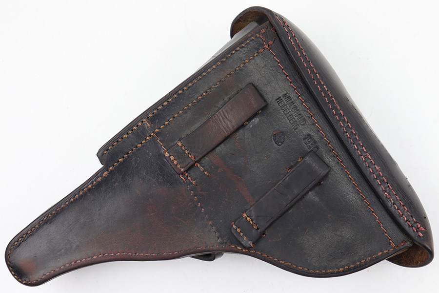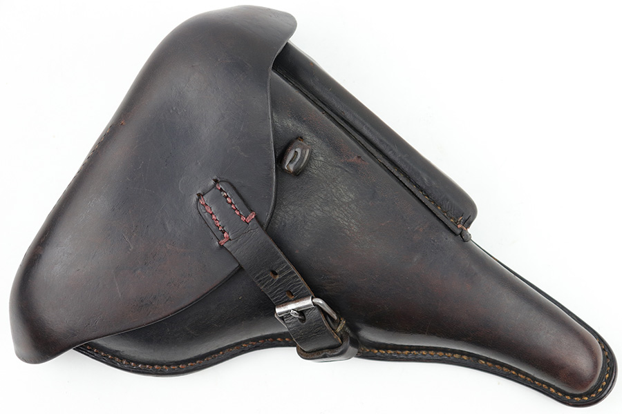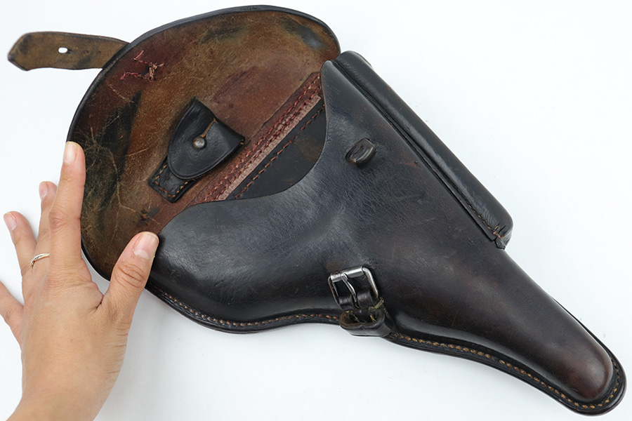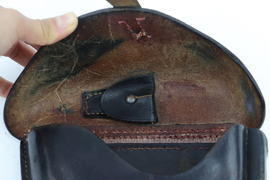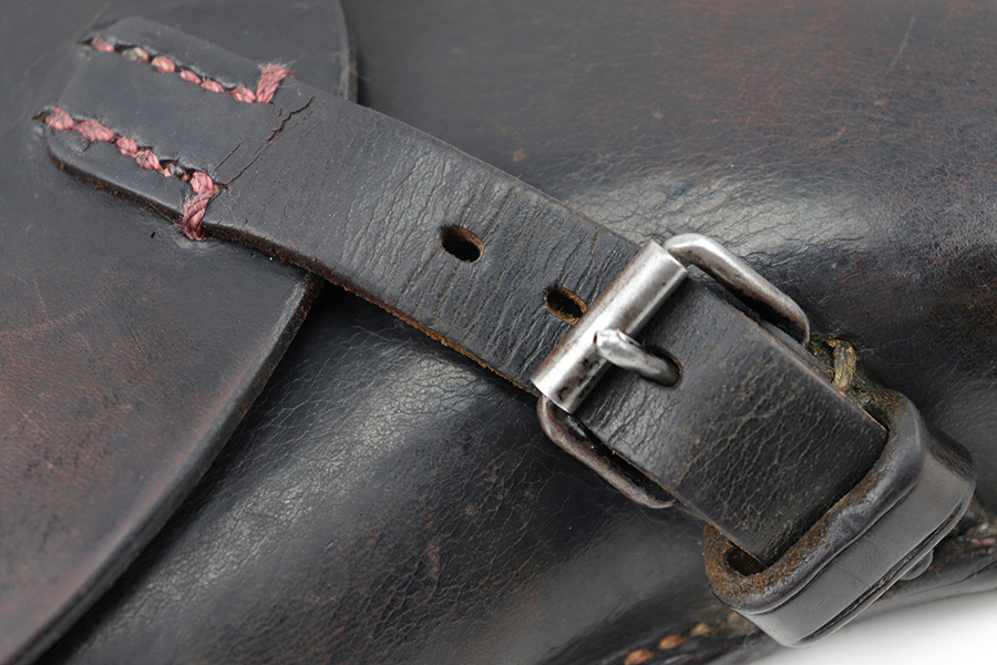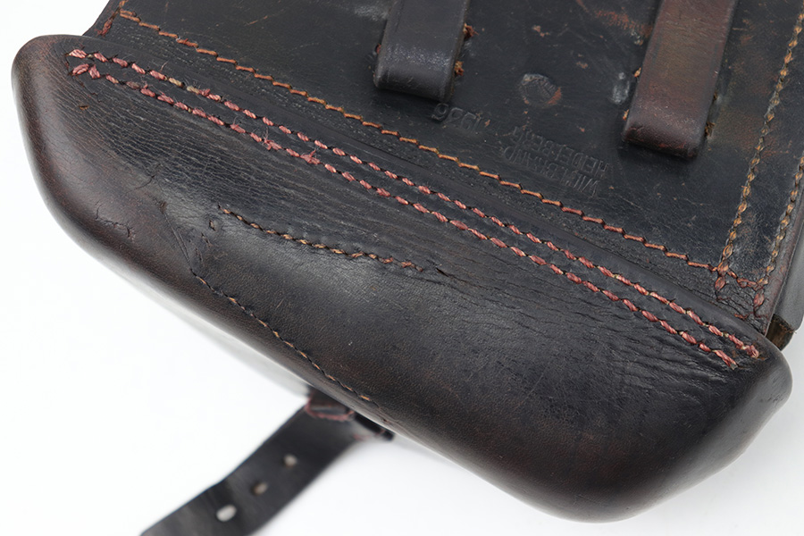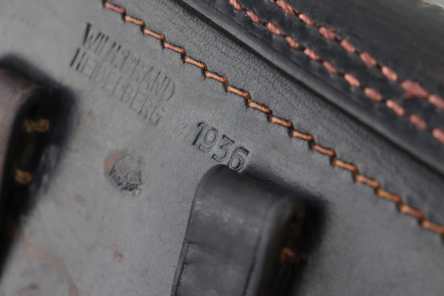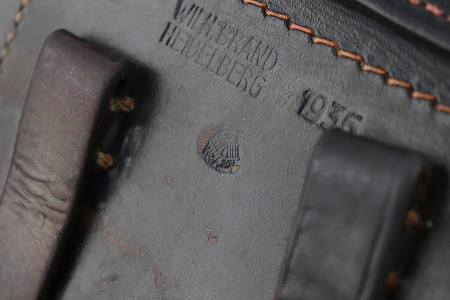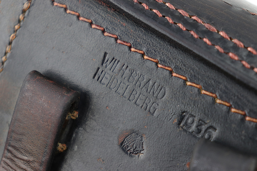 5/18/23 – This is an original 1936 dated Luger holster from WW2. The holster is in great condition with very nice black dyed leather and all stitching tight and intact. Our suspicion is the stitching throughout this example is replacement. The color of the stitching on the lid and front closure strap is unusual, and although none of the stitching glows under a black light, we doubt this is factory original. Price reduced accordingly. The leather has normal signs of use and aging with light pliability. The front leather has fading dye mostly near the toe, and on areas of the back leather. Maker stamped, date stamped, and waffen military proof stamped on the back leather with crisp markings.