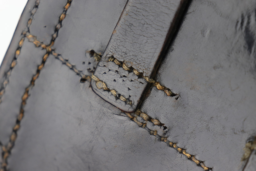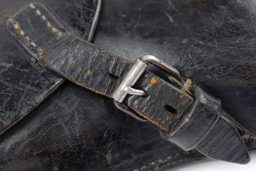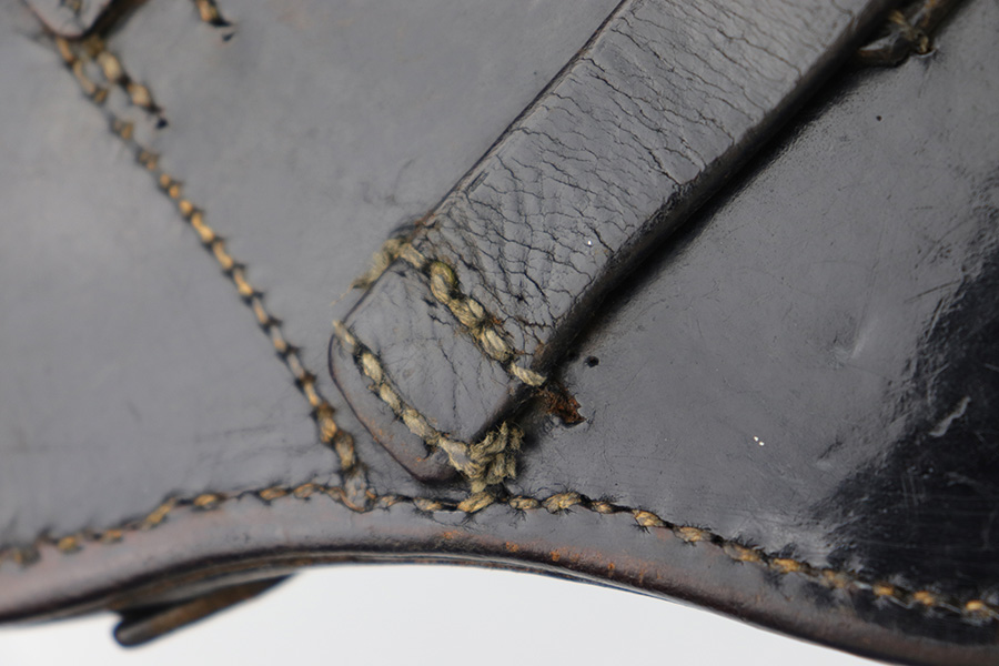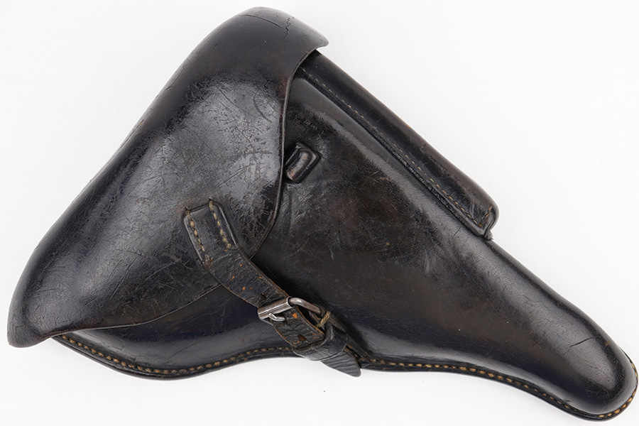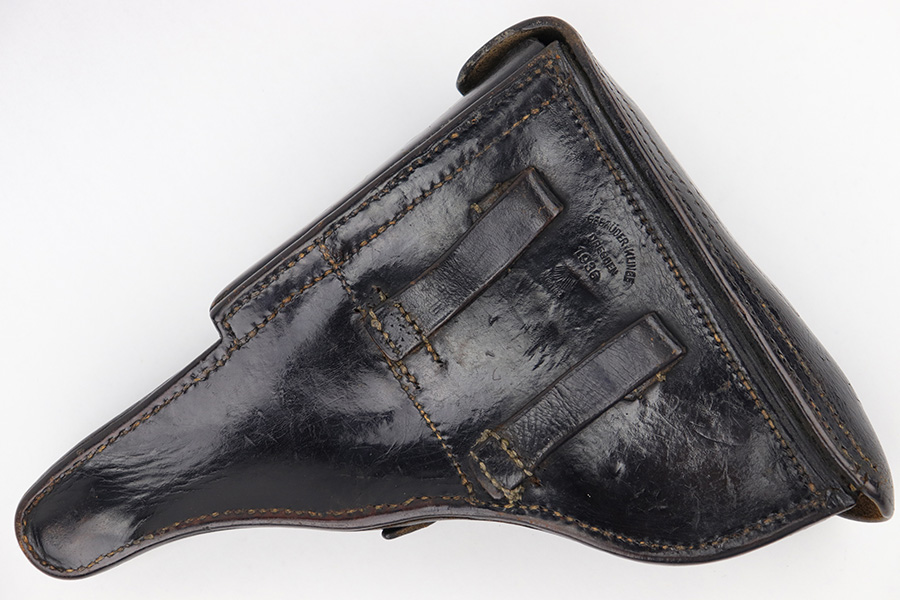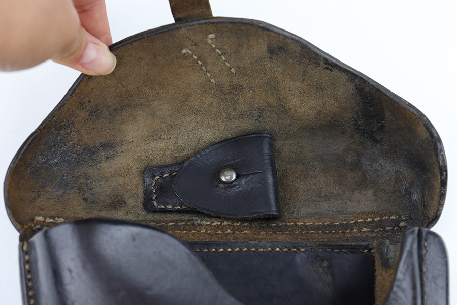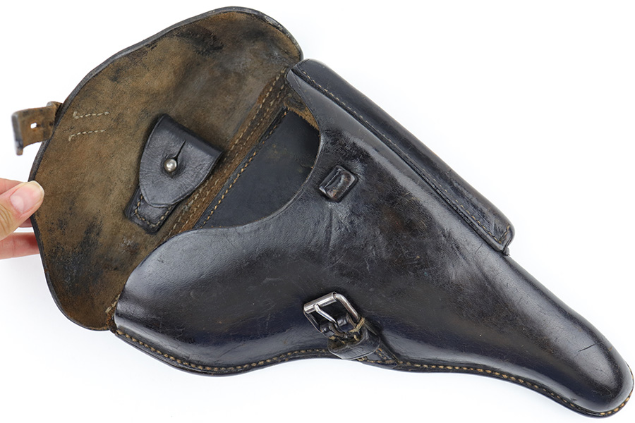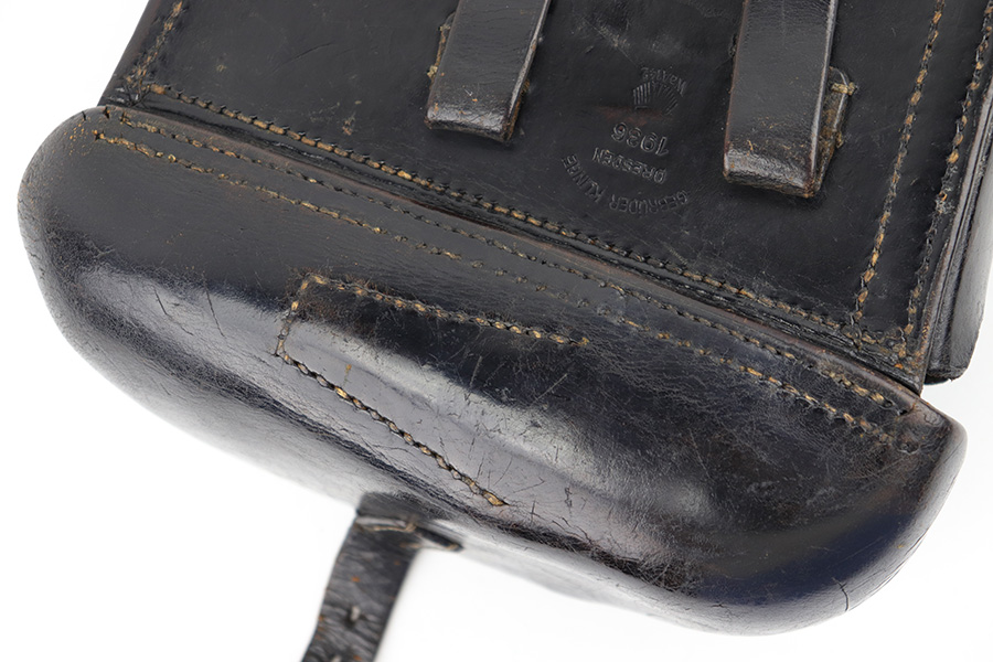 6/14/23 – This is a very nice, straightforward example of a 1936 production Luger holster. The holster is in great overall condition with typical surface wear and scuffing throughout the exterior leather. Normal pliability and signs of previous use with no excessive damage. The closure strap has some light surface wrinkling and mild cracking but is completely intact. There are a few loose stitches along the top leather where the lid and body are attached, but this is mild and doesn’t affect functionality. The stitching is all original and in great shape.