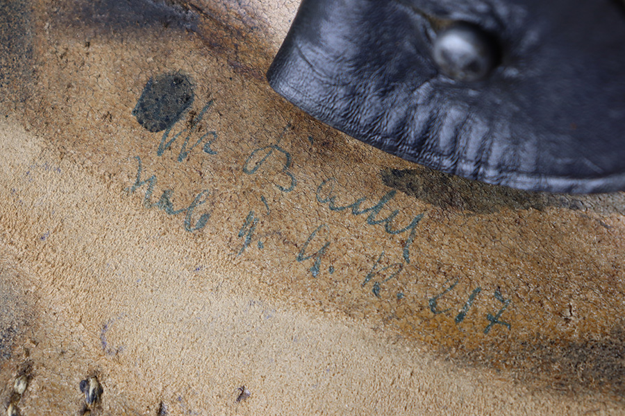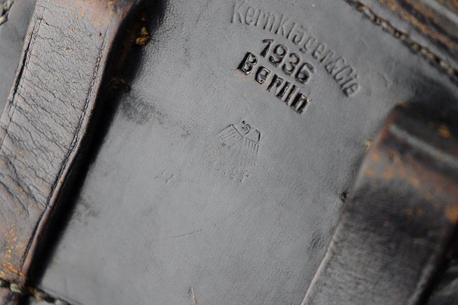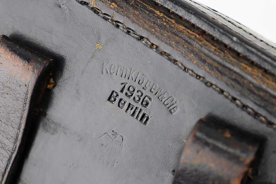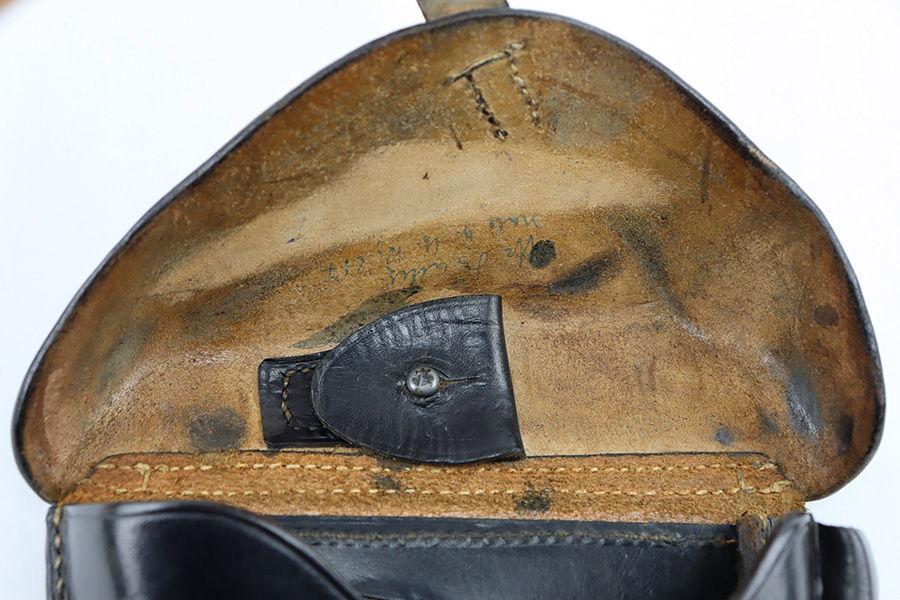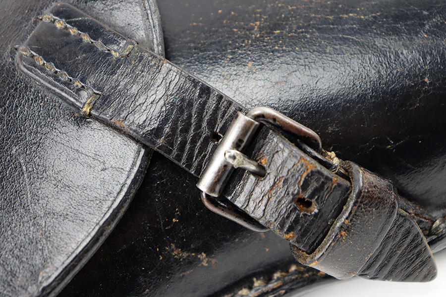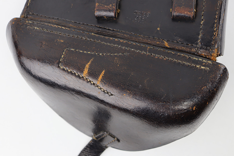 8/29/23 – This is an original 1936 dated Luger holster from early WW2. The holster is stamped with a maker, date, and waffen military proof stamp. The waffen proof is slightly faded with age, but overall the stamps are crisp. The black leather is in great shape with mild pliability and some minor exterior wrinkling and surface scuffing. The interior leather is fairly clean with mild signs of use. All original stitching is tight and intact throughout.