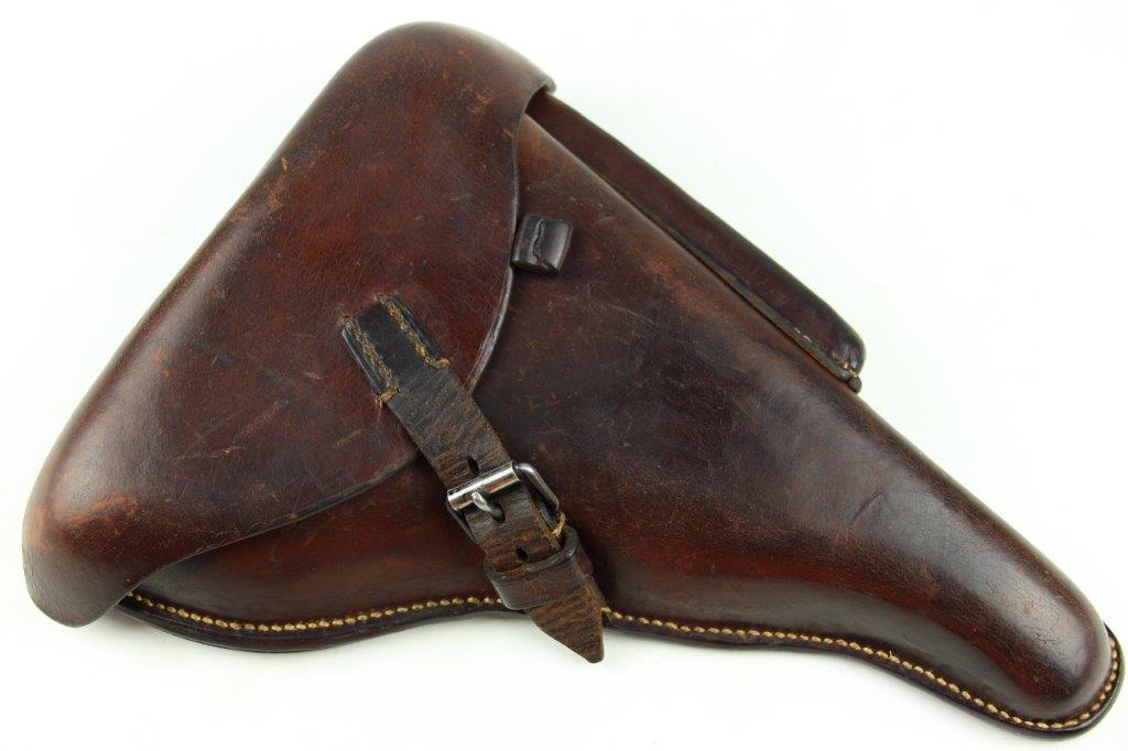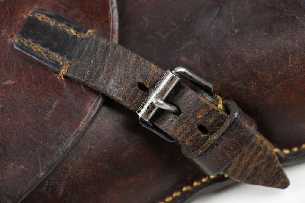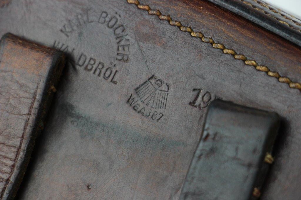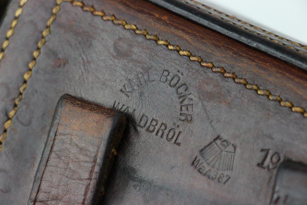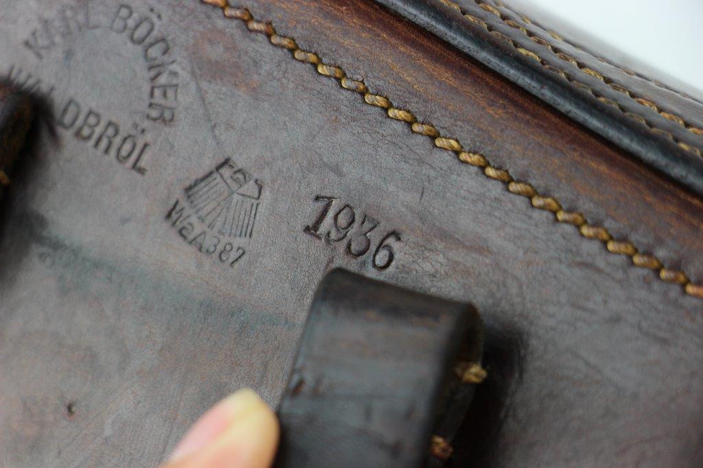 7/9/24 – This is a great condition example, early WW2 production Luger holster. The holster features crisp markings on the back leather including: Karl Bocker maker stamp with visible umlauts, droop-winged military eagle proof stamp, and 1936 date stamp. The exterior leather is reddish brown colored with mild surface wrinkling and handling wear. There’s light scuffs and mild areas of discoloration as shown. Normal pliability and use wear on the interior leather. Excellent, all original stitching throughout.