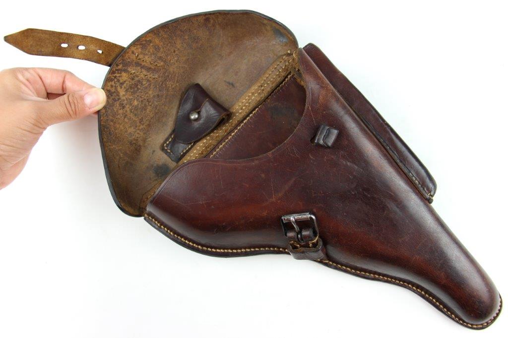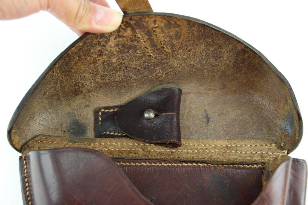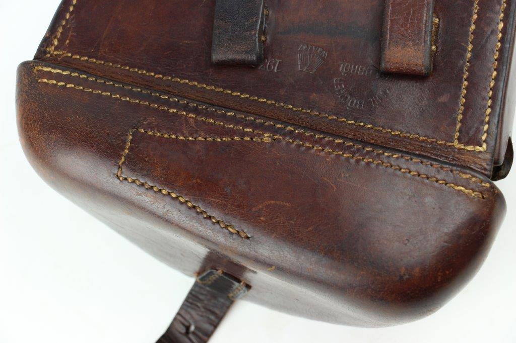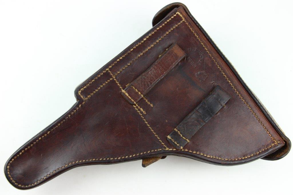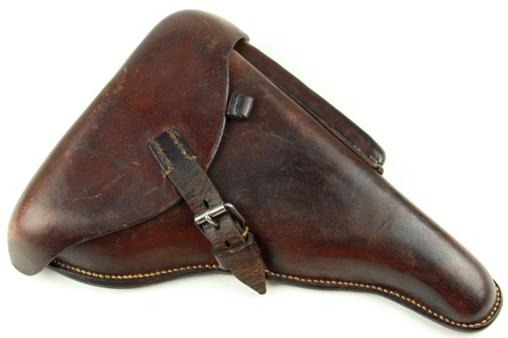 7/9/24 – This is a great condition example, early WW2 production Luger holster. The holster features crisp markings on the back leather including: Karl Bocker maker stamp with visible umlauts, droop-winged military eagle proof stamp, and 1936 date stamp. The exterior leather is reddish brown colored with mild surface wrinkling and handling wear. There’s light scuffs and mild areas of discoloration as shown. Normal pliability and use wear on the interior leather. Excellent, all original stitching throughout.