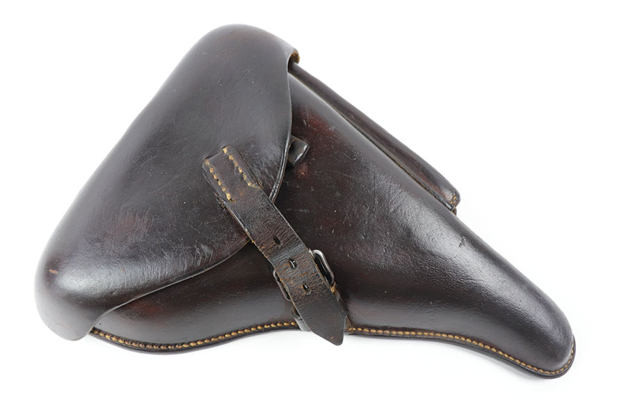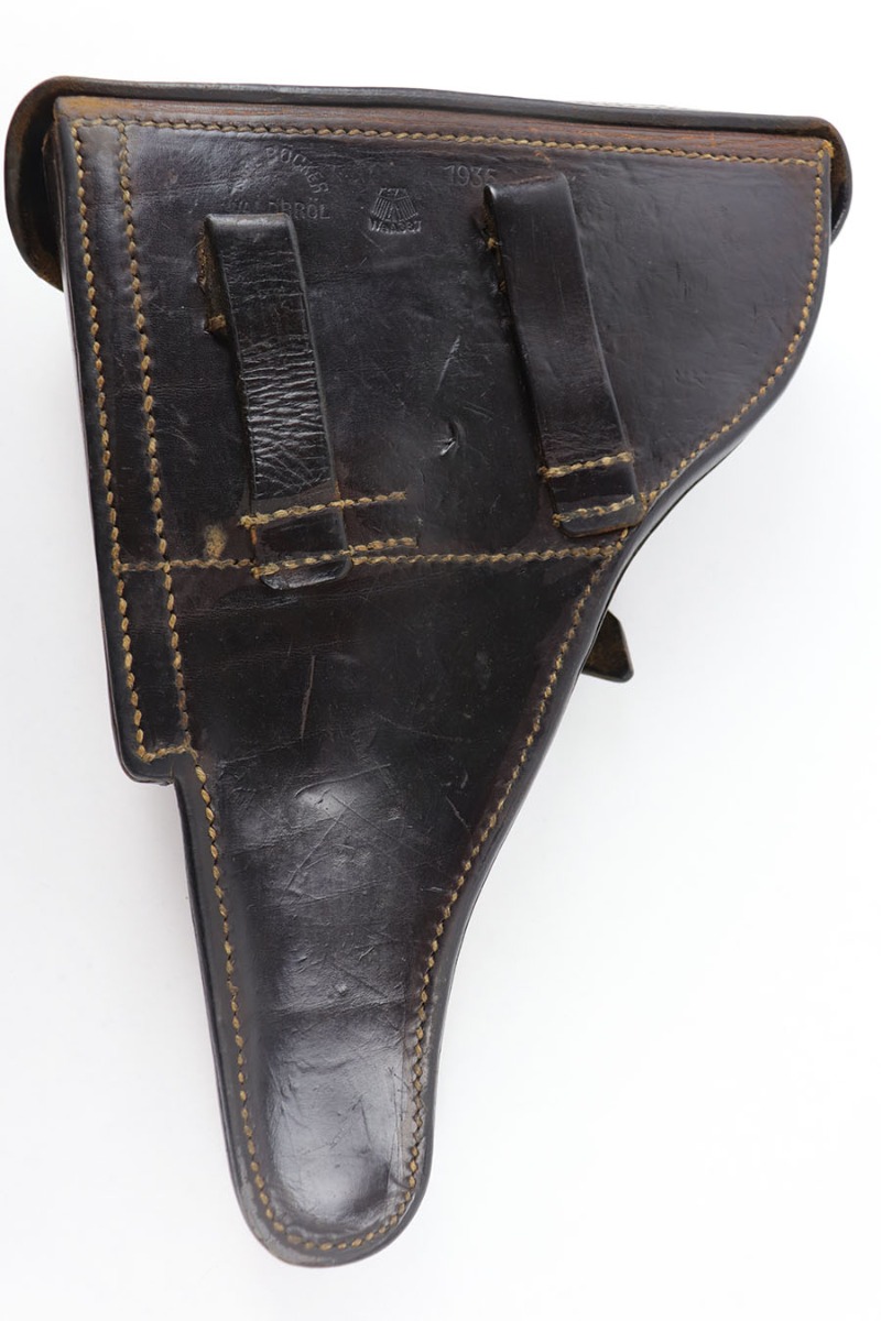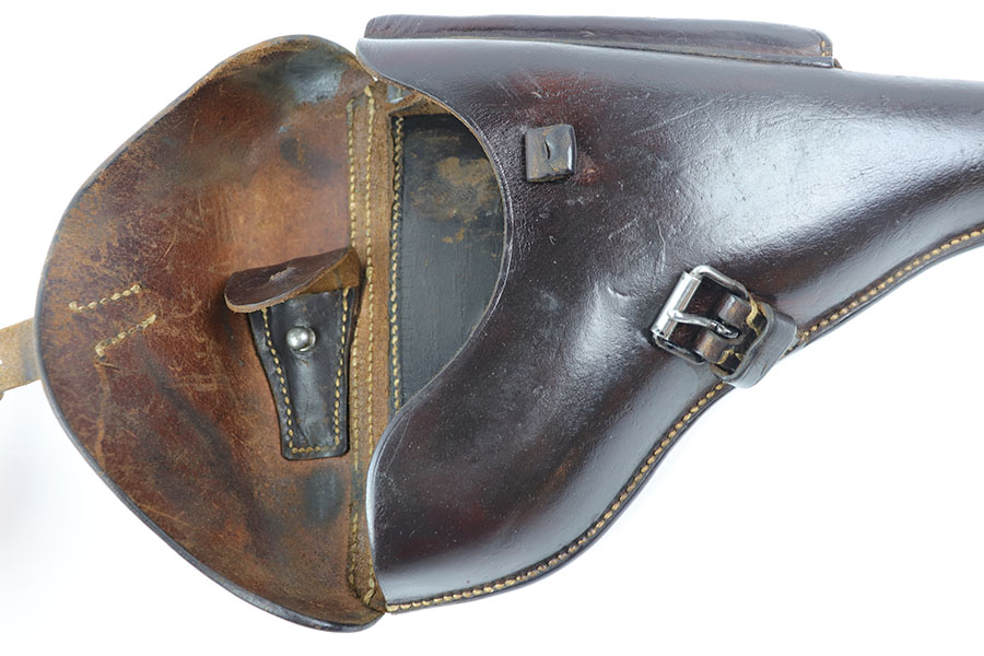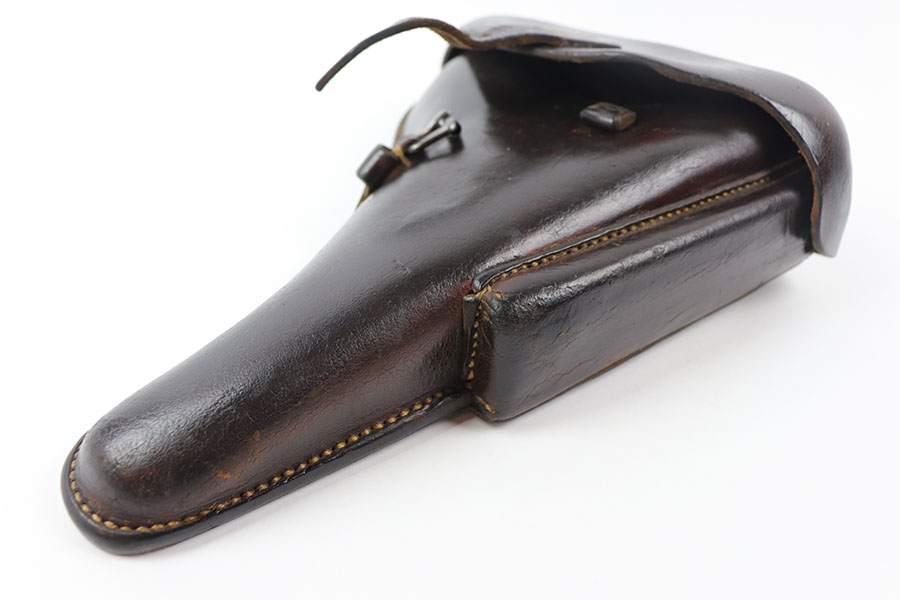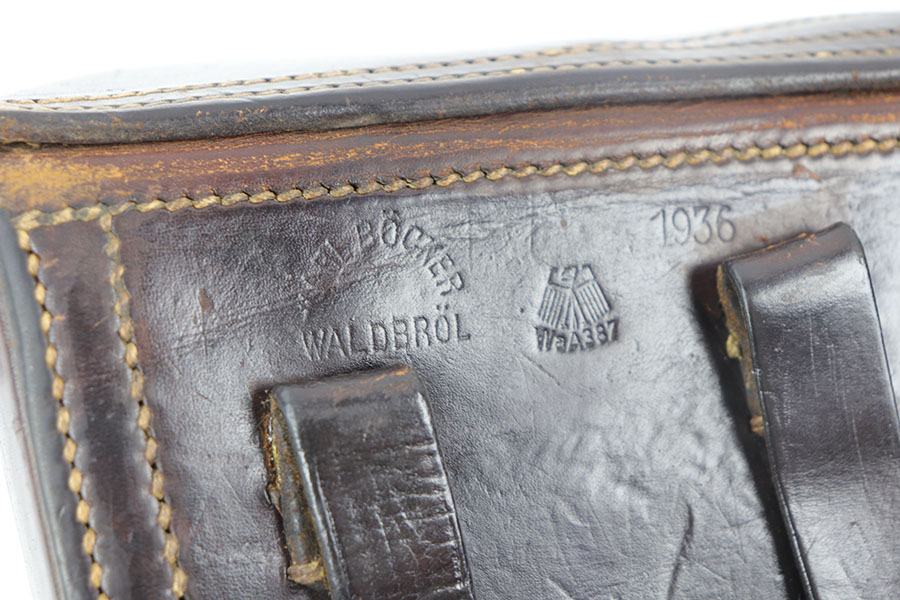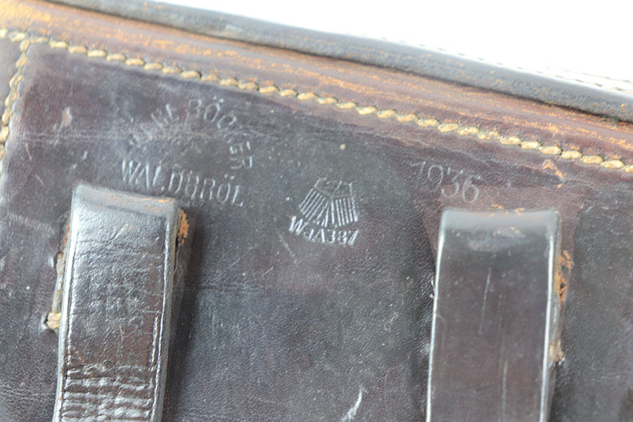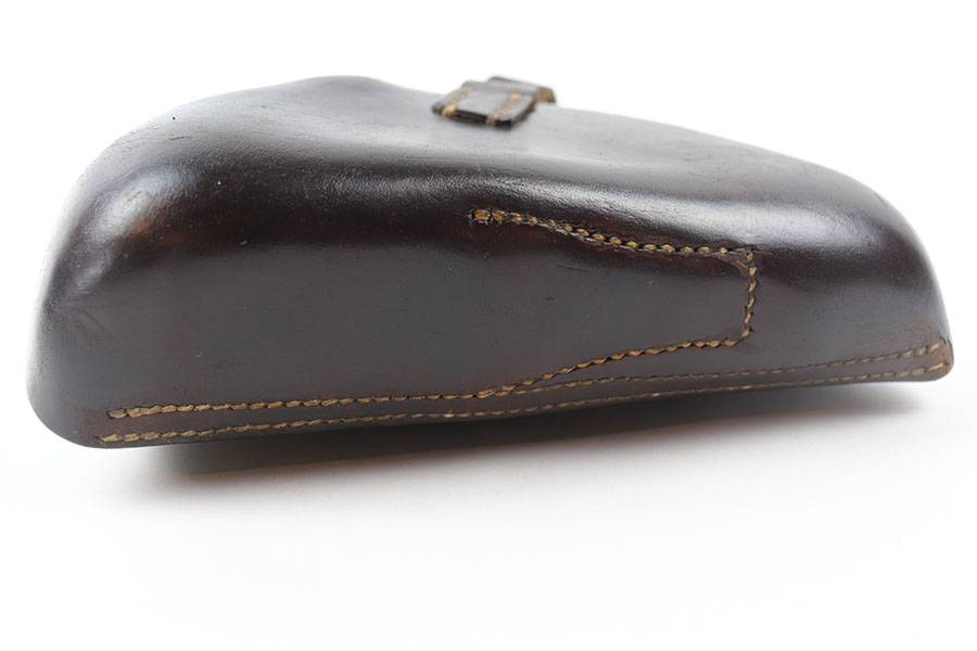 8/18/20 – This is an original 1936 dated luger holster from WW2. The holster is in great shape overall with nice semi-reddish brown leather. The leather is soft and pliable but holds shape nicely. Some normal exterior aging / wrinkling on the leather but nothing excessive. Stitching all original and in tact. Shows signs of use, but a fairly clean interior. Nicely stamped on the back leather with a date, maker, and waffen proof.