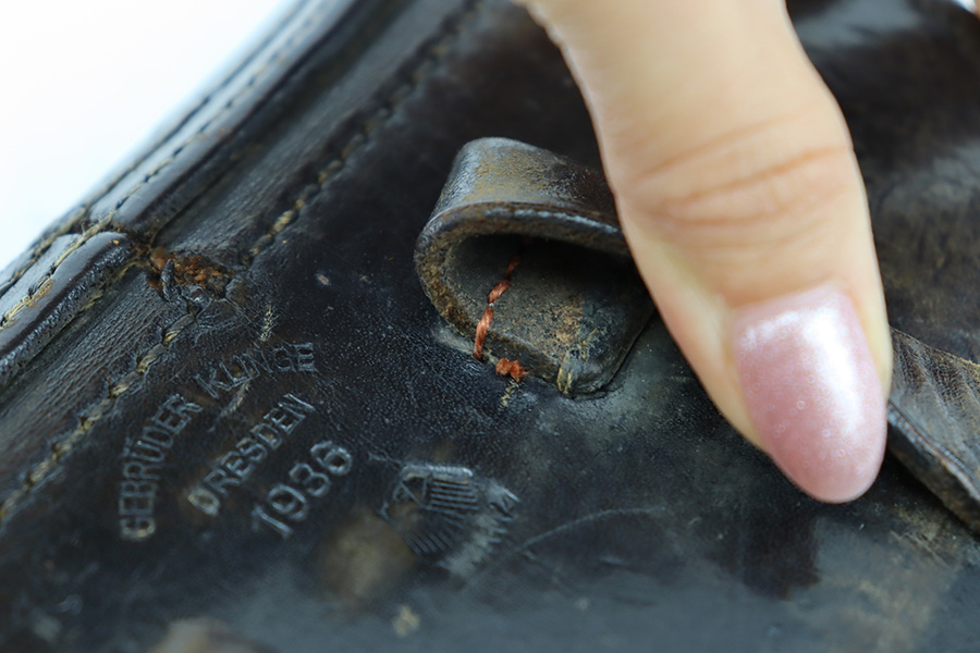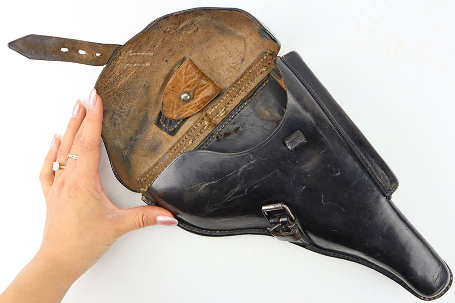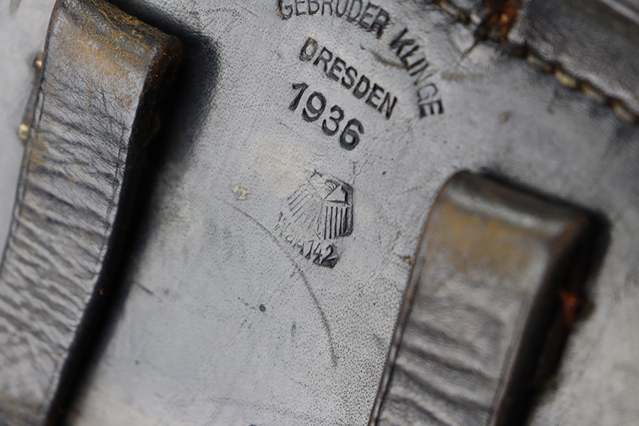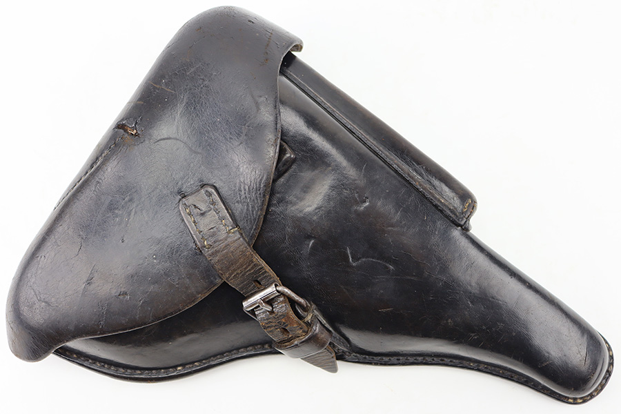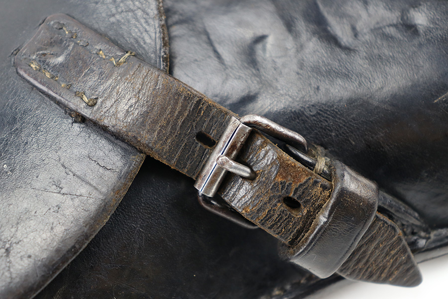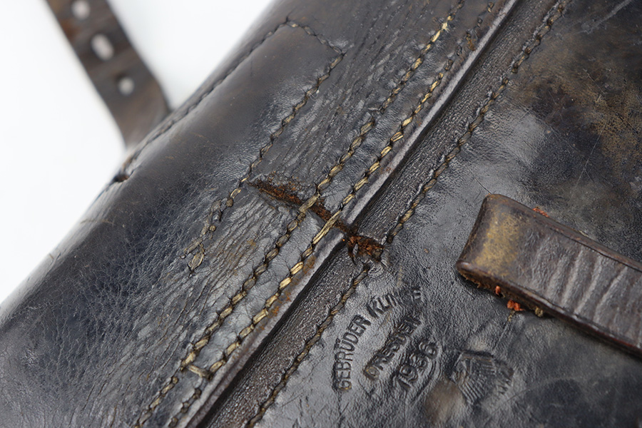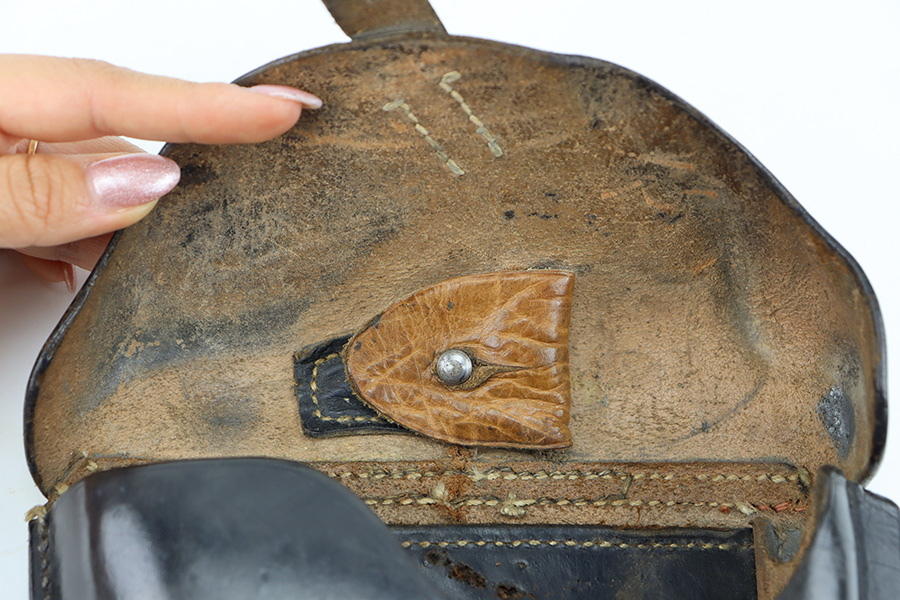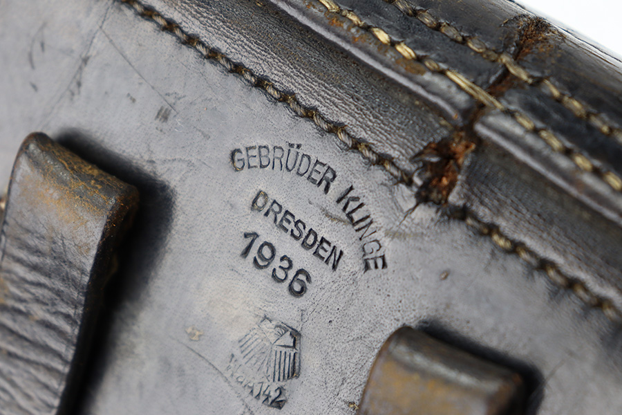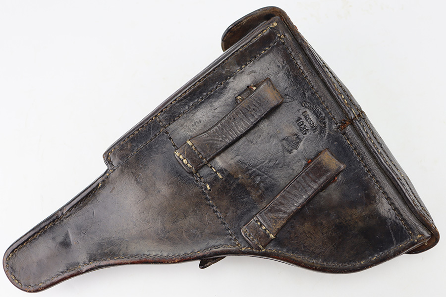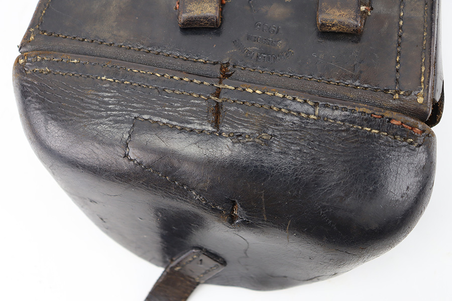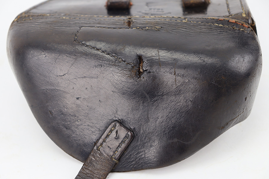 12/29/23 – This is an original 1936 dated Luger holster from WW2. This is an interesting example because of the gash / damage on the top of the lid and back spine area of the holster. There’s stitching over the gash that extends through the joint of the holster, which suggests this was period repaired. The stitching is in great condition overall, with some different colored stitches on the back leather but this is minor. The leather is in great shape with mild pliability and normal signs of use and aging. An example that definitely saw “battle action”.