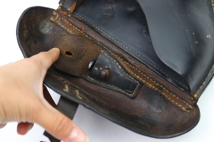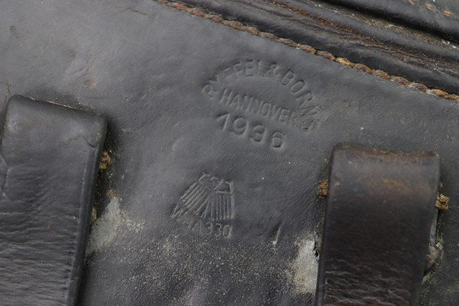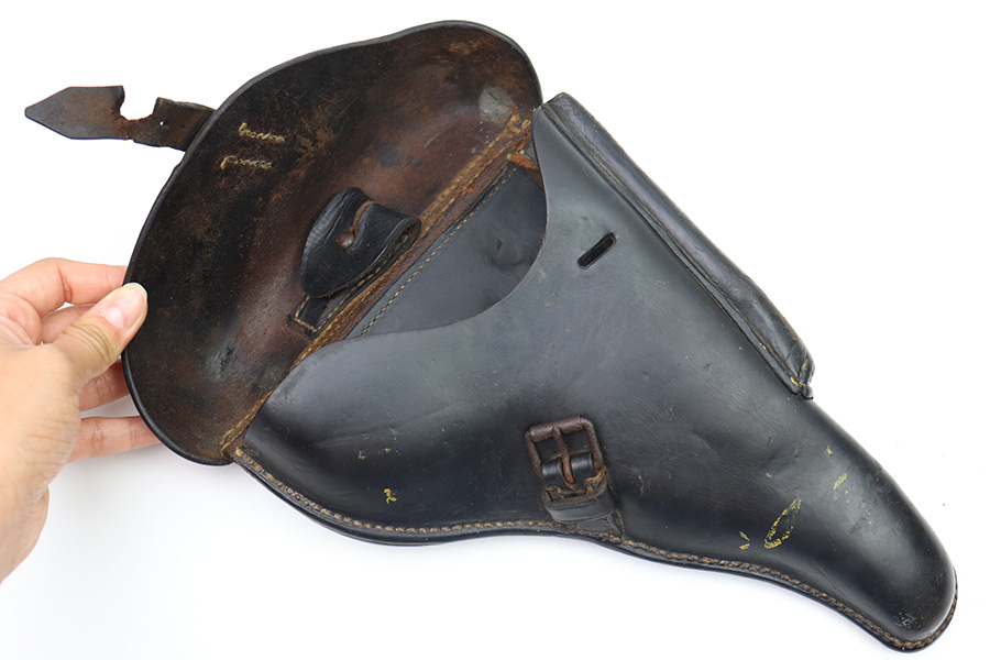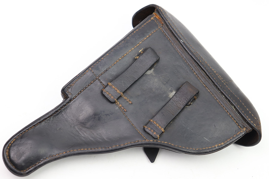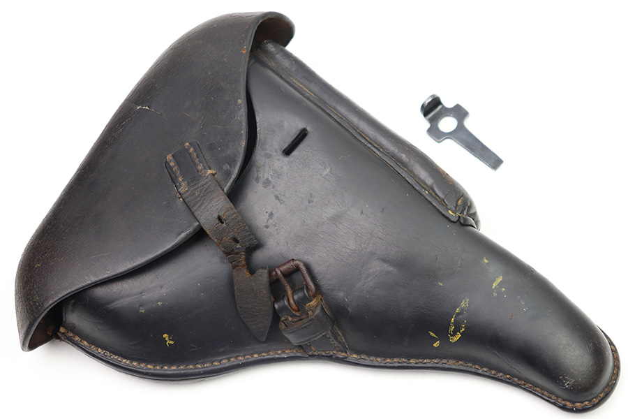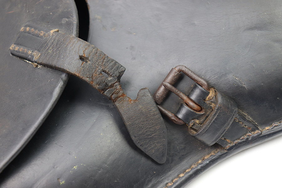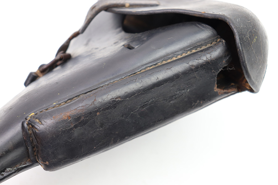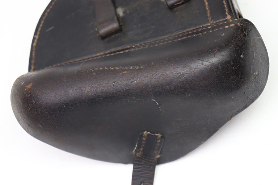 10/14/22 – This is an original 1936 dated Luger holster from WW2. The holster has a missing lift strap, and the closure strap has a portion of leather missing near the third hole. The rest of the holster is intact and all original, although the loading tool pouch knob is somewhat loose and beginning to disconnect from the leather. The rest of the holster leather has light pliability and some typical surface wear and minor surface cracking on the magazine pouch, but this doesn’t go deep. The stitching is all original and intact. Comes with a tool that’s stamped “bnz 40”, but we believe this is a reproduction tool.