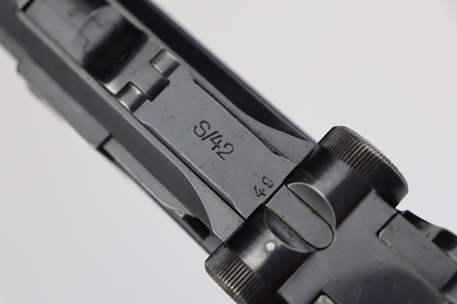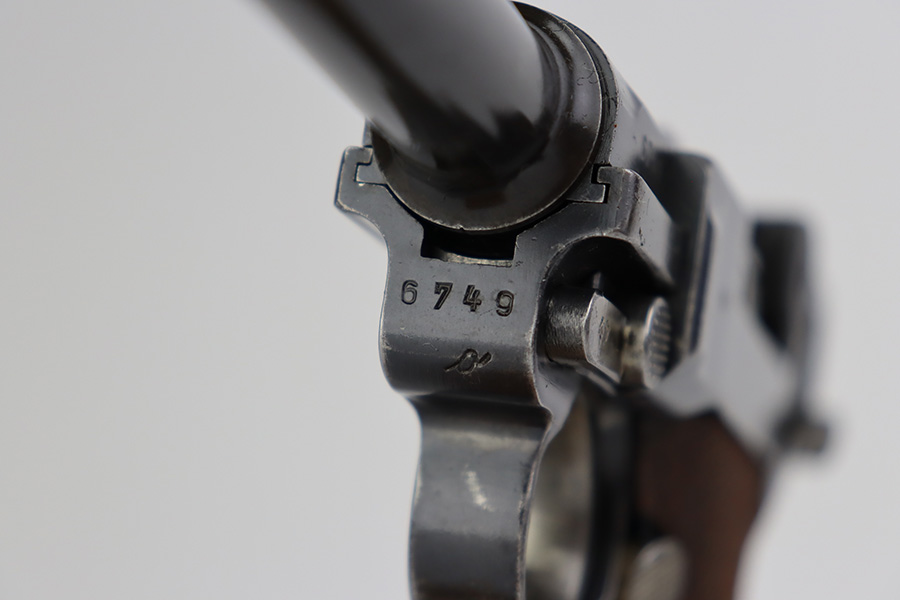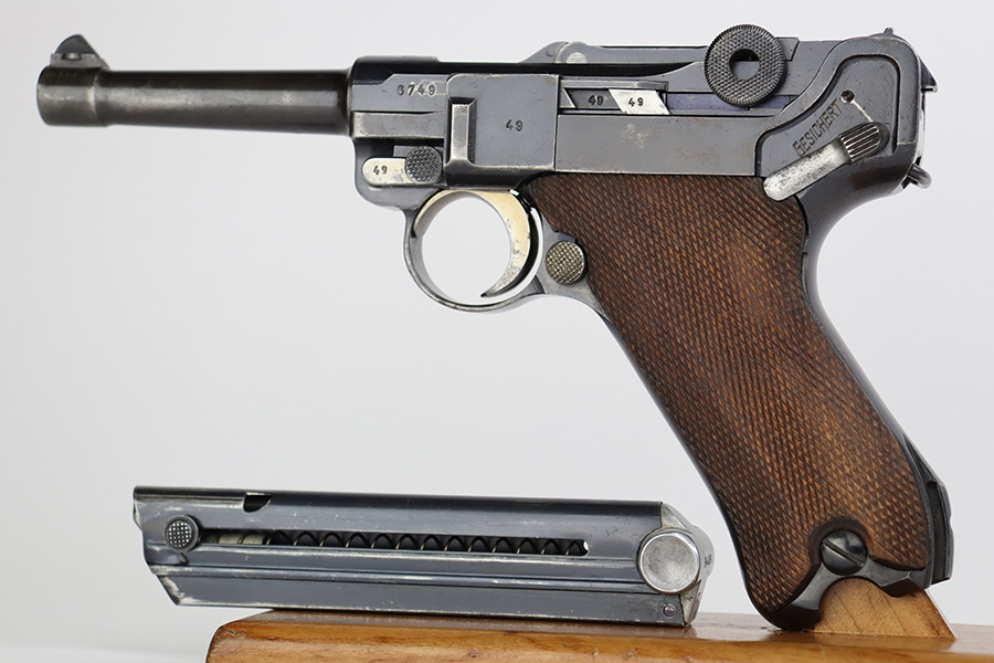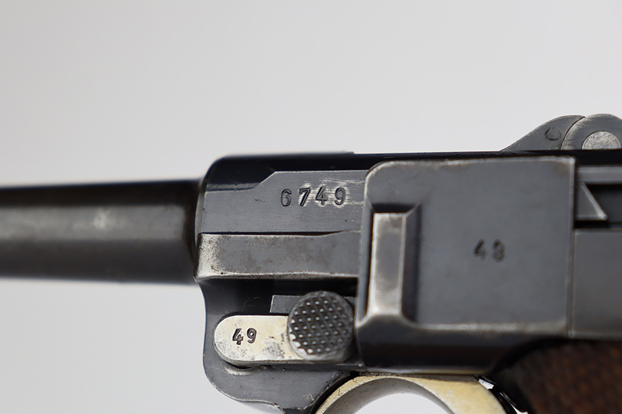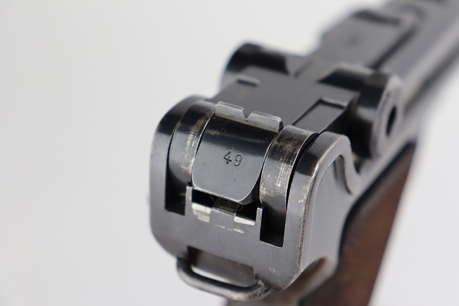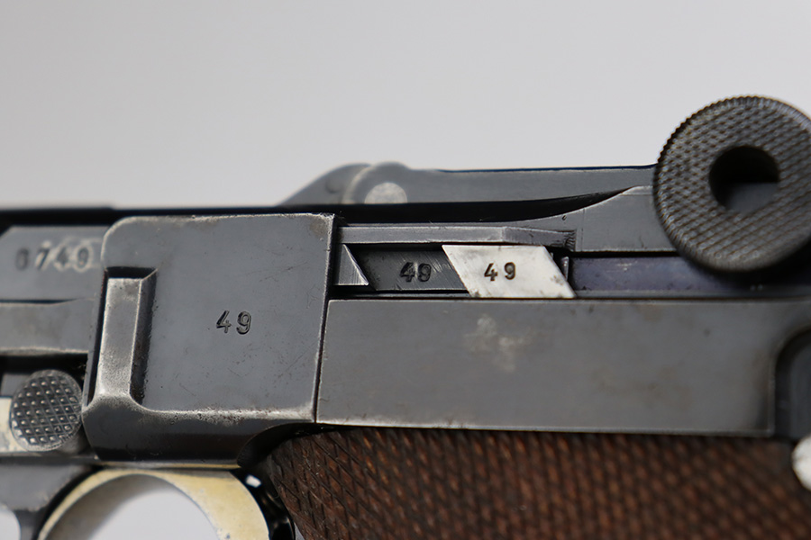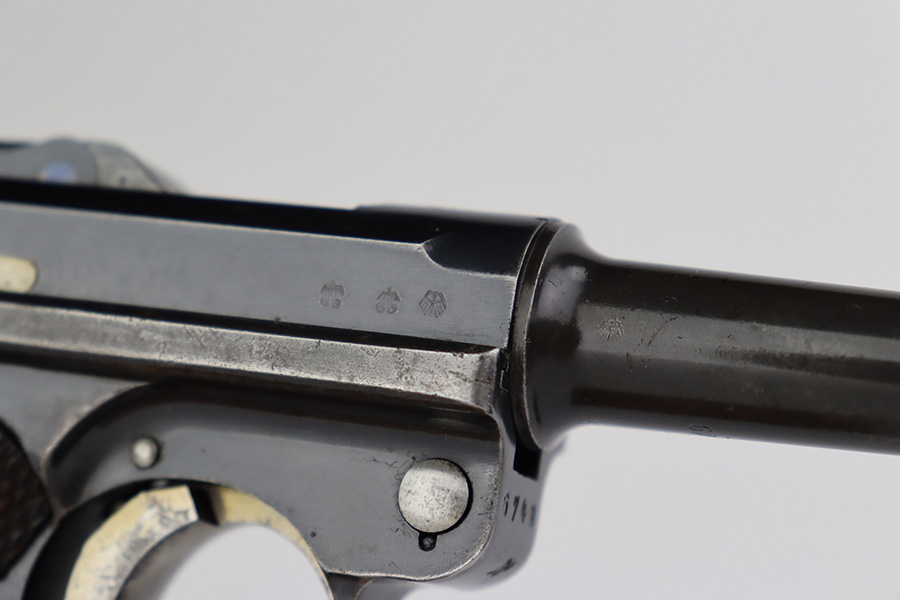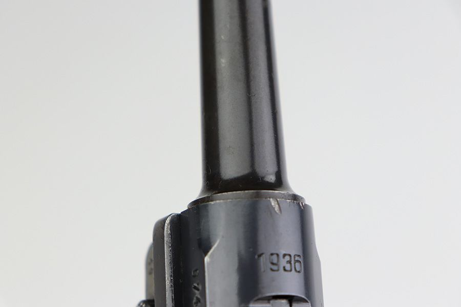 8/9/23 – This is a nice example of a Mauser Luger issued to the Nazi military in 1936. It is all matching and has the proper “Eagle 63” military acceptance proofs. It has retained roughly 80-85% of its original finish. There are areas of thinning and light spotty oxidation along the barrel and on both grip straps. Minor wear around the muzzle and high edges in general. A few small dots of wear on the left side of the frame. Pin-pricking on the grip straps. A few tiny dings in the metal where the chamber meets the barrel. Fitted with excellent un-numbered wood grips. Right grip panel shifts very slightly when gripped. Comes with a mismatched “Eagle 63” proofed magazine. Very nice bore with great rifling.