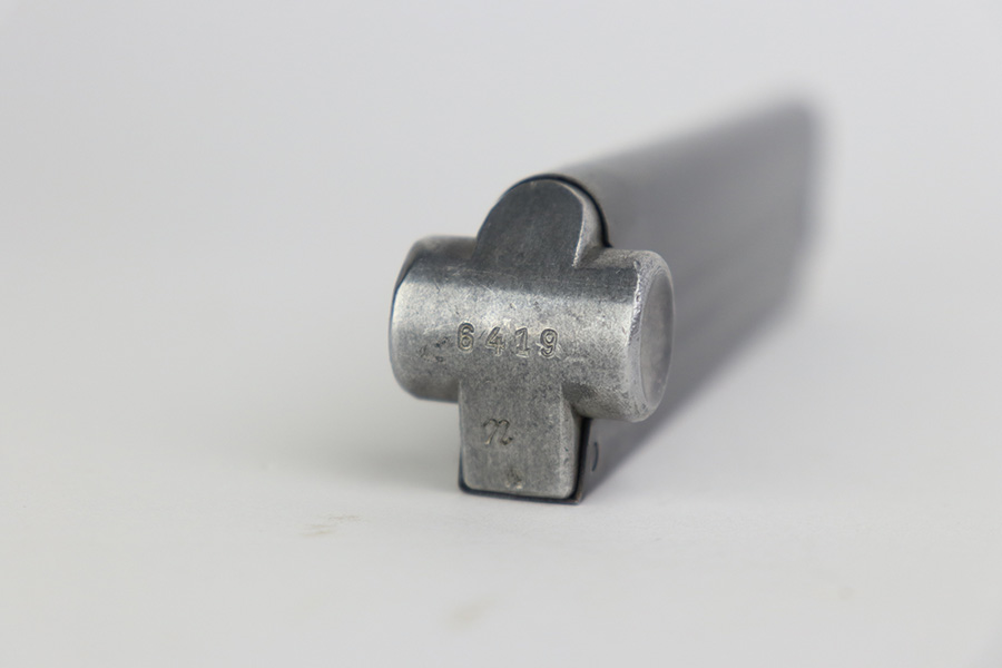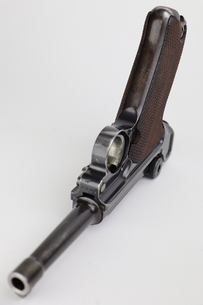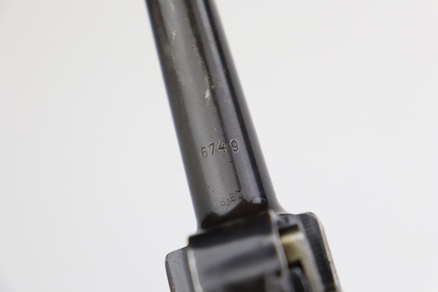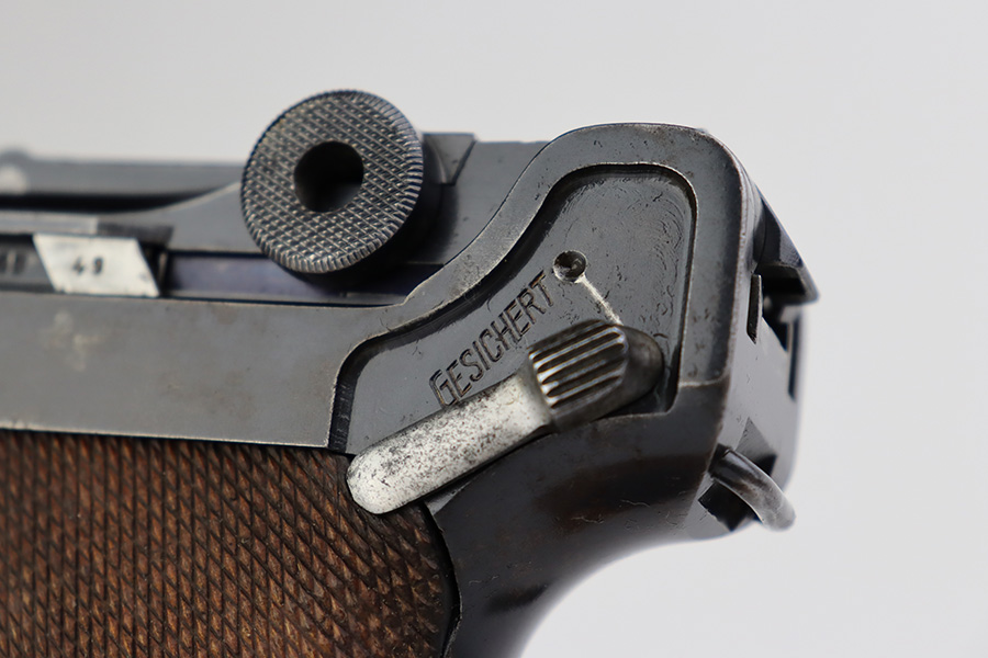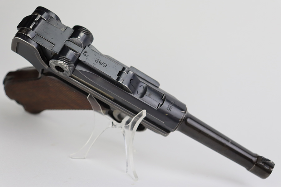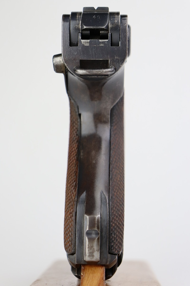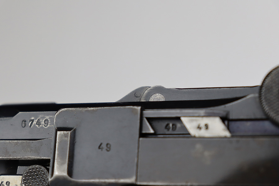 8/9/23 – This is a nice example of a Mauser Luger issued to the Nazi military in 1936. It is all matching and has the proper “Eagle 63” military acceptance proofs. It has retained roughly 80-85% of its original finish. There are areas of thinning and light spotty oxidation along the barrel and on both grip straps. Minor wear around the muzzle and high edges in general. A few small dots of wear on the left side of the frame. Pin-pricking on the grip straps. A few tiny dings in the metal where the chamber meets the barrel. Fitted with excellent un-numbered wood grips. Right grip panel shifts very slightly when gripped. Comes with a mismatched “Eagle 63” proofed magazine. Very nice bore with great rifling.