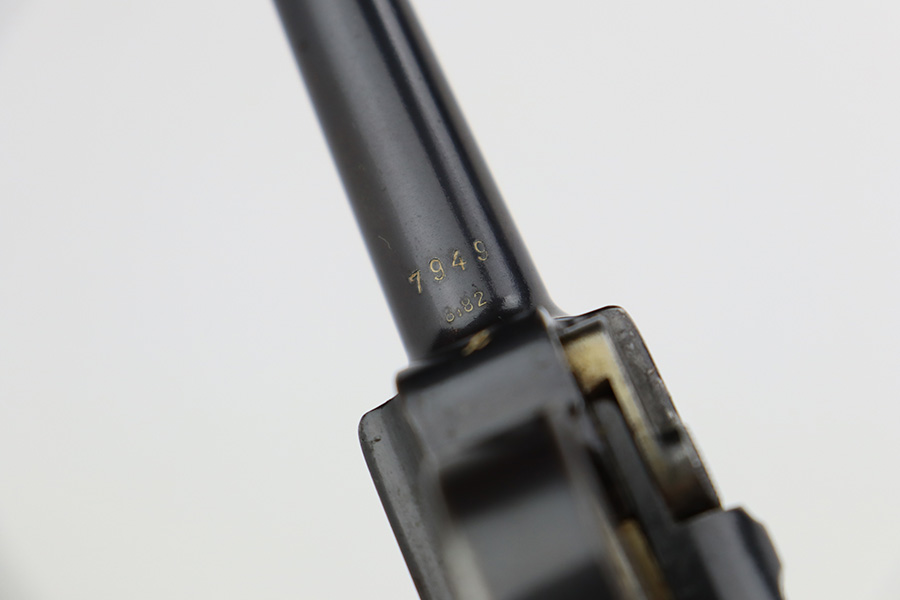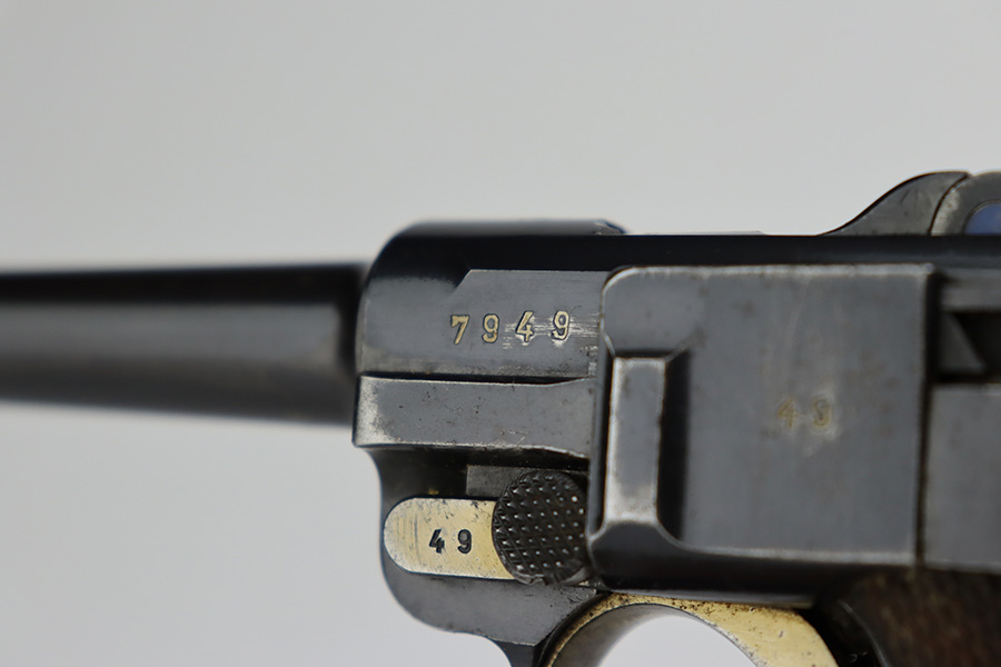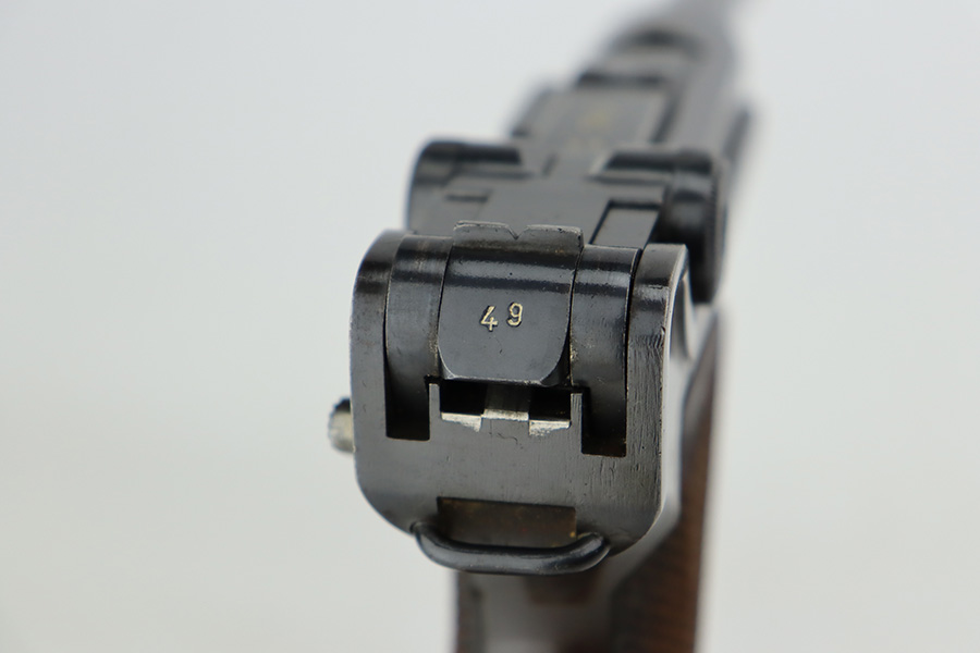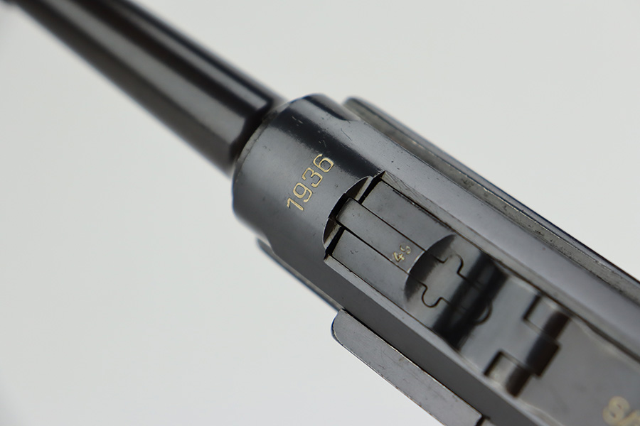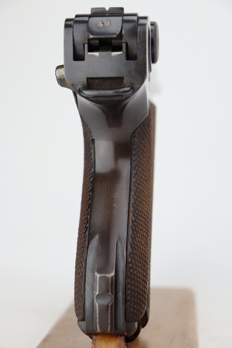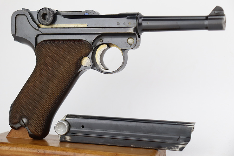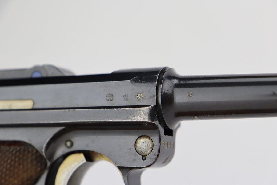 8/25/23 – This is a very nice example of a 1936 Mauser Luger issued to the Nazi military in 1936. It is all matching and has the proper “Eagle 63” military acceptance proofs. It has retained about 93% of its original finish with minor wear around the muzzle, on the side plate, and on the side rails. There are also a few very light scratches and some light freckling on the side plate. Light brown patina on both grip straps and some minor thinning on the front strap. Fitted with excellent un-numbered wood grips and comes with a mismatched magazine. Excellent bore with great rifling.