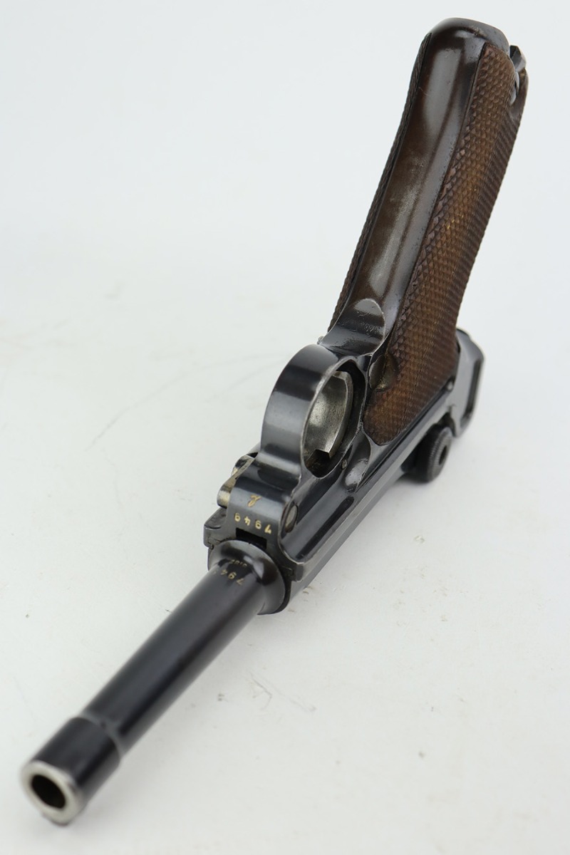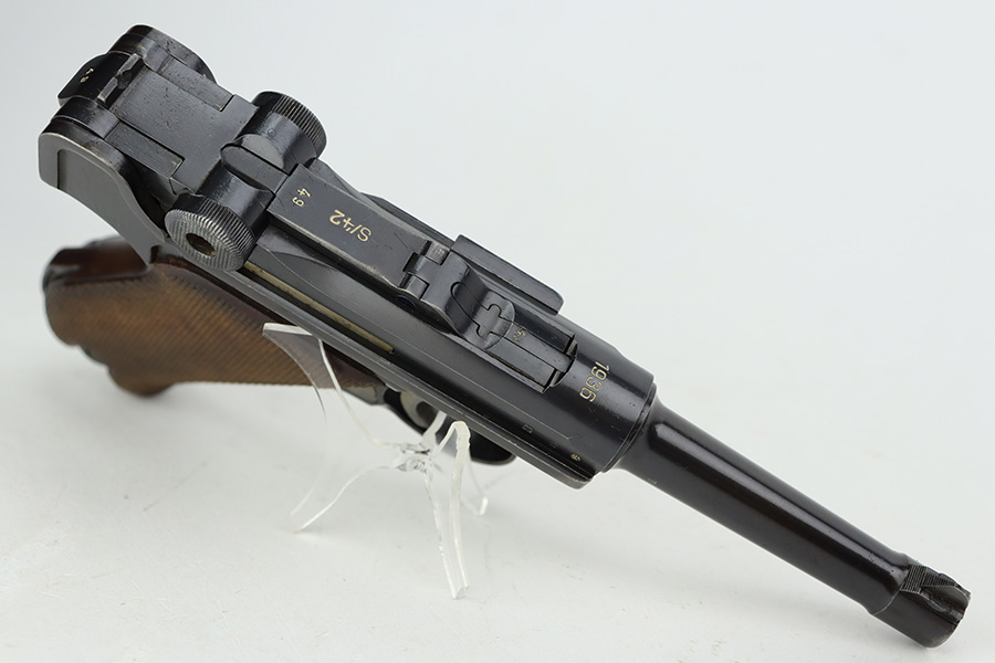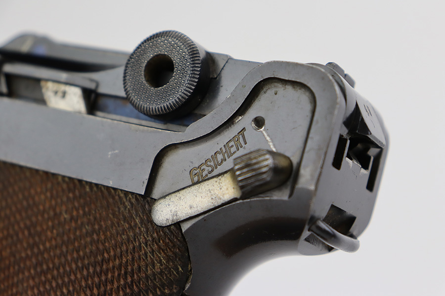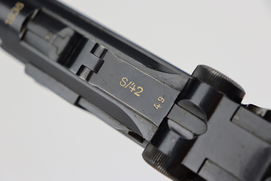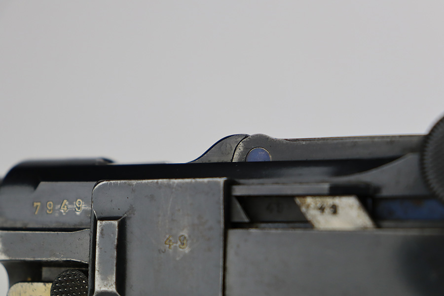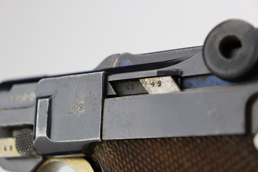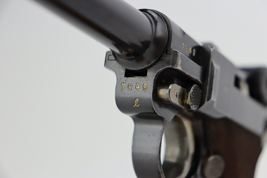 8/25/23 – This is a very nice example of a 1936 Mauser Luger issued to the Nazi military in 1936. It is all matching and has the proper “Eagle 63” military acceptance proofs. It has retained about 93% of its original finish with minor wear around the muzzle, on the side plate, and on the side rails. There are also a few very light scratches and some light freckling on the side plate. Light brown patina on both grip straps and some minor thinning on the front strap. Fitted with excellent un-numbered wood grips and comes with a mismatched magazine. Excellent bore with great rifling.