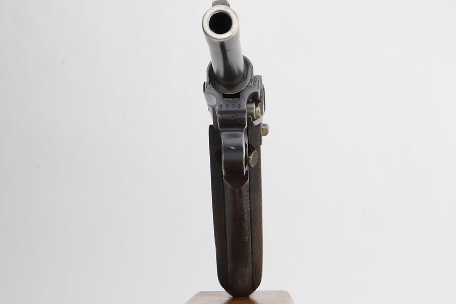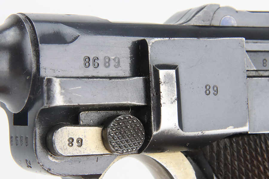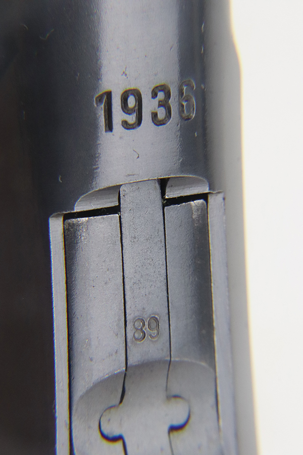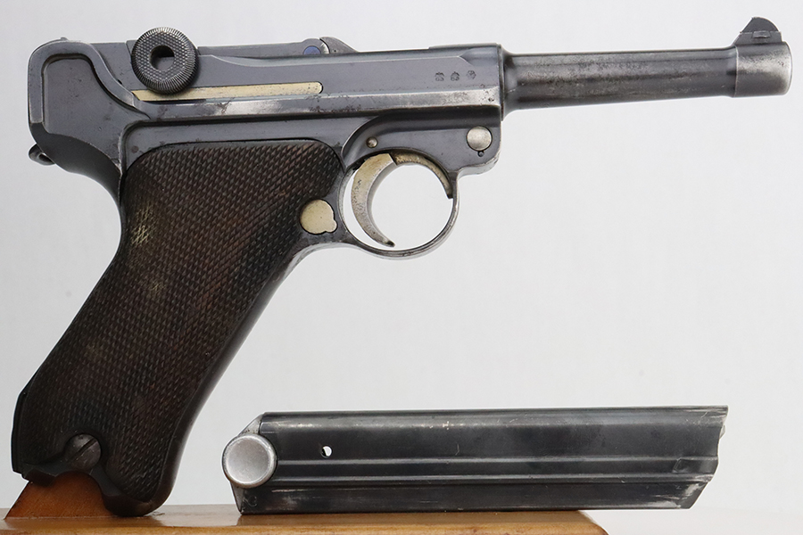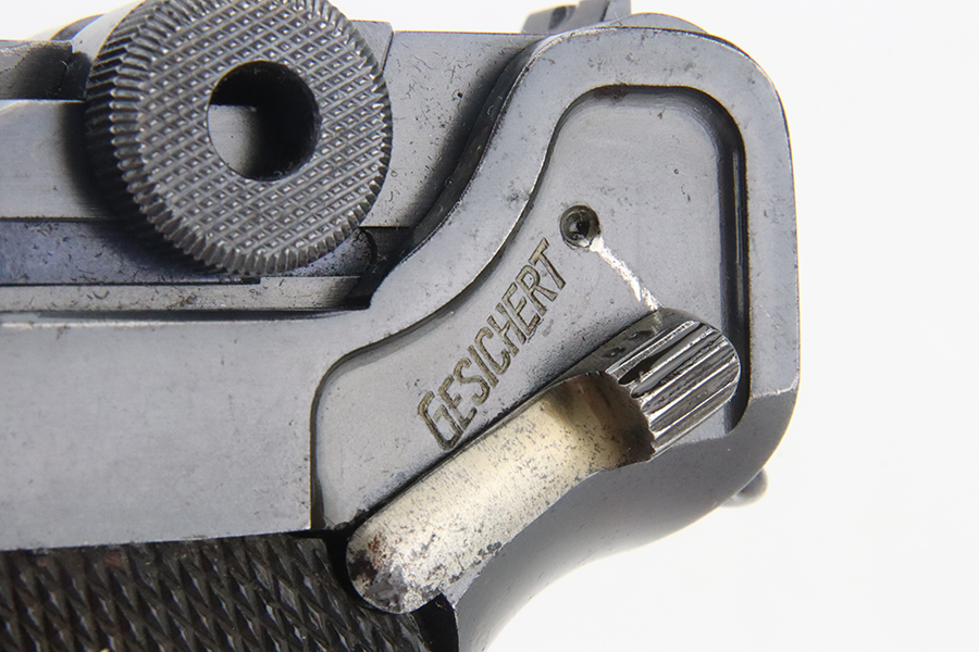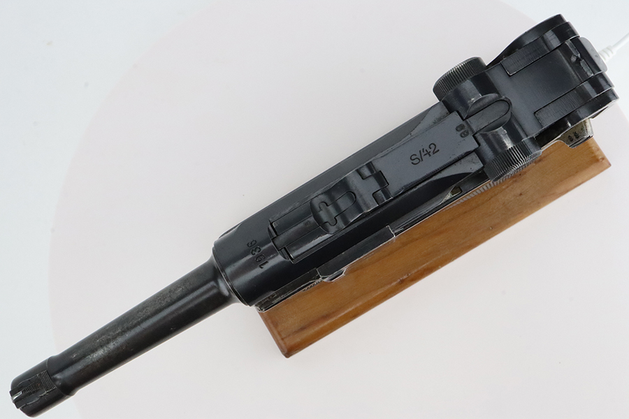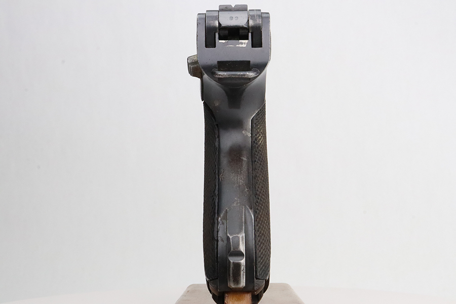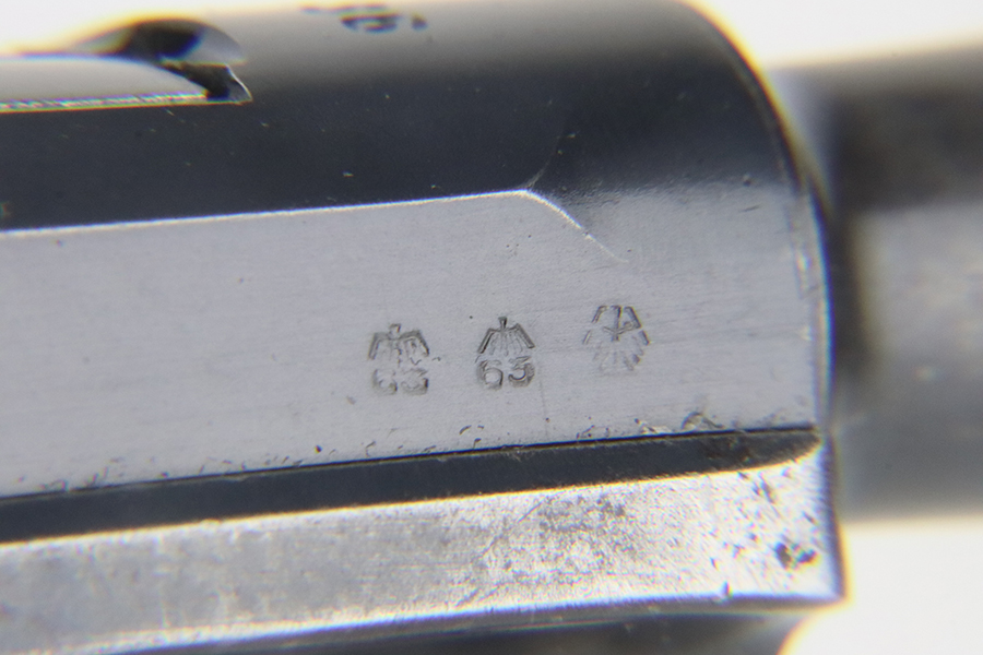 2/27/24 – This is a nice example of a Mauser Luger issued to the Nazi military in 1936. It is all matching and has the proper “Eagle 63” military acceptance proofs. Its original finish rates roughly 80-85% with general high edge wear, wear around the muzzle, and thinning along the barrel. The grip straps are a bit rough with spotty discoloration and some pitting. Fitted with un-numbered wood grips – the left grip is a bit loose with a tiny chip in the upper corner. Comes with a mismatched “Eagle 63” magazine. Very nice bore.