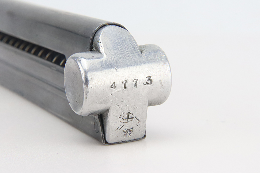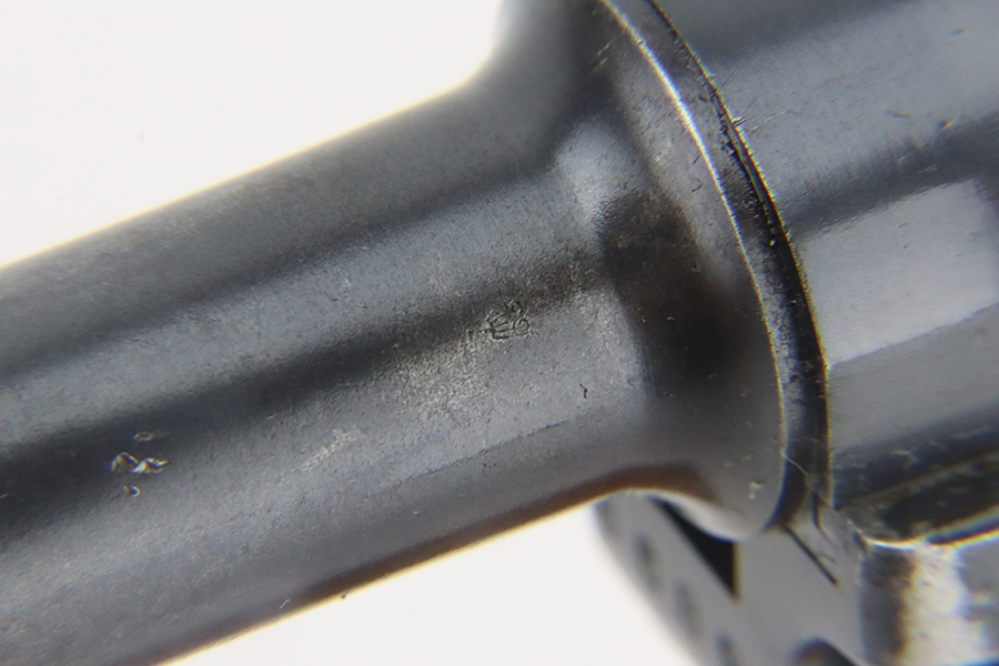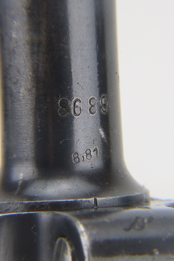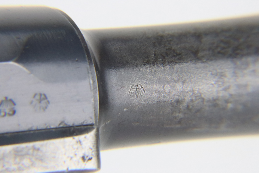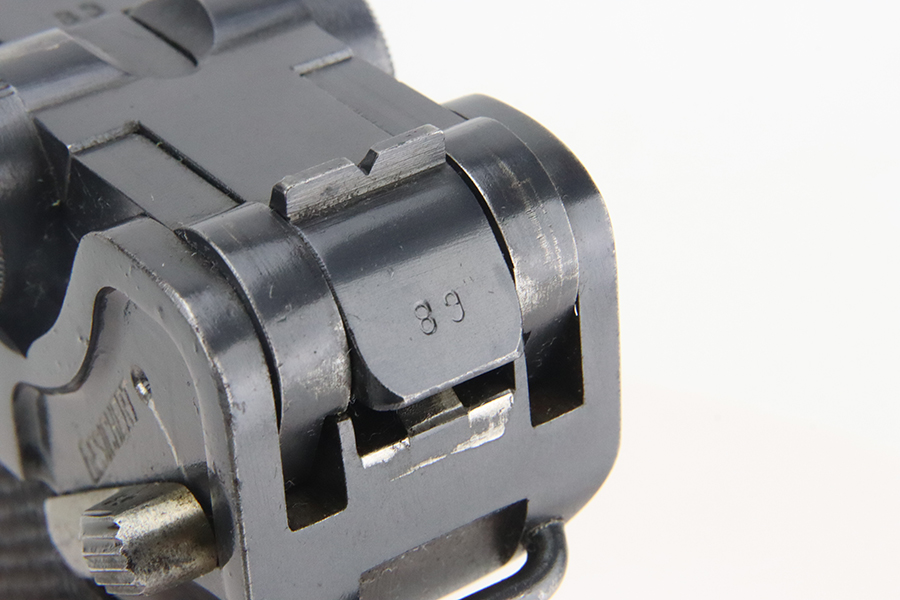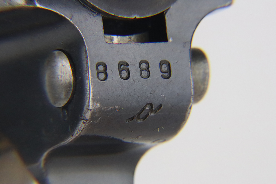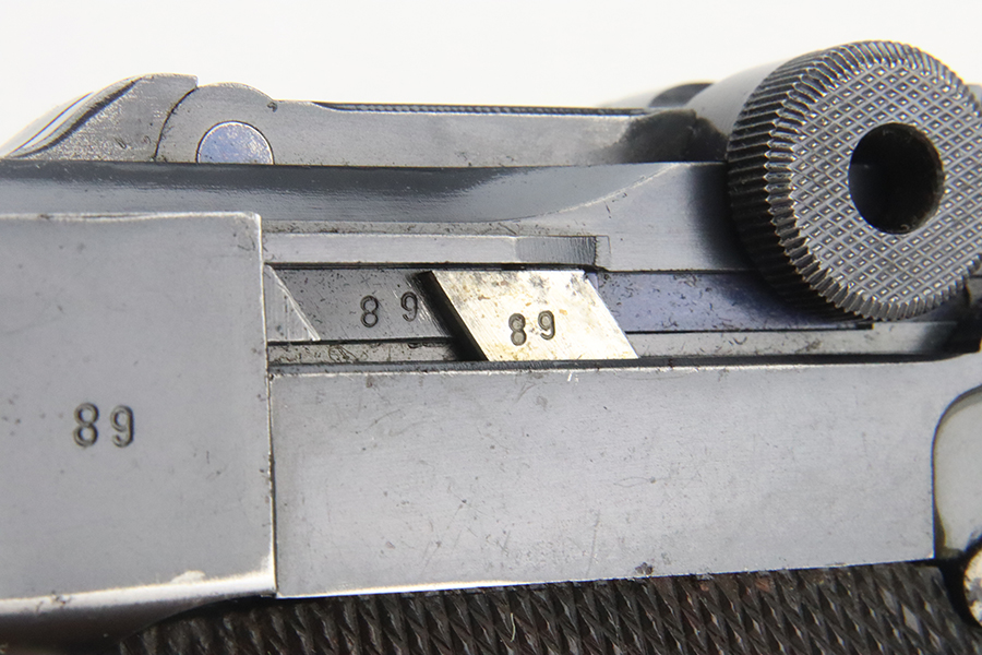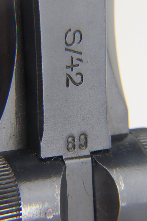 2/27/24 – This is a nice example of a Mauser Luger issued to the Nazi military in 1936. It is all matching and has the proper “Eagle 63” military acceptance proofs. Its original finish rates roughly 80-85% with general high edge wear, wear around the muzzle, and thinning along the barrel. The grip straps are a bit rough with spotty discoloration and some pitting. Fitted with un-numbered wood grips – the left grip is a bit loose with a tiny chip in the upper corner. Comes with a mismatched “Eagle 63” magazine. Very nice bore.