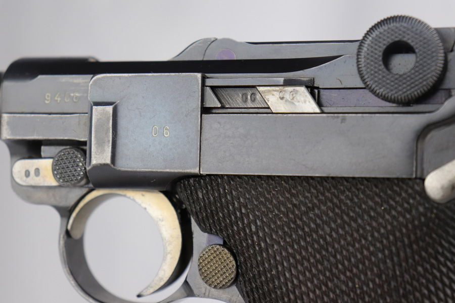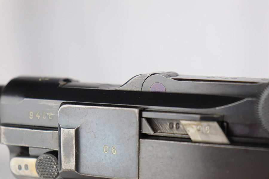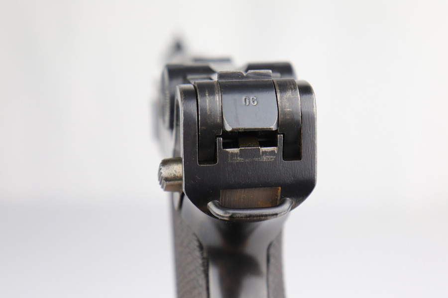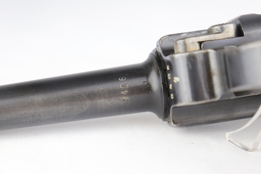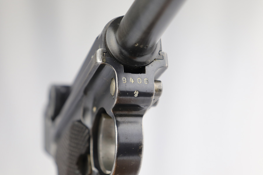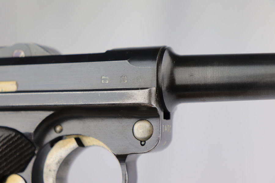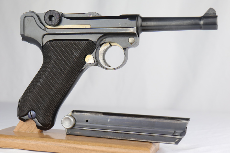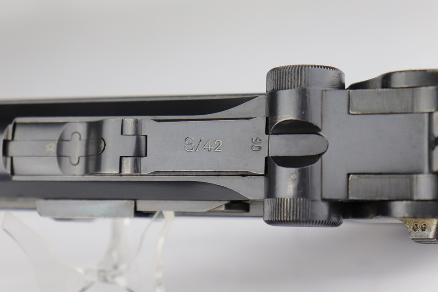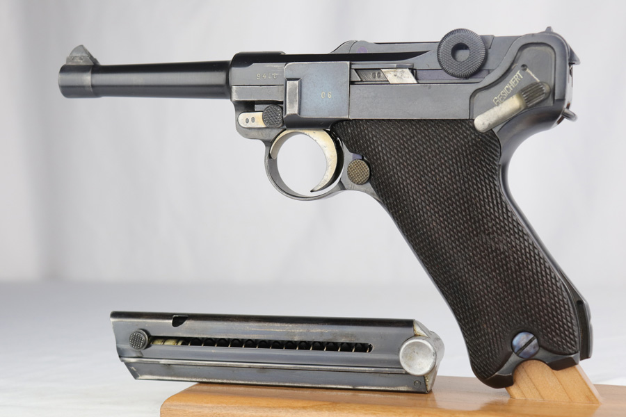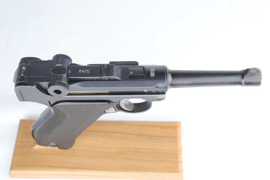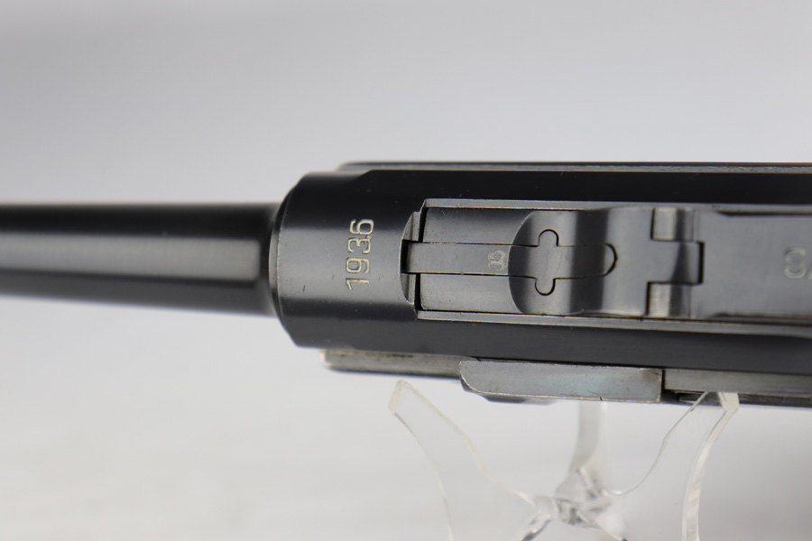 8/5/2019 – This is an all matching and original Nazi Mauser Luger from 1936. This gun was issued to the German Army before hostilities broke out in 1939. The finish is the early “dust blue” with straw colored small parts. The original bluing rates in the 95 -96% range with minor high edge wear and some patina under the finish. Excellent metal with no pitting. Small parts still show 50-65% original straw. Grips are unmarked but most likely original to the gun. The bore is good overall but does have some minor frosting, but good rifling. Mechanics seem very good. The magazine is a period correct armorers replacement as it is blank but 42 marked (Mauser) and Eagle 655 proofed. The mag is fairly rare field replacement. Overall a nice example of a WW2 era Military luger. A great collection / investment piece.