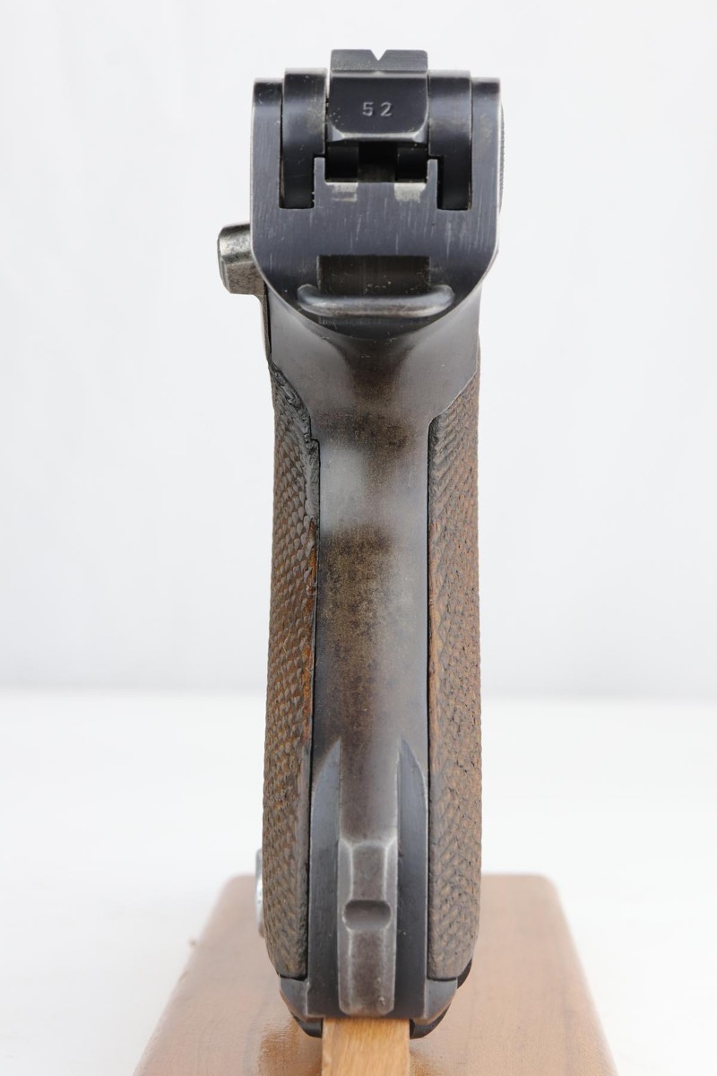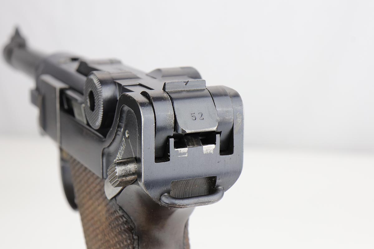 11/25/19 – This is an all matching and original Mauser Luger from 1936, including one of the original, matching magazines. The bluing rates at 85-90% with the vast majority of the patina or finish loss on the straps. Small parts retain about 60-70% of the original straw. The grips are unmarked but fit like a glove. Bore shows minor use but is shiny with strong rifling.