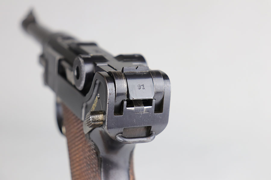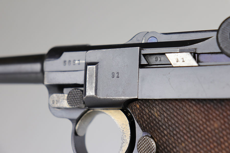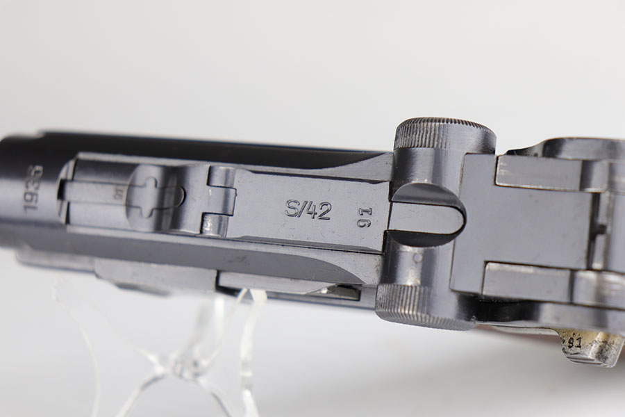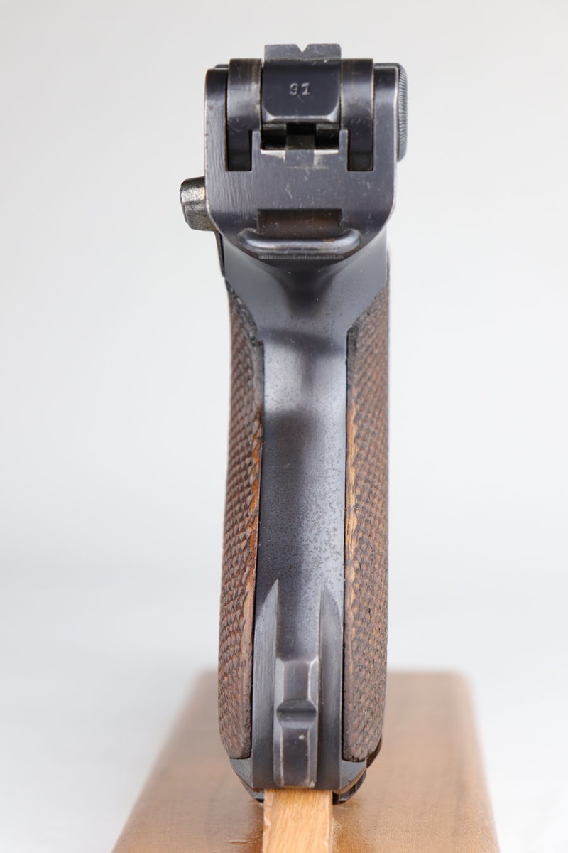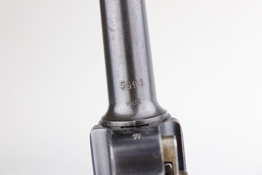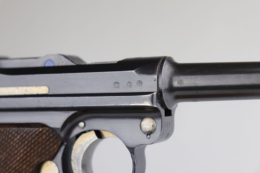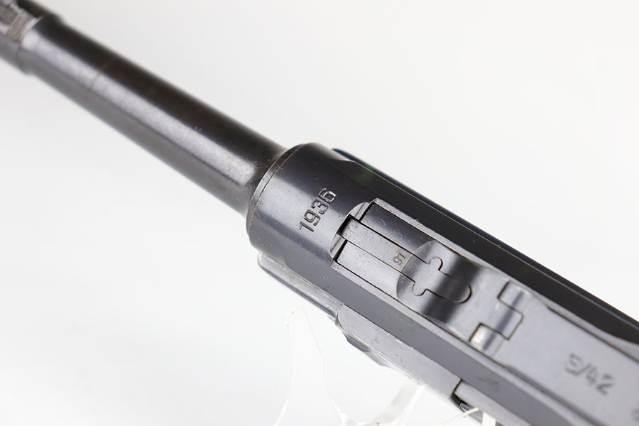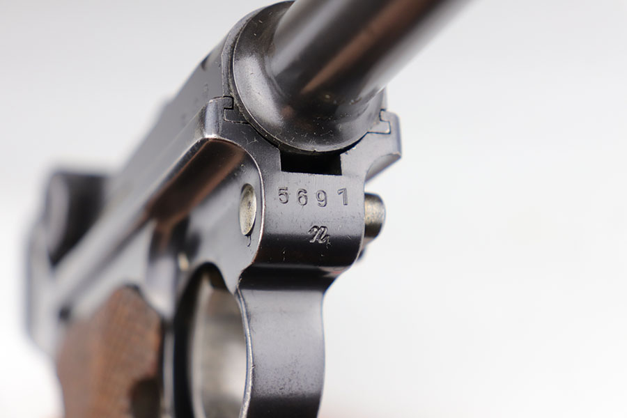 6/10/20 – This is an all matching and original Mauser Luger from 1936, including the magazine. It has about 96-97% of the original blue, with high edge wear on the muzzle, rails and sideplate. There isn’t much actual bluing loss overall, but there is some minor patination of the barrel and straps. The small parts retain about 60-70% of the original straw. The grips are unnumbered but appear original to the gun. They show some age and handling wear but no cracks or chips. Excellent bore.