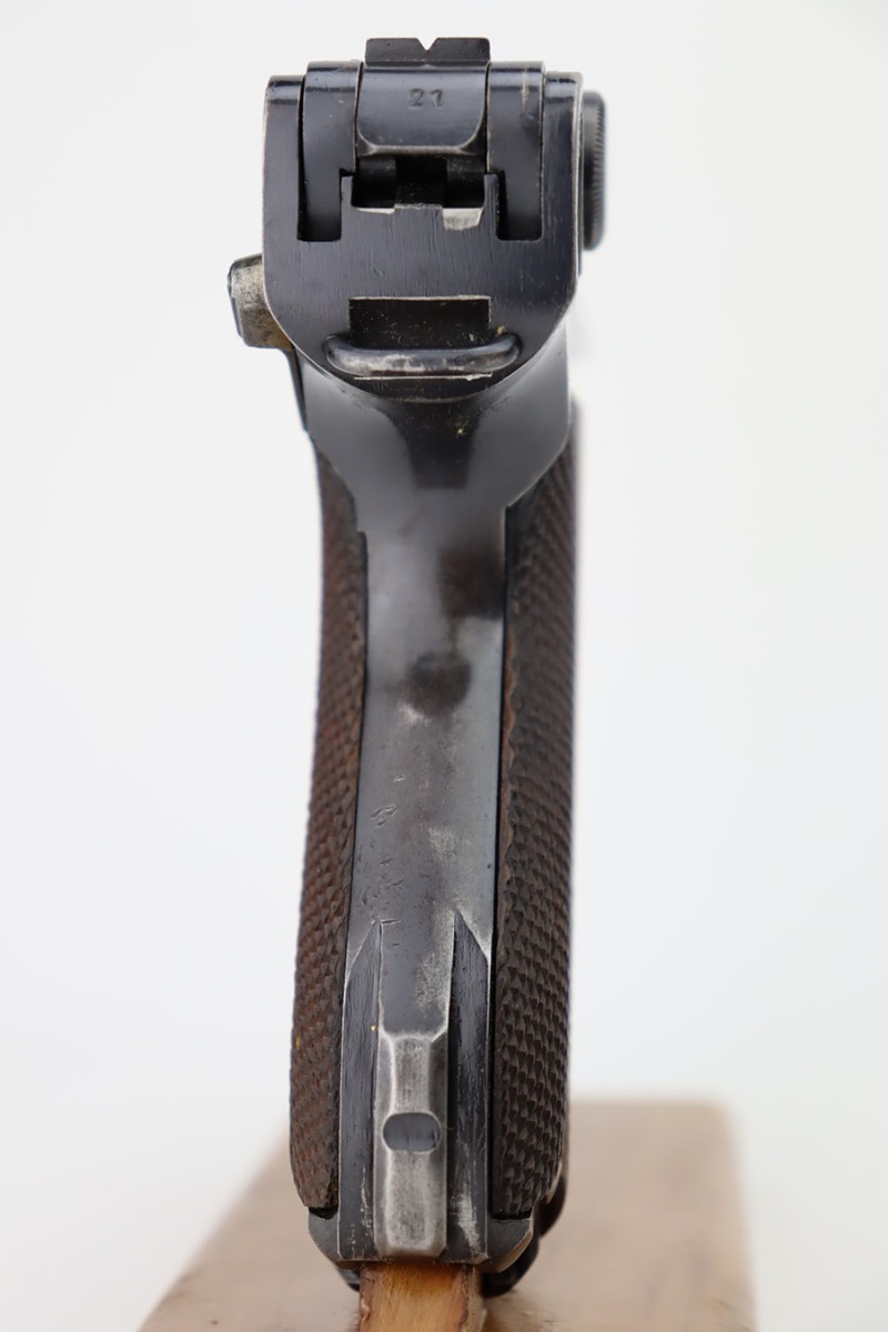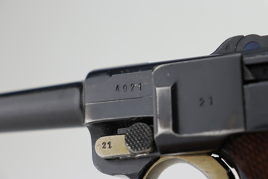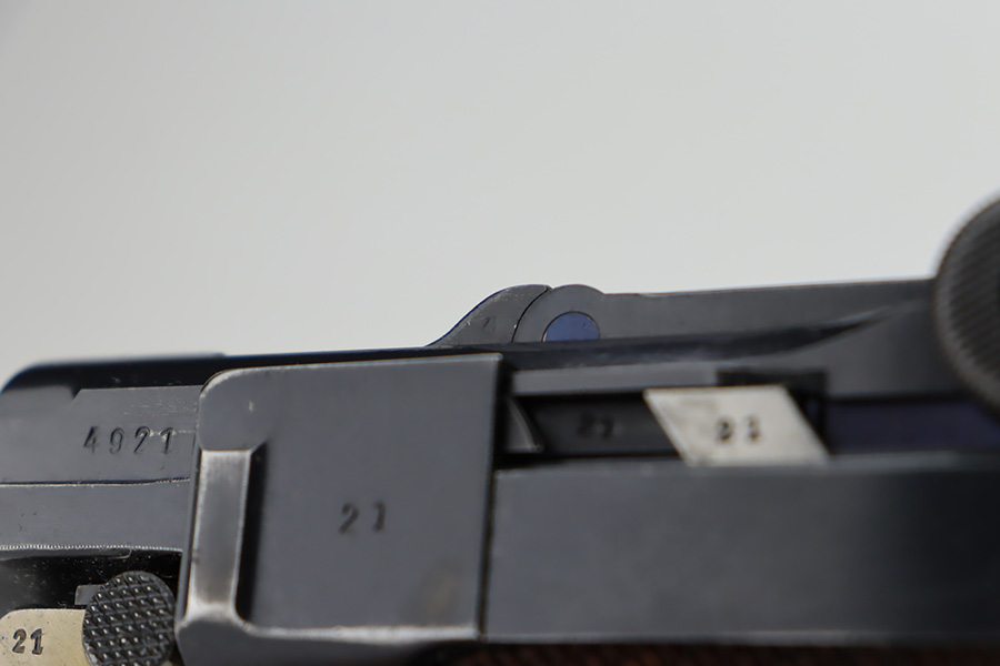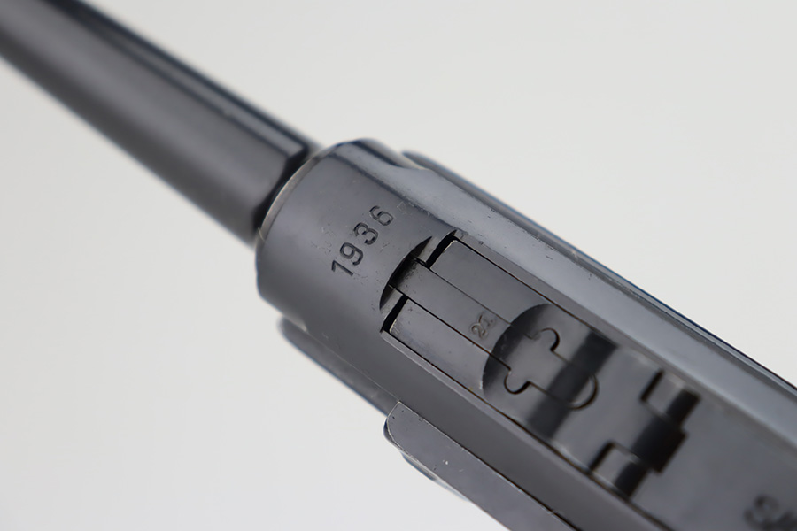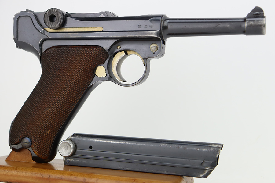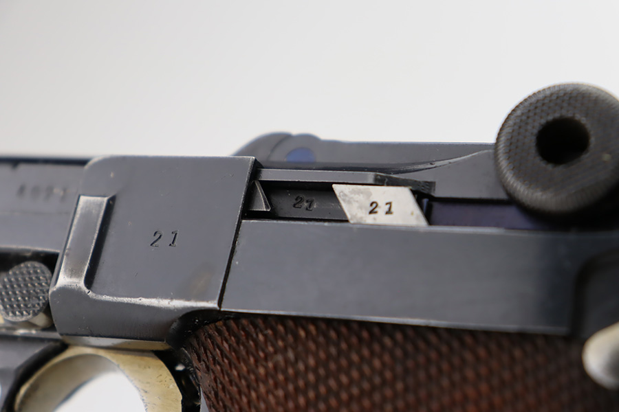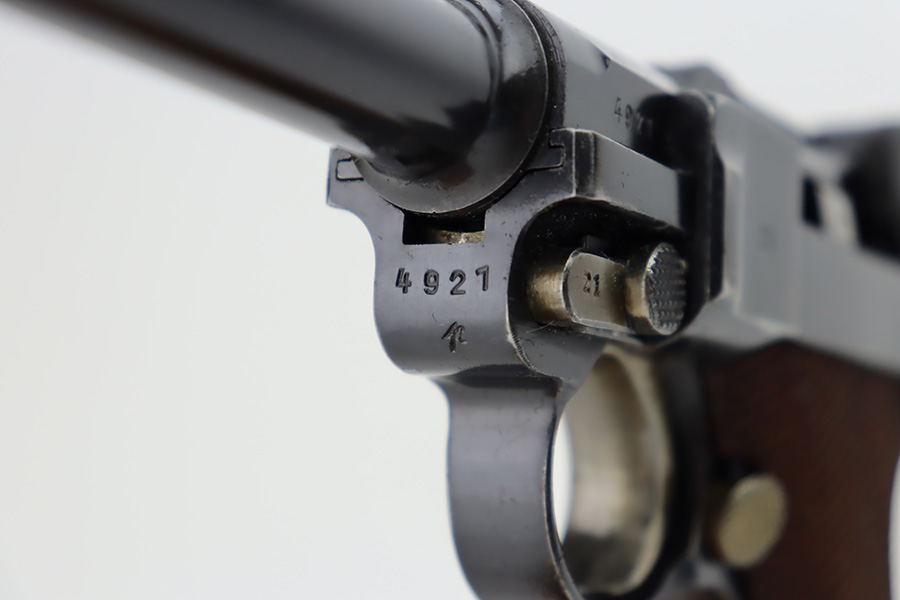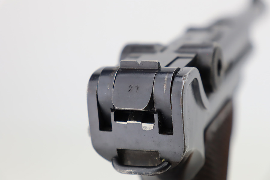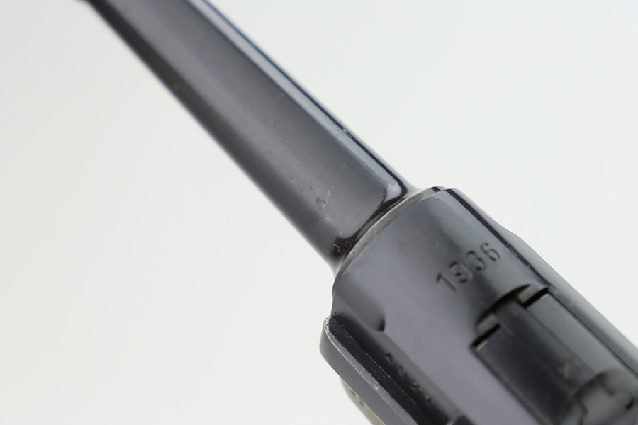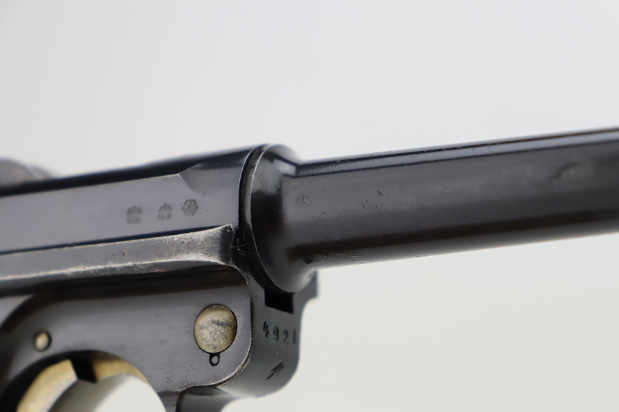 10/11/23 – This is a very nice Mauser Luger issued to the Nazi military in 1936. It is all matching and has the proper “Eagle 63” military acceptance proofs. Comes with one original matching-numbered magazine. The bluing rates about 90-92% with thinning on the back strap and areas of minor wear around the muzzle and on the high edges. A series of tiny dings on the back strap. Fitted with excellent un-numbered wood grips. The bore has great rifling with very light pin-pricking throughout.