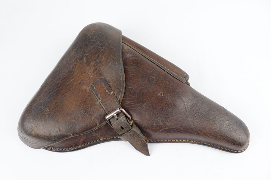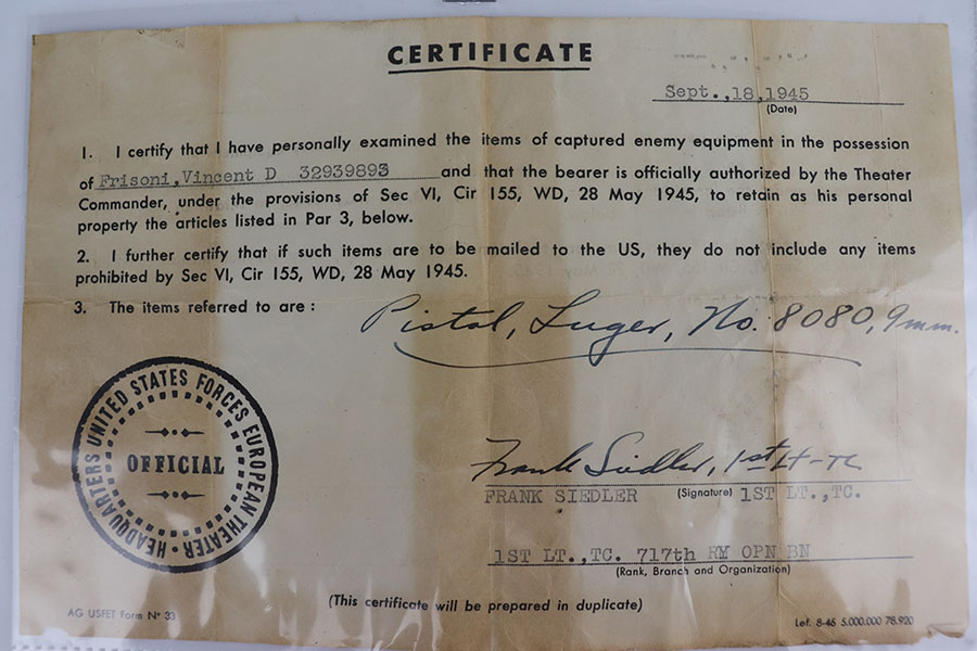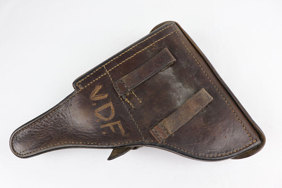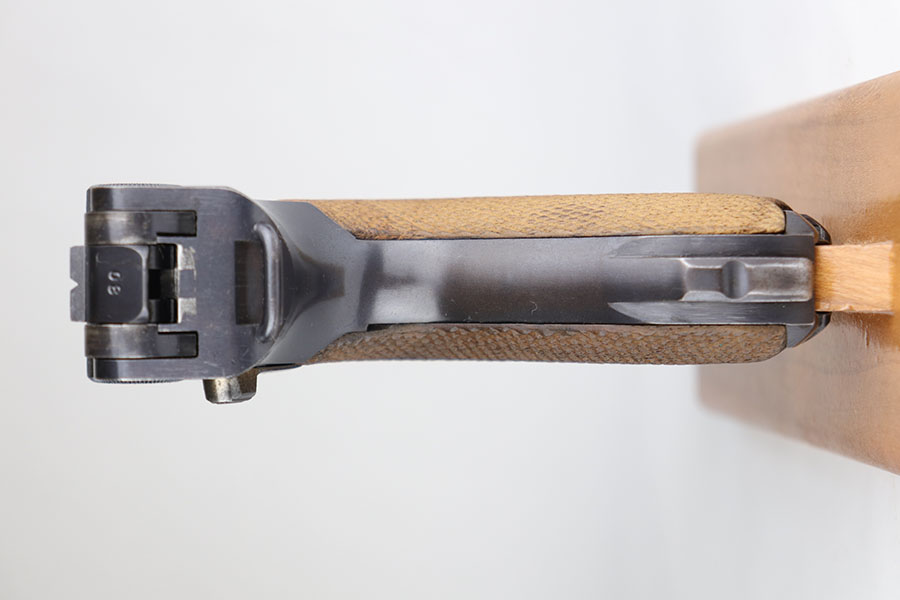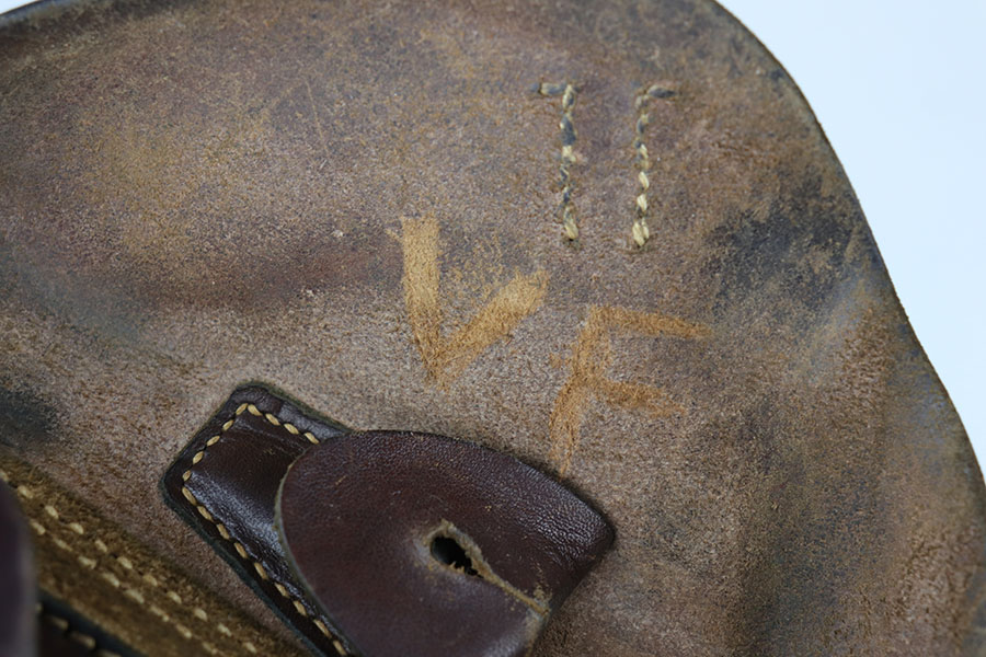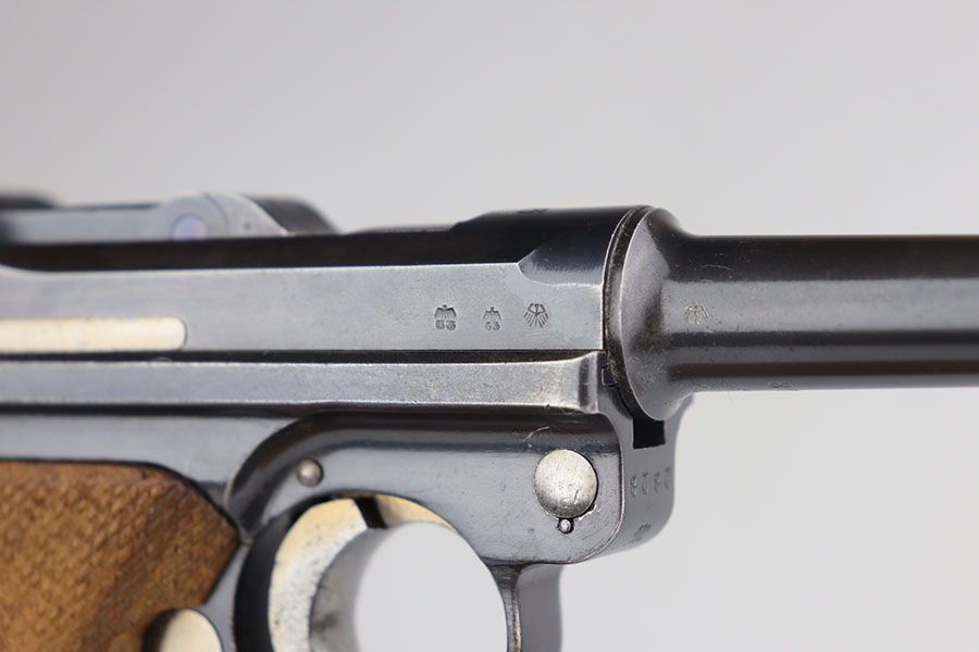6/30/20 – This is a very nice and honest example of a 1936 Mauser Luger rig that has the original matching grips, magazine and serialized capture certificate. The blue rates at 93-94% with minor holster wear on muzzle, rail, sideplate, ears, trigger guard and bottom of front strap. Small parts retain about 75% of the original straw. Magazine is factory numbered and matching to the pistol. Grips are minty and also numbered to the gun. Strong, shiny bore. Customs certificate states the pistol was brought back in September of 1945 by Vincent D. Frisoni. The listing includes a 1937 dated holster with the initials VDF scratched into the back, presumably for the same GI on the certificate. Holster has some obvious cracking and wear on the front but appears to have been with the Luger since the war. No spare magazine but does include an original E/63 tool.