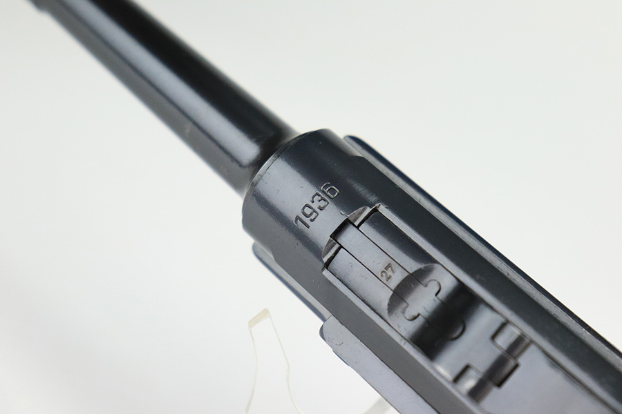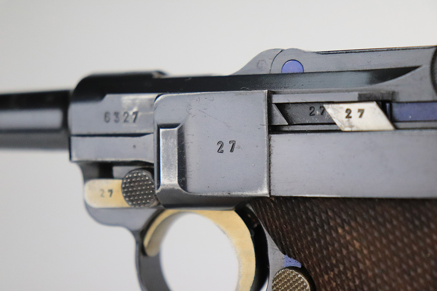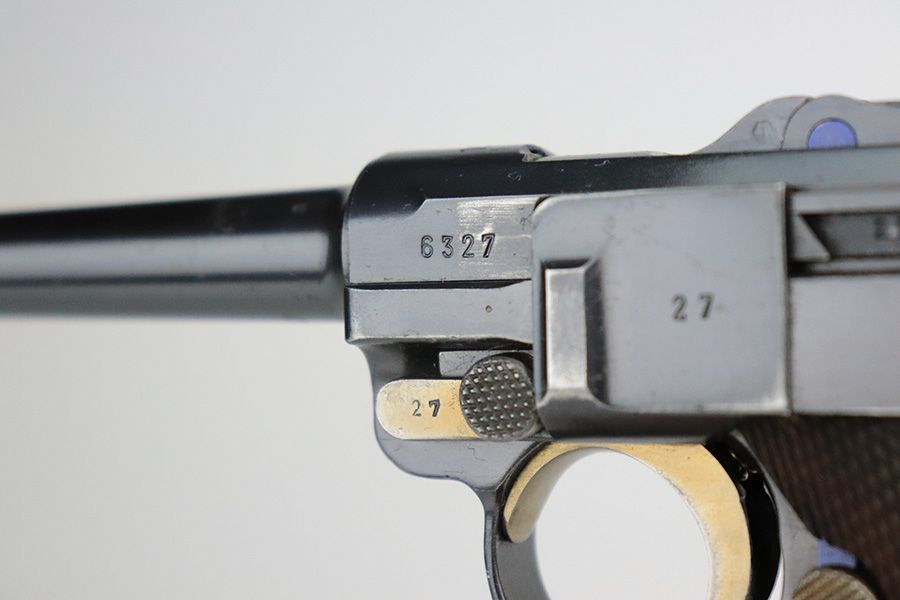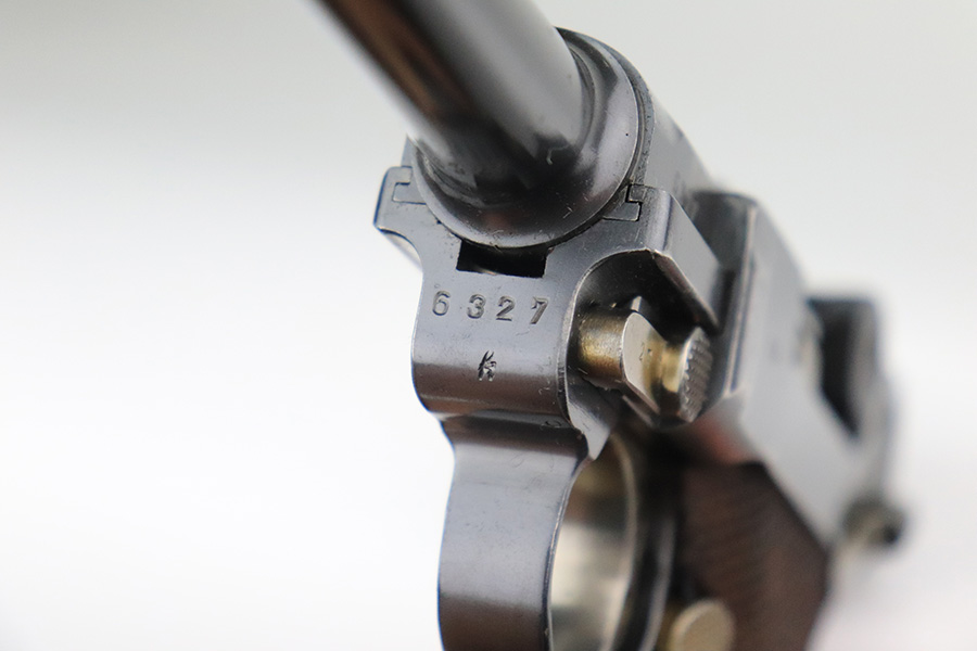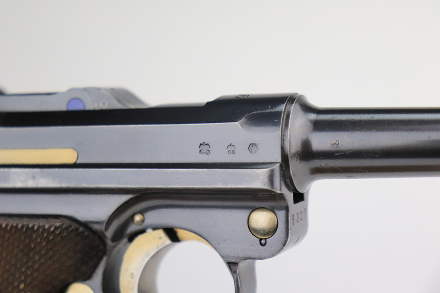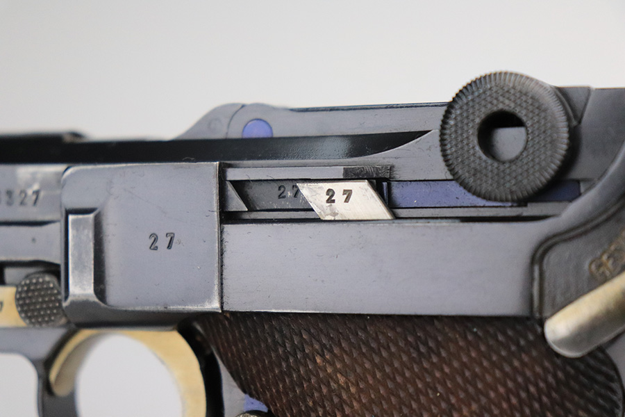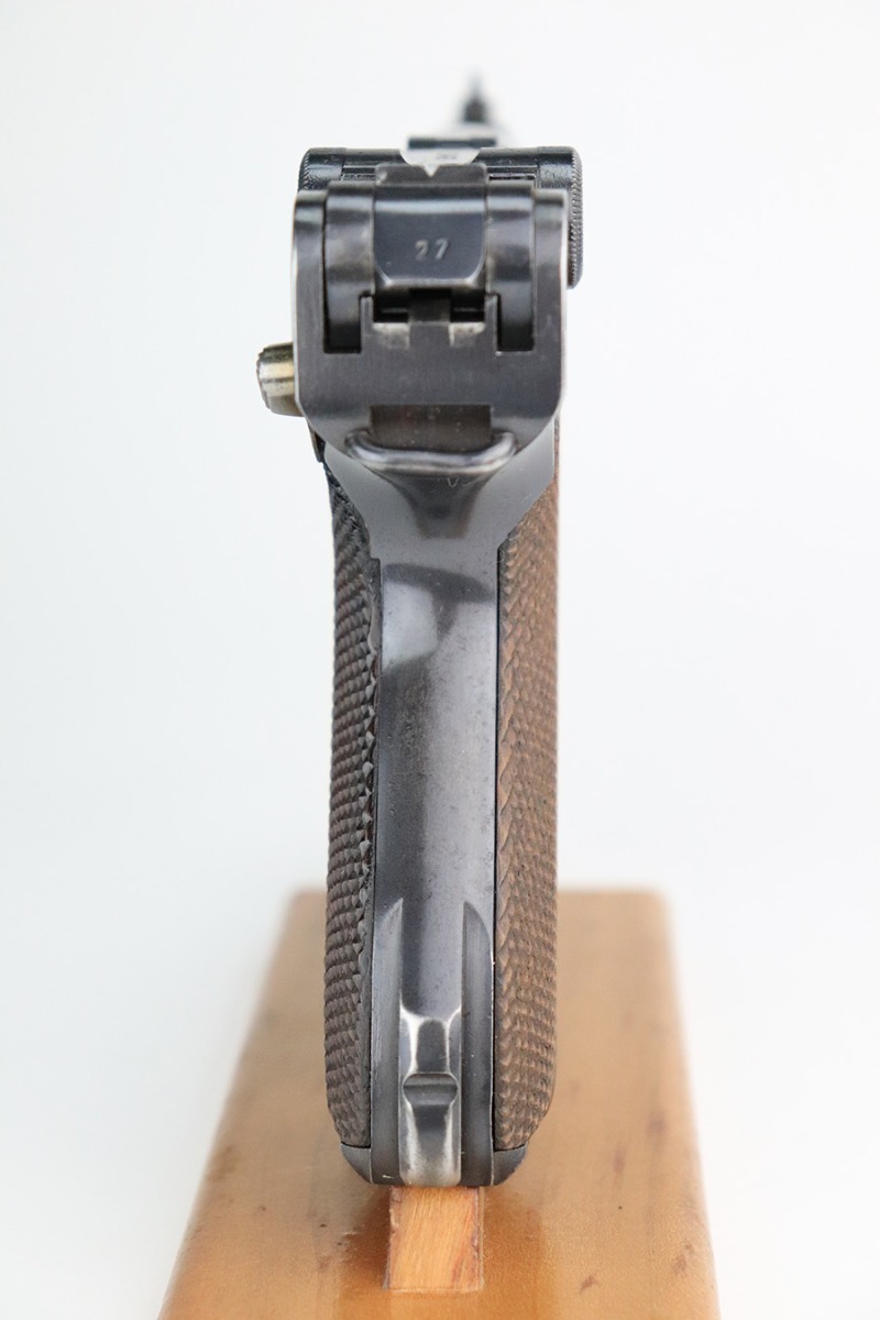 6/23/22 – This is an excellent example of a Mauser Luger issued to the Nazi military in 1936. It is all matching and has the proper “Eagle 63” military acceptance proofs. Comes with one original matching-numbered magazine. It has retained about 94% of its original bluing. The majority of the finish loss is on the grip straps, where there is minor thinning and some light spotty oxidation. Minor wear on the side plate, side rails, and around the muzzle. Very nice straw colored finish on the small parts. Comes with excellent un-numbered wood grips. Excellent bore with strong rifling.