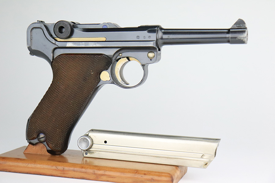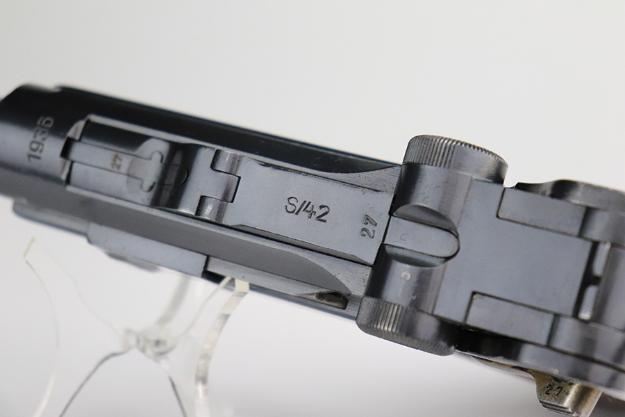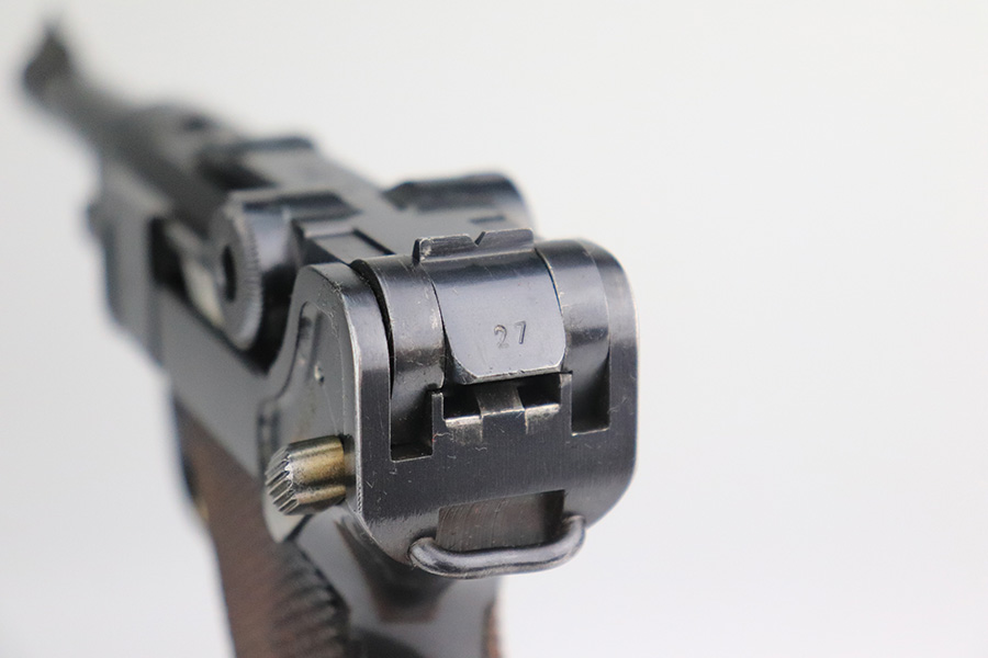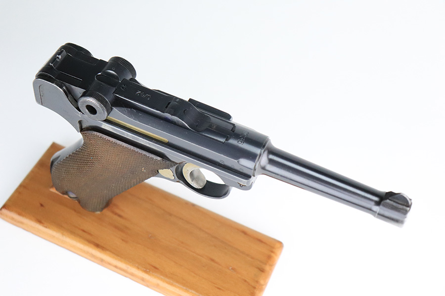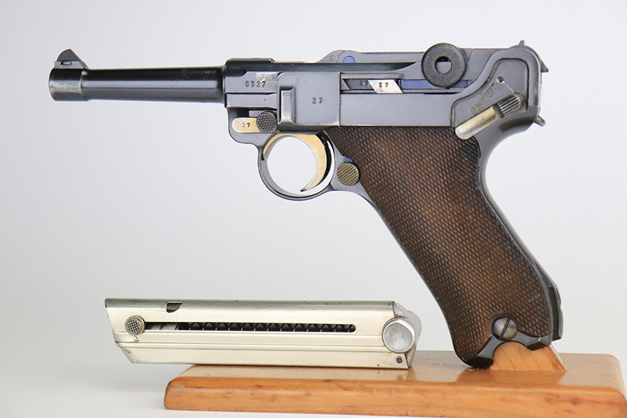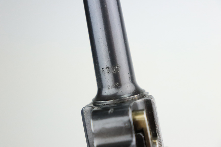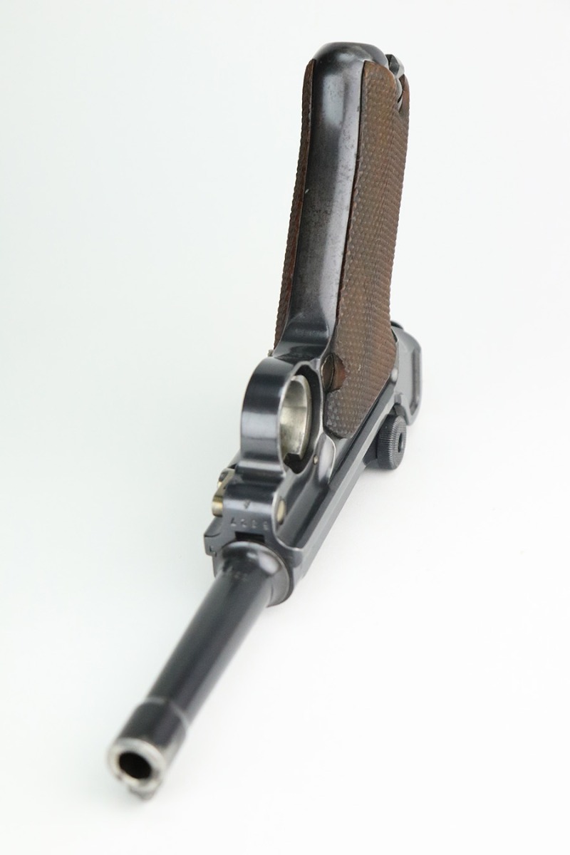 6/23/22 – This is an excellent example of a Mauser Luger issued to the Nazi military in 1936. It is all matching and has the proper “Eagle 63” military acceptance proofs. Comes with one original matching-numbered magazine. It has retained about 94% of its original bluing. The majority of the finish loss is on the grip straps, where there is minor thinning and some light spotty oxidation. Minor wear on the side plate, side rails, and around the muzzle. Very nice straw colored finish on the small parts. Comes with excellent un-numbered wood grips. Excellent bore with strong rifling.