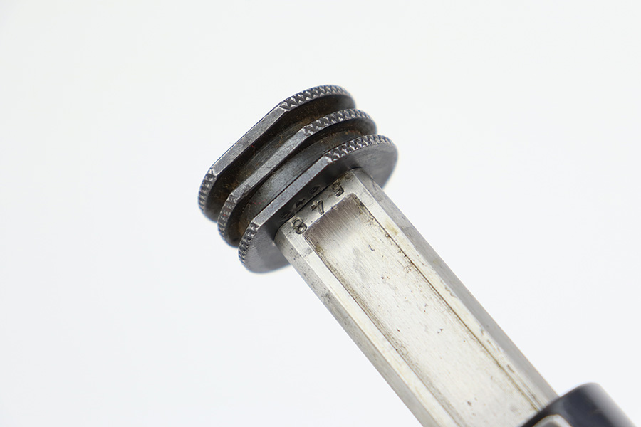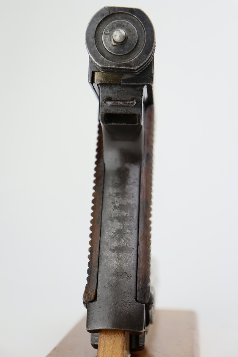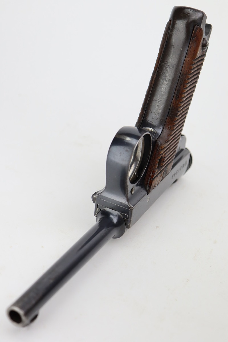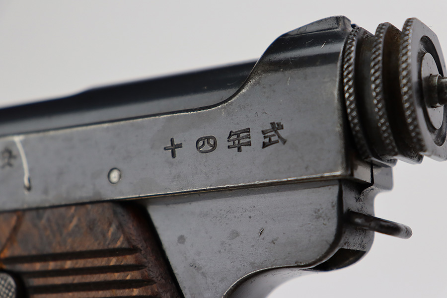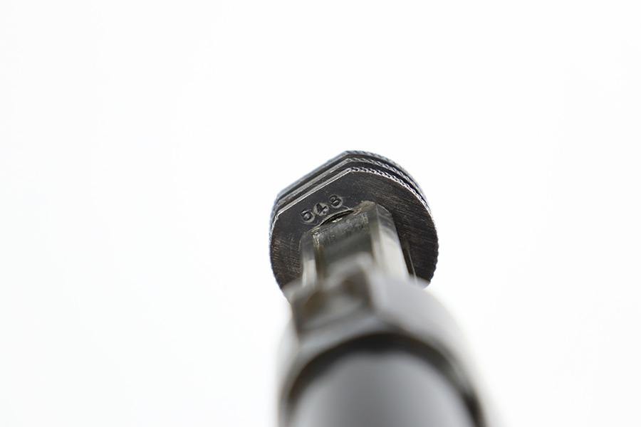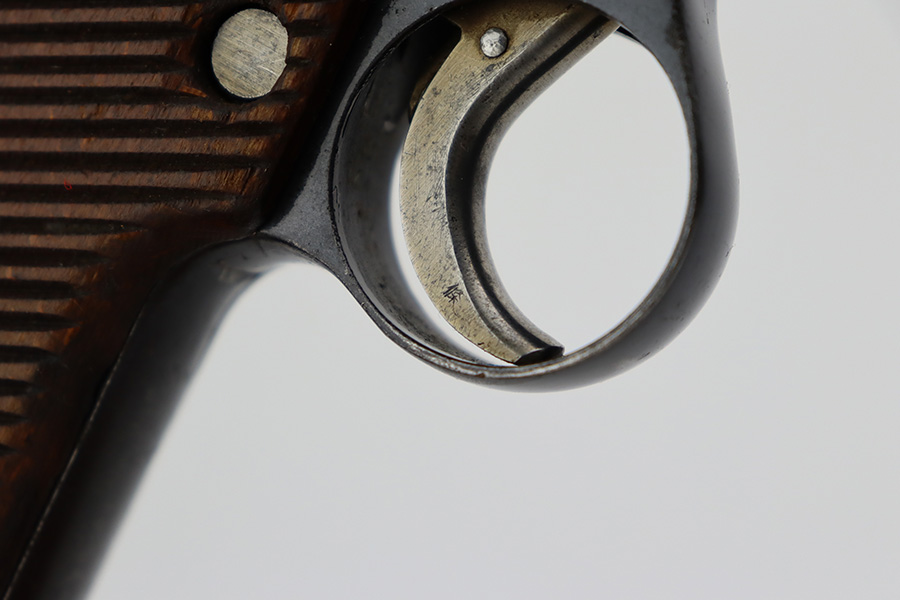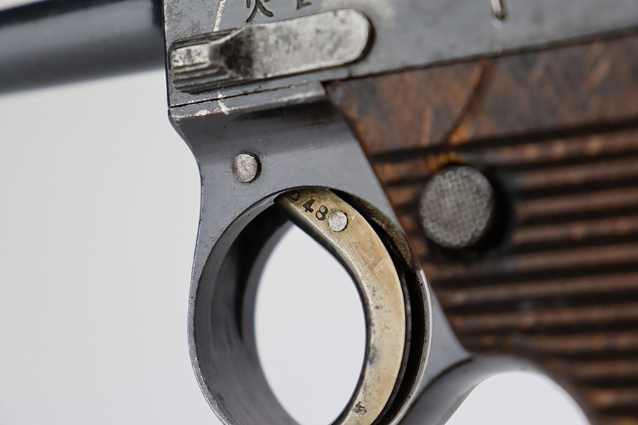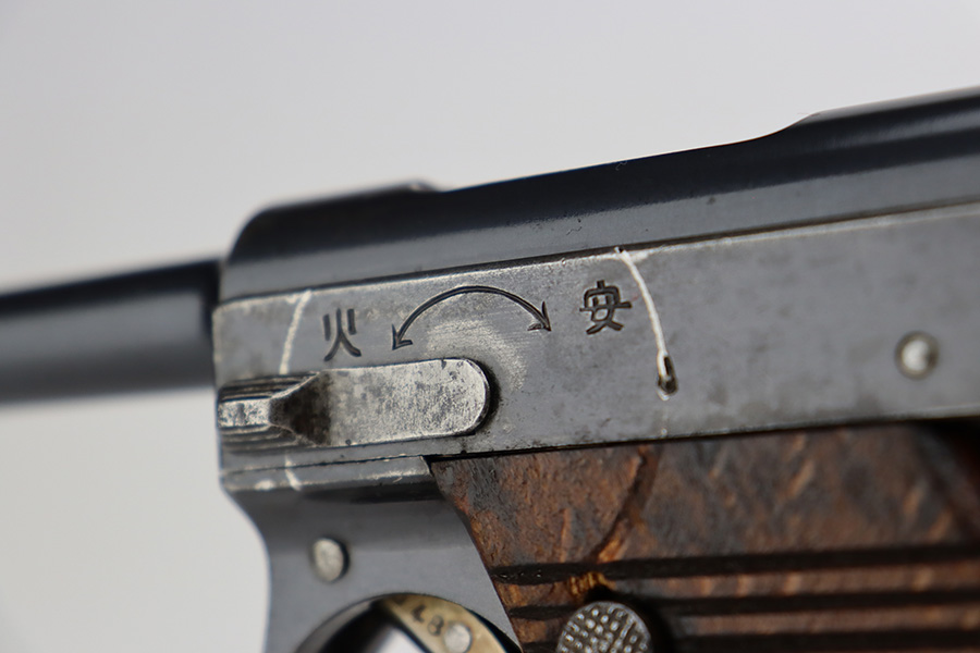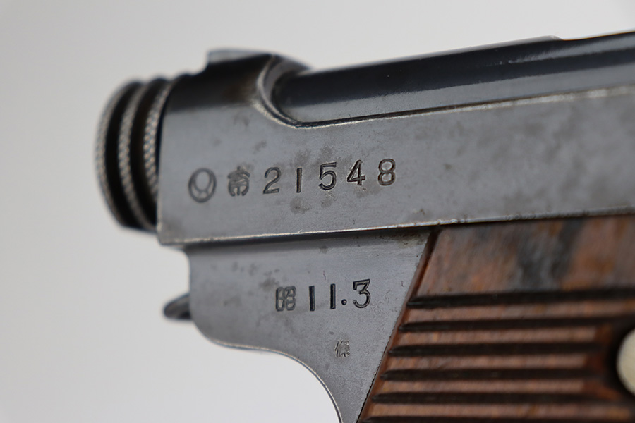 8/1/23 – This is a nice example of a Nambu Type 14 issued to the Japanese military in March of 1936. It is all matching and has retained about 90-92% of its original finish. Minor wear around the muzzle and on the high edges in general. A hint of thinning on the grip straps. Some light spotty oxidation here and there, and some noticeable pitting on the grip straps. Fitted with nice period-correct grips that are numbered but mismatched. Comes with a period-correct but mismatched magazine. The bore has decent rifling, but there is minor pitting throughout.